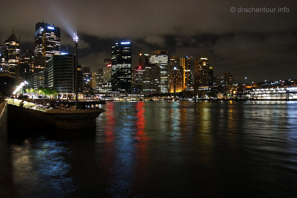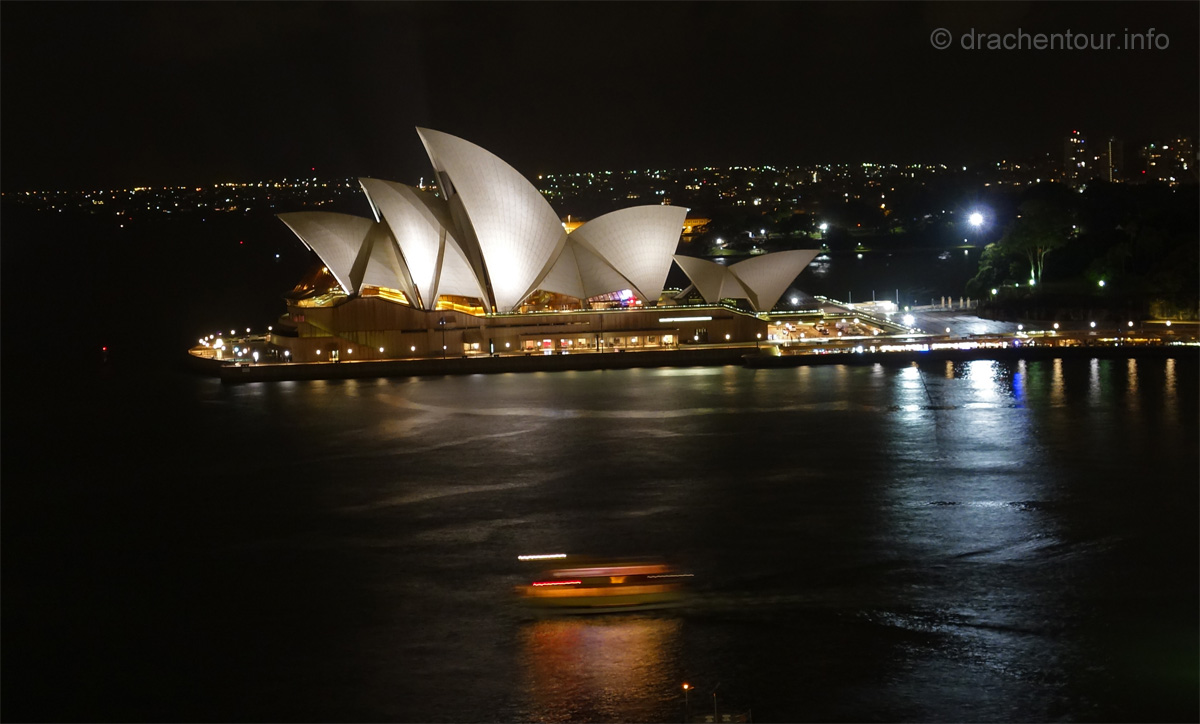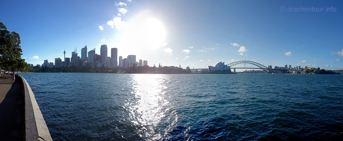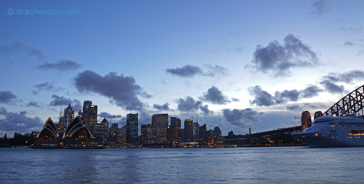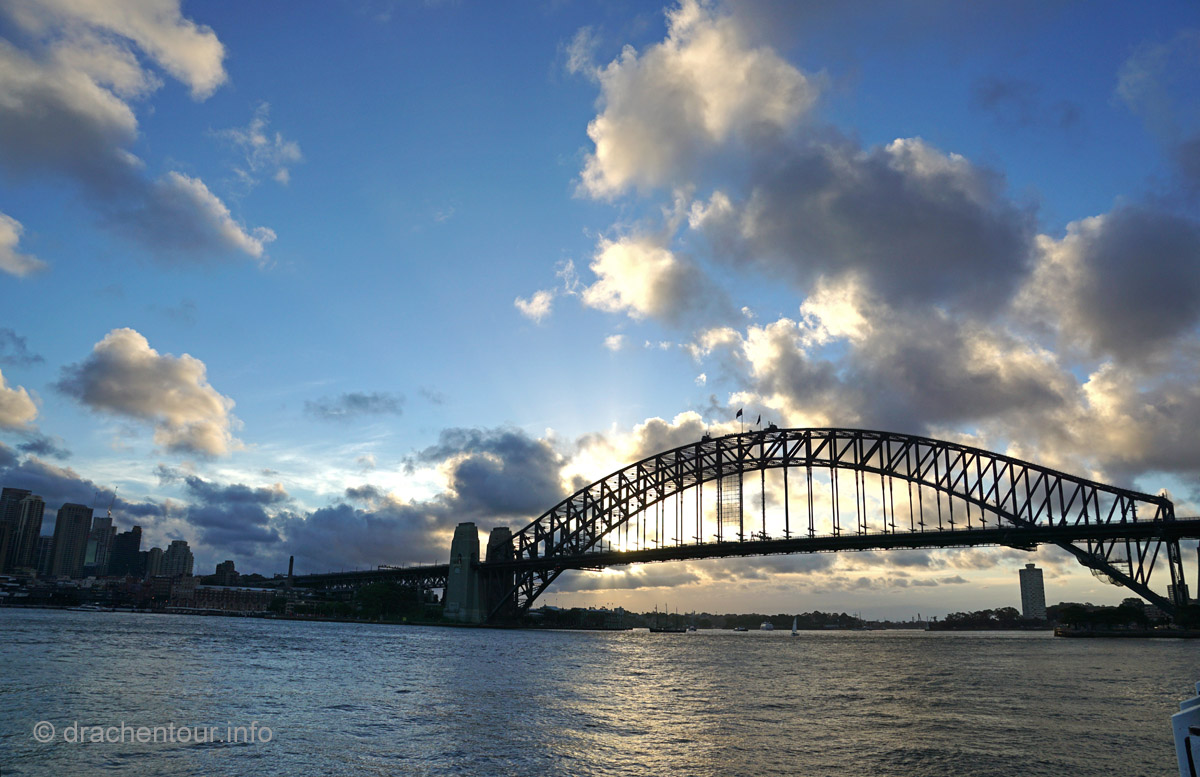 Beschwingt von den vielen tollen Erlebnissen des heutigen Tages liefen wir zurück zu unserer Lodge, um rechtzeitig zum Sonnenuntergang an der schönen Anlegestelle gegenüber des Opernhauses zu sein. Und das hat sich wahrlich gelohnt, denn der Anblick der Opera vor der Skyline von Sydney und der Harbour Bridge setzte dem ganzen Gesehenen noch die Krone auf :-). Wir waren bedient und unsere Synapsen mussten sich erstmal von diesem gigantischen Tag erholen.