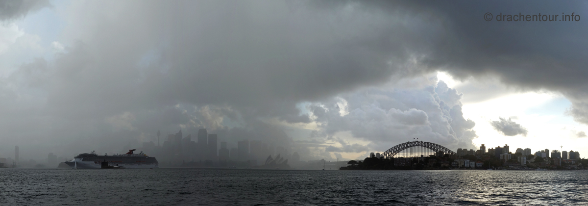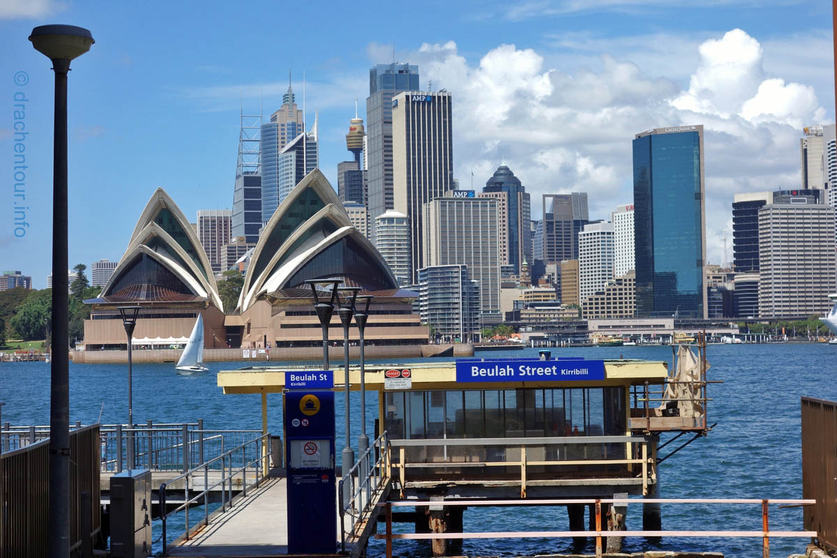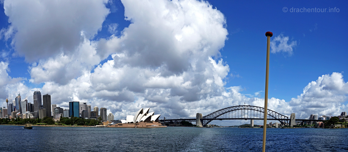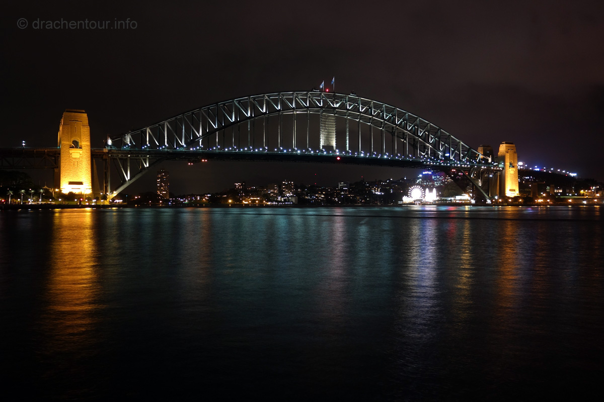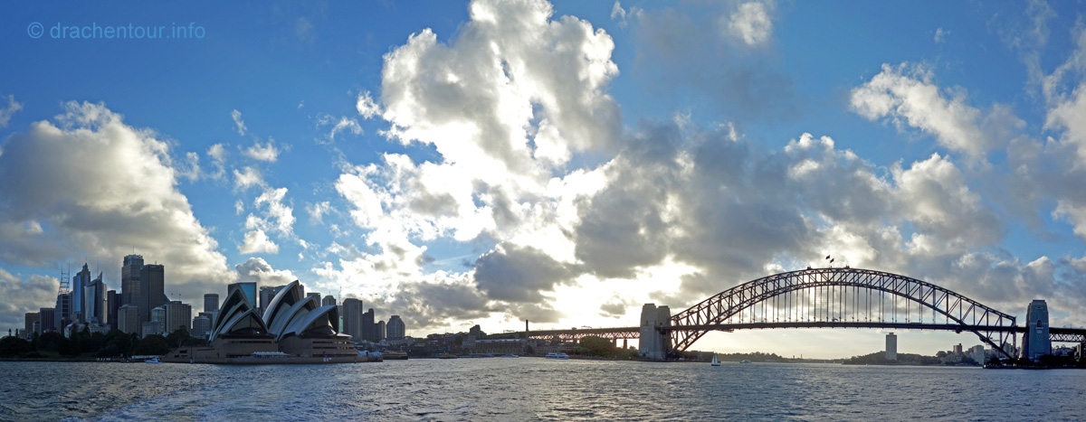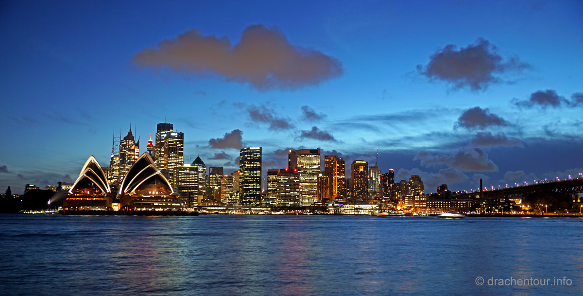 Beschwingt von den vielen tollen Erlebnissen des heutigen Tages liefen wir zurück zu unserer Lodge, um rechtzeitig zum Sonnenuntergang an der schönen Anlegestelle gegenüber des Opernhauses zu sein. Und das hat sich wahrlich gelohnt, denn der Anblick der Opera vor der Skyline von Sydney und der Harbour Bridge setzte dem ganzen Gesehenen noch die Krone auf :-). Wir waren bedient und unsere Synapsen mussten sich erstmal von diesem gigantischen Tag erholen.