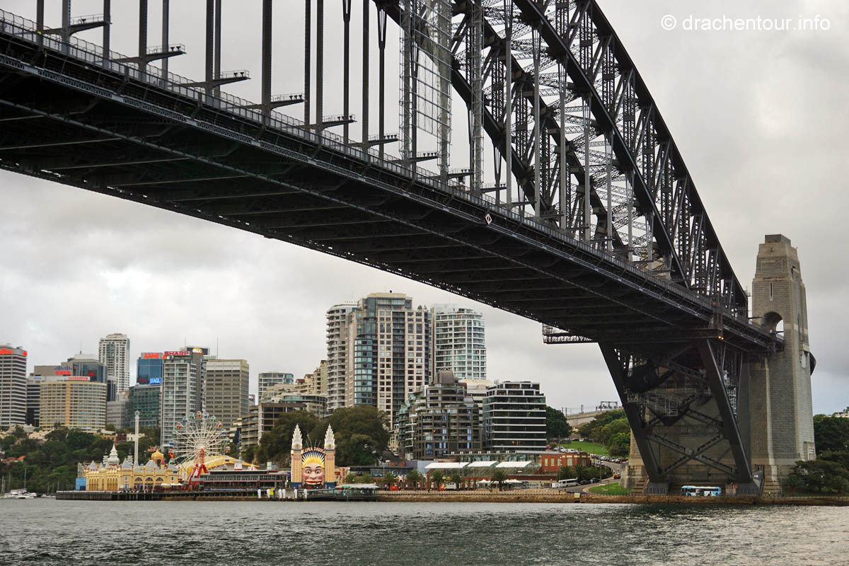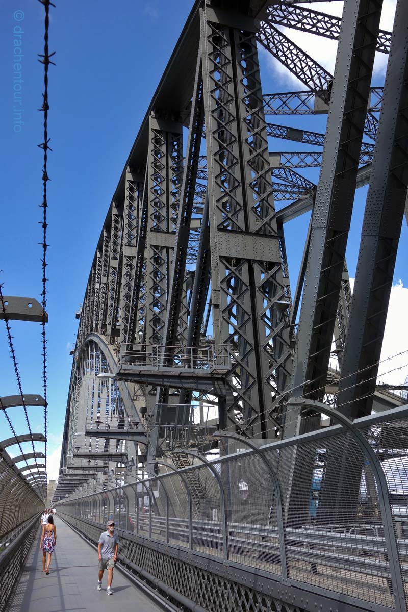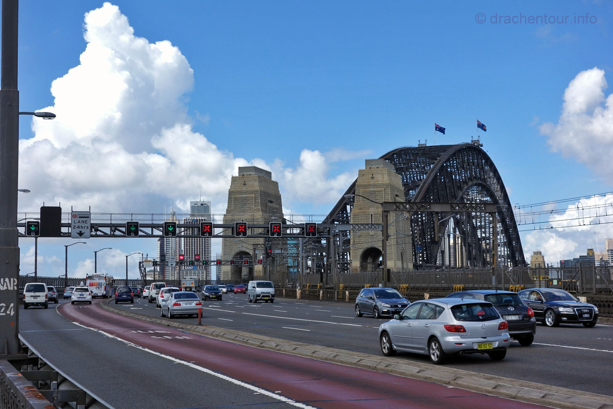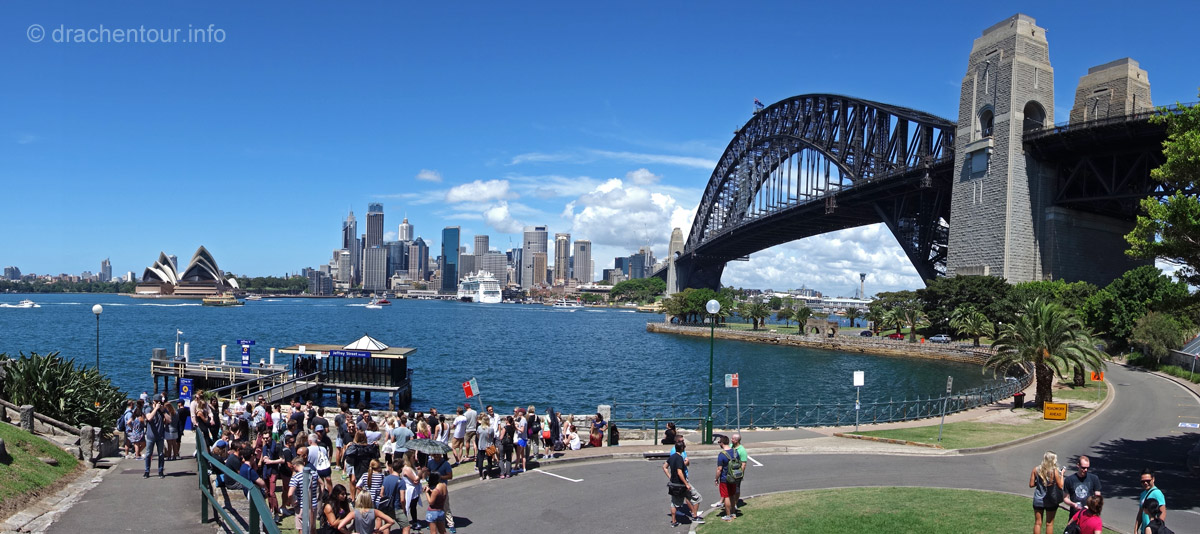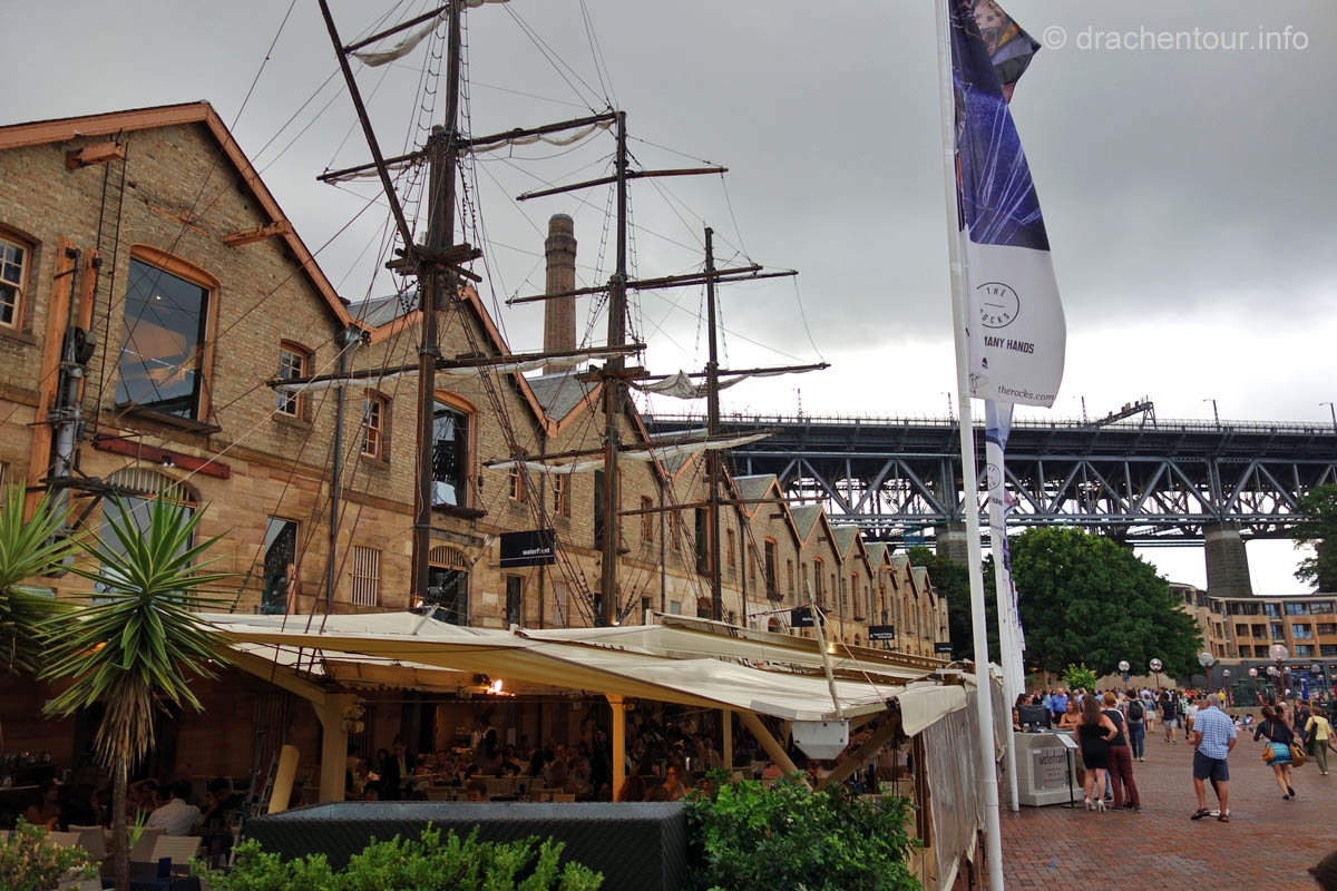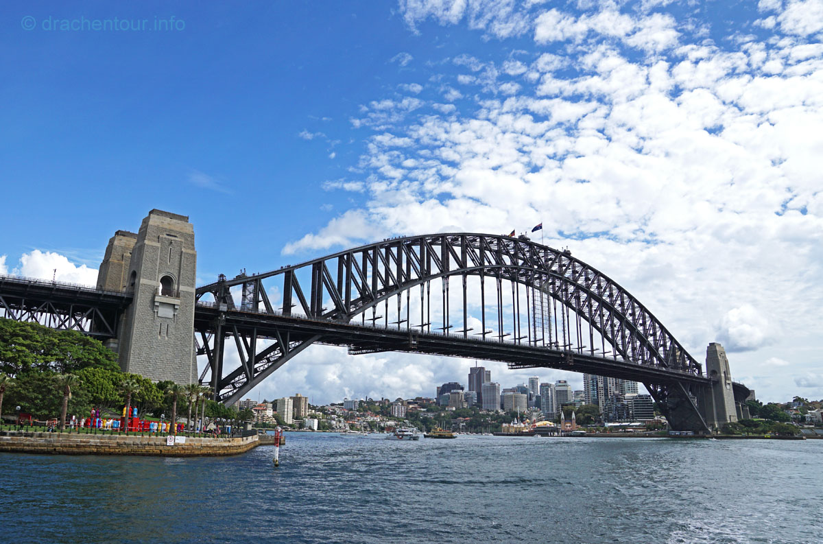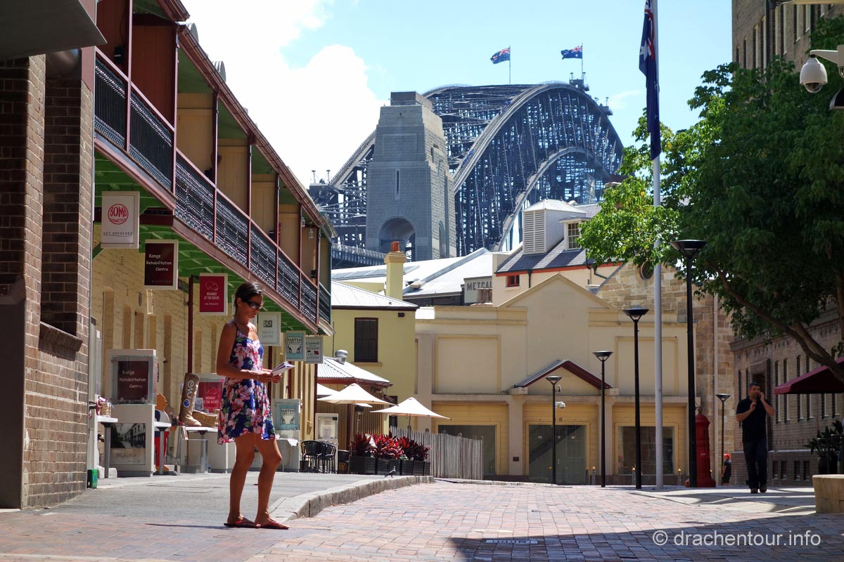 Gut gelaunt und bei strahlend blauem Himmel gingen wir von unserem Hotel zu Fuß los um die Stadt zu entdecken : „ it´s a good day to have a good day “ :-) ! Zielstrebig gingen wir in Richtung der bekanntesten Sehenswürdigkeiten, nämlich dem beeindruckenden Opernhaus und der mächtigen Harbour Bridge. Zunächst liefen wir durch die ruhigen Straßen des gemütlichen Vorortes Kirribilli, bevor wir dann ganz unerwartet einen ersten phänomenalen Blick auf diese beiden Top-Sehenswürdigkeiten hatten. Wir waren von dem Anblick komplett überrascht und überwältigt - wunderschön, grandios !!! Jetzt machten wir uns auf, die Harbour Bridge zu überqueren, sie ist ca. 1,2 km lang und es herrscht ein Wahnsinns Verkehr auf der Brücke, so dass der Spaziergang eigentlich kein richtiges Vergnügen war, wäre da nicht der spitzenmäßige Ausblick auf das Opernhaus - gigantisch, wir kennen diesen Anblick aus unzähligen Filmen und Dokus aus dem TV und jetzt sind wir live vor Ort, das ist sowas von toll ! Ständig müssen wir anhalten, um die Aussicht zu würdigen und natürlich um Fotos zu schießen, da vergisst man sogar den Abgasgeruch in der Nase ! Kaum waren wir auf der anderen Seite, d.h. im Hafen von Sydney, gelangten wir bereits zum nächsten Highlight, dem Stadtviertel " The Rocks ". Dies ist ein ehemaliges Sträflingsviertel und der Ursprung der Besiedlung Australiens. Heute ist das Hafenviertel ein Labyrinth aus Kopfstein gepflasterten Straßen, gespickt mit Sackgassen und schönen Sandsteinhäusern, in denen sich urige Kneipen, Galerien und Museen niedergelassen haben, dieses Viertel hat eine echt sehr schöne Atmosphäre.