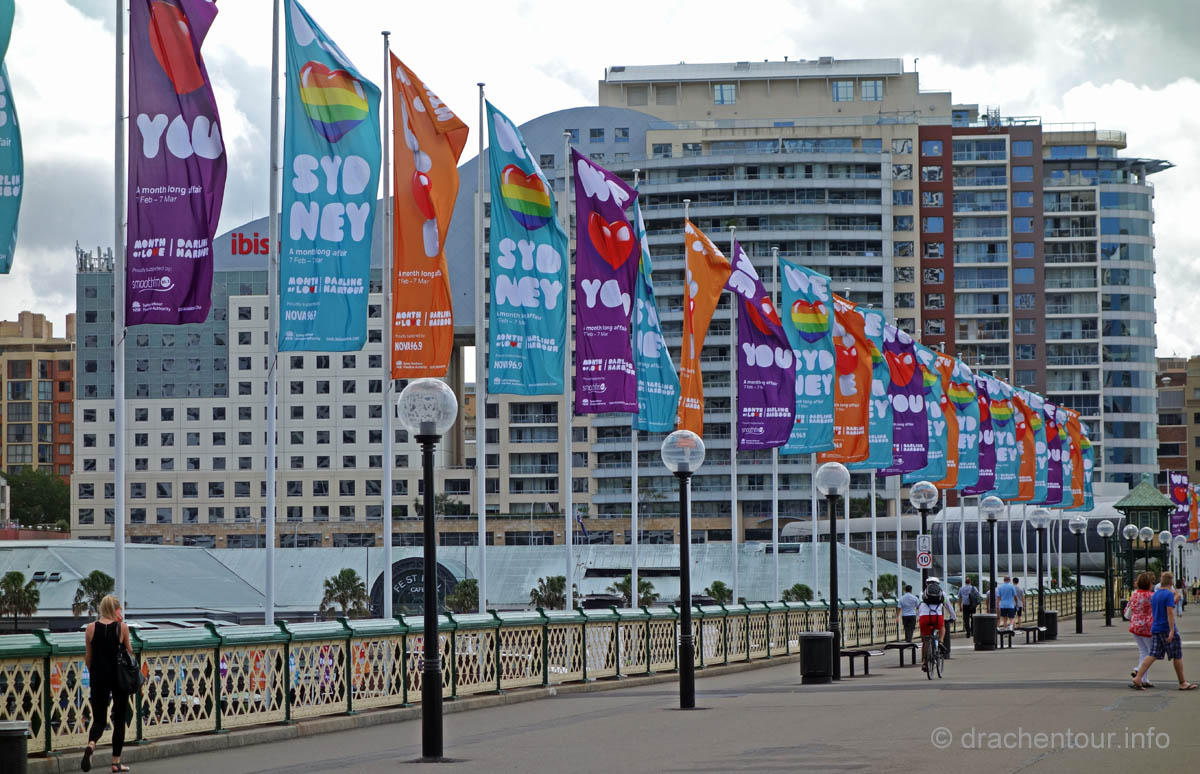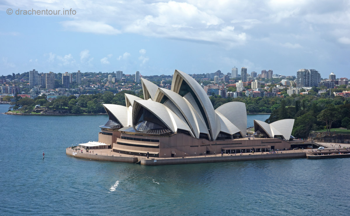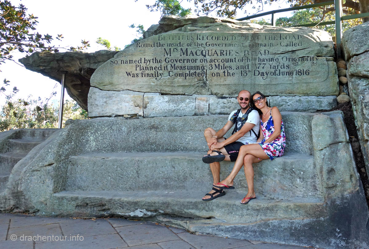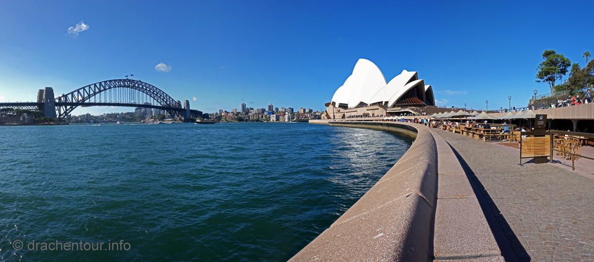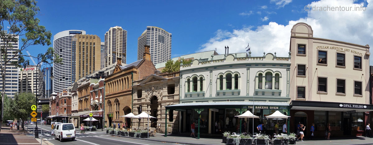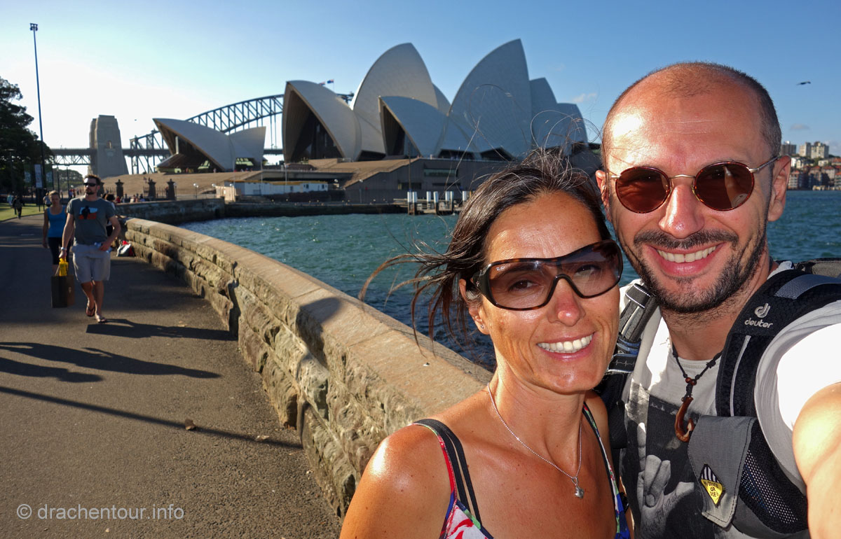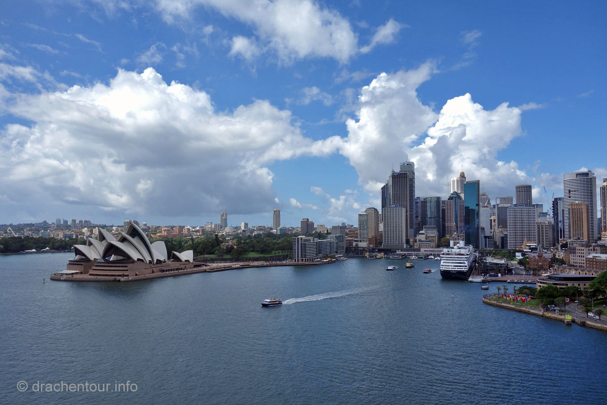 Gut gelaunt und bei strahlend blauem Himmel gingen wir von unserem Hotel zu Fuß los um die Stadt zu entdecken : „ it´s a good day to have a good day “ :-) ! Zielstrebig gingen wir in Richtung der bekanntesten Sehenswürdigkeiten, nämlich dem beeindruckenden Opernhaus und der mächtigen Harbour Bridge. Zunächst liefen wir durch die ruhigen Straßen des gemütlichen Vorortes Kirribilli, bevor wir dann ganz unerwartet einen ersten phänomenalen Blick auf diese beiden Top-Sehenswürdigkeiten hatten. Wir waren von dem Anblick komplett überrascht und überwältigt - wunderschön, grandios !!! Jetzt machten wir uns auf, die Harbour Bridge zu überqueren, sie ist ca. 1,2 km lang und es herrscht ein Wahnsinns Verkehr auf der Brücke, so dass der Spaziergang eigentlich kein richtiges Vergnügen war, wäre da nicht der spitzenmäßige Ausblick auf das Opernhaus - gigantisch, wir kennen diesen Anblick aus unzähligen Filmen und Dokus aus dem TV und jetzt sind wir live vor Ort, das ist sowas von toll ! Ständig müssen wir anhalten, um die Aussicht zu würdigen und natürlich um Fotos zu schießen, da vergisst man sogar den Abgasgeruch in der Nase ! Kaum waren wir auf der anderen Seite, d.h. im Hafen von Sydney, gelangten wir bereits zum nächsten Highlight, dem Stadtviertel " The Rocks ". Dies ist ein ehemaliges Sträflingsviertel und der Ursprung der Besiedlung Australiens. Heute ist das Hafenviertel ein Labyrinth aus Kopfstein gepflasterten Straßen, gespickt mit Sackgassen und schönen Sandsteinhäusern, in denen sich urige Kneipen, Galerien und Museen niedergelassen haben, dieses Viertel hat eine echt sehr schöne Atmosphäre.