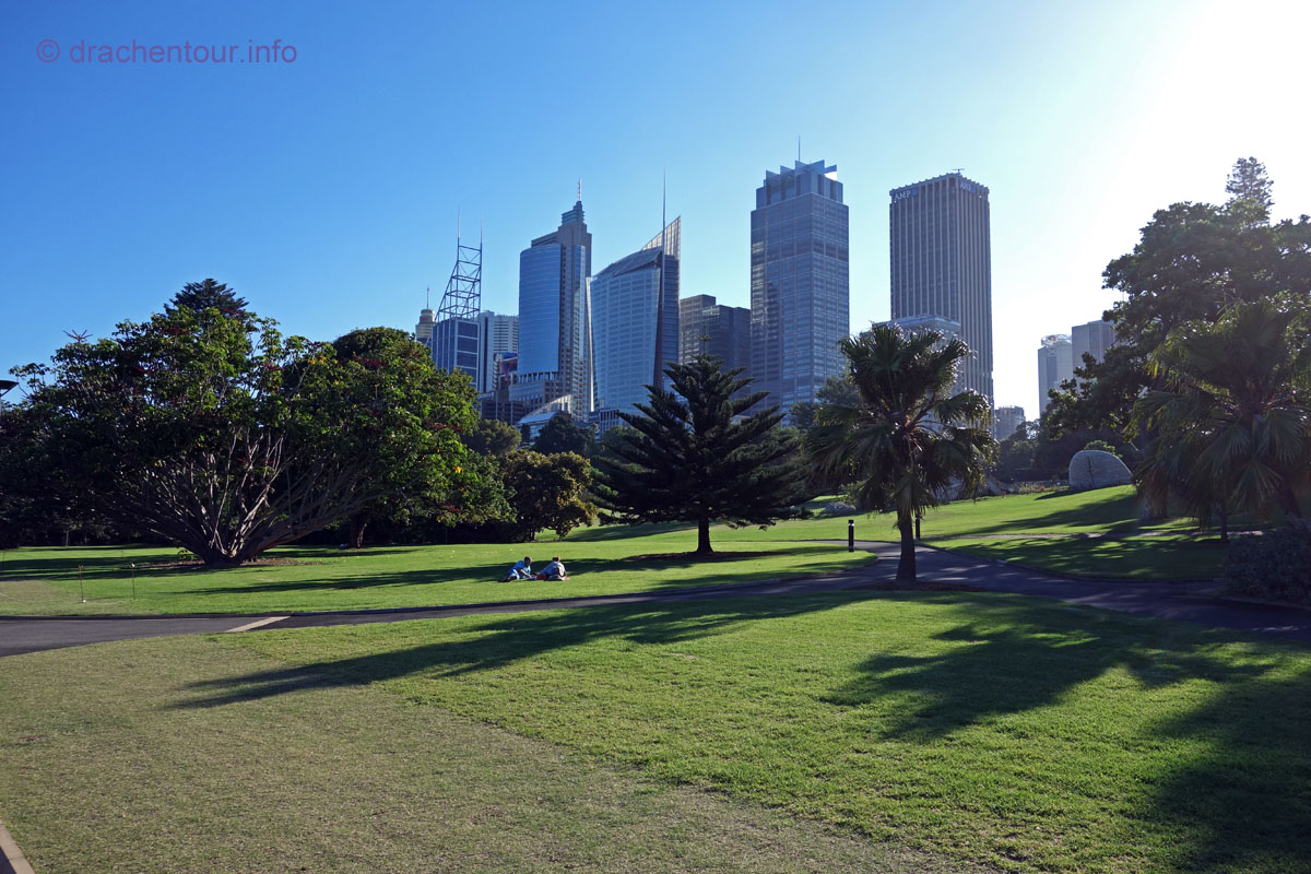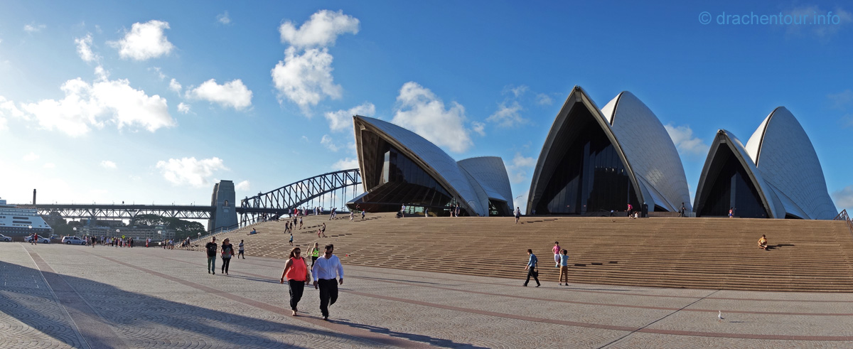 Total aus dem Häuschen vor Freude bummelten wir gemütlich zurück zum Circular Quai und schnupperten die Atmosphäre der Weltstadt ein und hielten einige stimmungsvolle Motive fest. Besonders ins Schwärmen geraten sind wir, bei dem Anblick des luxuriösen Queen Victoria Buildings, indem sehr exquisite Läden und erlesene kulinarische Leckereien zu finden sind. Zum Abschluss mussten wir heute natürlich noch das Opernhaus aus der Nähe betrachten, so spazierten wir die George Street zurück, schnappten noch einen Cappuccino und erreichten das weltbekannte sehr eindrucksvolle Gebäude am späten Nachmittag. Fasziniert standen wir vor diesen Kulissen und kamen aus dem Staunen gar nicht mehr heraus, konnten uns nicht satt sehen und wir mussten unzählig viel Fotos schießen - dasselbe passierte uns auch übrigens beim Anblick der Harbour Bridge, das werdet ihr in den folgenden Fotoserien sicherlich auch feststellen :-) ! Nachdem wir uns wieder gefangen und beruhigt hatten, spazierten wir in den anschließenden Royal Botanic Garden, der wunderschön angelegt und sehr erholsam ist. Vom Ende des Weges bei der Bank von „Mrs. Macquaries“ eröffnete sich uns nochmals ein spektakulärer Anblick auf den Hafen und ein etwas anderer Blick auf die Oper.