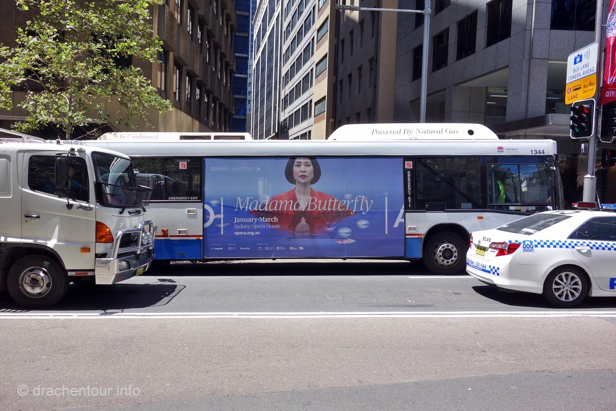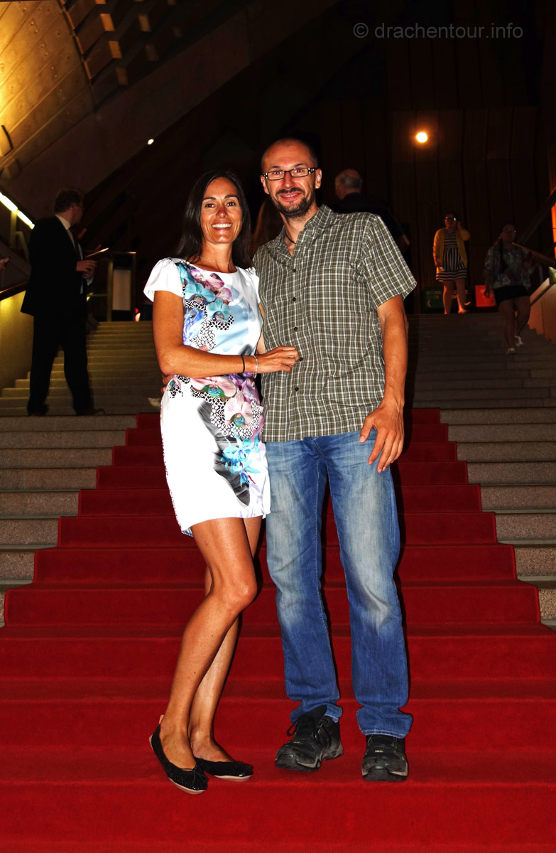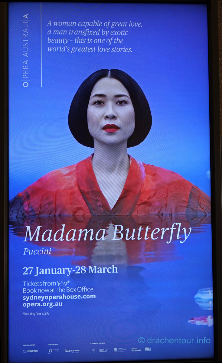 Heute Morgen stand ich bereits recht früh auf, denn ich hatte mir etwas Besonderes vorgenommen: ich wollte über die Harbour Bridge, via Opernhaus zum Royal Botanic Garden joggen. Gesagt, getan und los ging´s, das war echt ein tolles, wenn auch sehr schweißtreibendes Erlebnis und ich bin froh, dass ich meinen inneren Schweinehund überwunden habe und aus dem kuscheligen Bett so früh raus kam:-). Nach einem ausgiebigen Frühstück gingen wir wieder in die Stadt, dieses Mal wollten wir uns die Flaniermeile Darling Harbour mal etwas genauer unter die Lupe nehmen, diese Gegend hat uns allerdings nicht wirklich überzeugt, es war eher unschön gestaltet und versprühte keinen Flair. So stand nur noch Shopping auf dem Programm, denn schließlich brauchte ich für den heutigen Abend noch ein passendes Outfit. Glücklicherweise wurden wir recht schnell fündig und so fuhren wir wieder zurück zu unserer Lodge, um uns für den Abend zu stylen. Denn wir hatten etwas ganz besonderes vor: wir gingen nämlich zu einer Vorstellung in die Oper - jawohl, das ist super und wir freuten uns sehr darauf. Das Stück, welches heute gespielt wurde, ist kein geringeres als "Madame Butterfly", dasselbe Stück, das wir gerne in Buenos Aires gesehen hätten - doppelte Freude ! Schön angezogen machten wir uns happy auf den Weg und genossen die sehr weltoffene Atmosphäre in dem Gebäude bevor es losging. Die Handlung und die Umsetzung hatte uns beiden sehr gut gefallen und wir waren sehr beeindruckt von diesem Stück ! Haben wir da doch tatsächlich unsere Liebe zu Opern entdeckt; zumindest habe ich weitere Ideen für unser nächstes Schulmusical gesammelt. Ein super gelungener Abend, der sicherlich immer einen ganz besonderen Platz in unserem Herzen haben wird :-) !