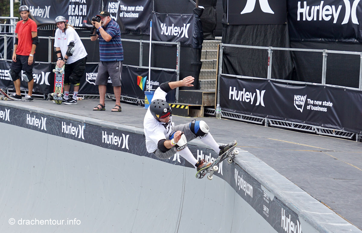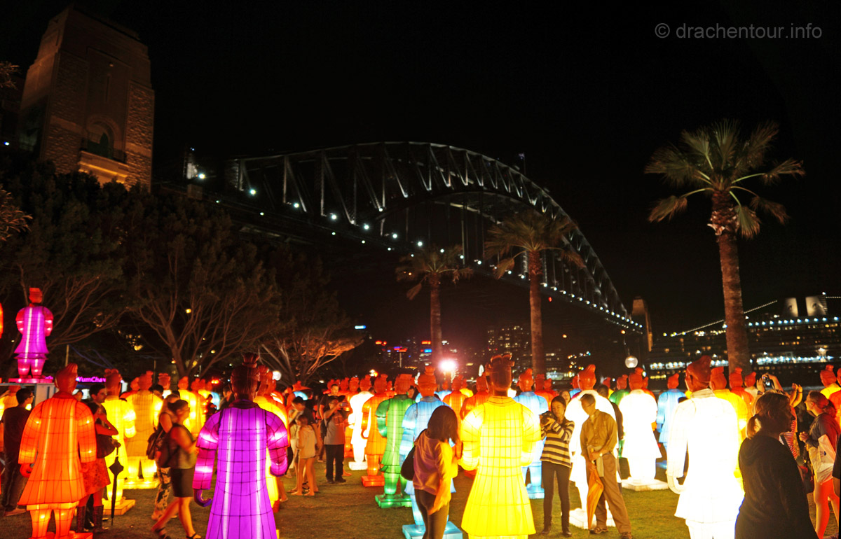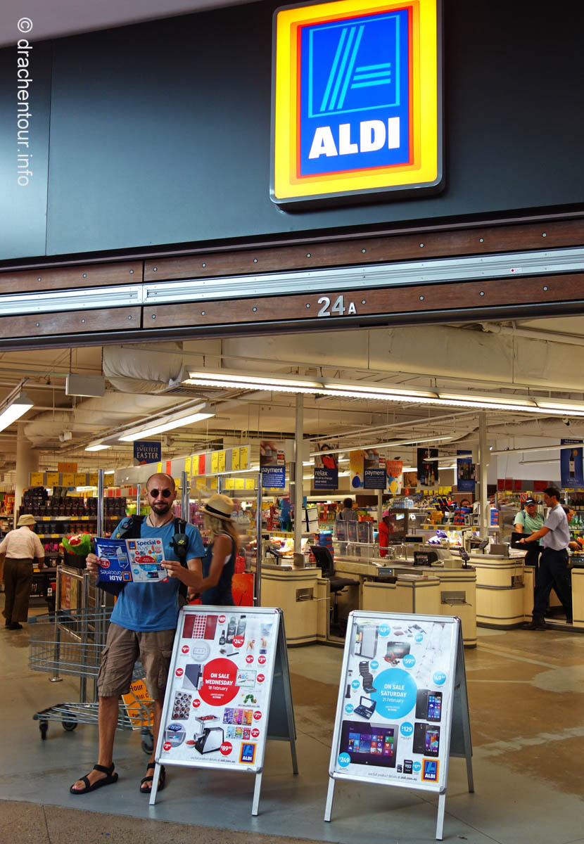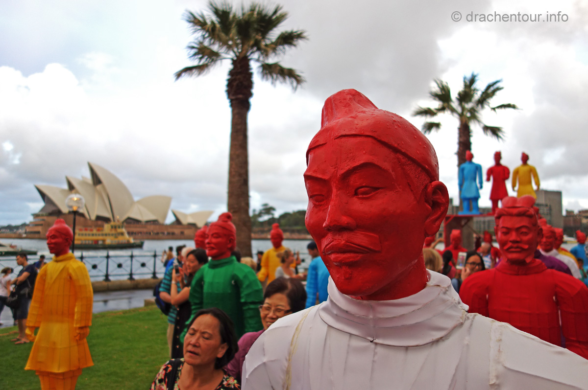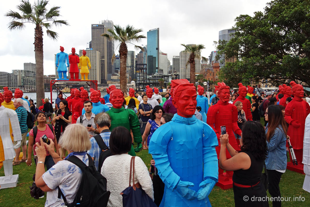 Nach so viel Stadt mussten wir mal unbedingt wieder etwas raus in die Natur, so fuhren wir mit der Fähre in das gemütliche Manly. Die Surfer-Szene macht diesen Strandabschnitt besonders attraktiv, vor allem in dieser Woche, denn es finden die „Australien Open of Surfing“ statt. Zur richtigen Zeit am richtigen Ort :-). Fast den ganzen Tag verbrachten wir dort und bewunderten die Surfer, wie leicht und akrobatisch sie über die Wellen glitten. Parallel hierzu fand auch eine Skateboard Meisterschaft statt und wir konnten die Durchgänge der über 40ig jährigen beobachten, schon gut, was die älteren Herrschaften sich in der Halfpipe noch zutrauen und können. Marek, begeistert von Sportfotografie, tobte sich im wahrsten Sinne des Wortes fotografisch bis zur Erschöpfung aus und hatte eine Mega-Freude, wenn ihm auch das passende Objektiv fehlte, denn dieses war in Freiburg. Auf dem Heimweg kamen wir doch tatsächlich an einem Aldi vorbei, das fanden wir voll lustig und mussten es natürlich auch festhalten und es gab sogar die lecker Moser Schocki – yammi ! Pünktlich am Abend um 19:30 Uhr waren wir dann am Fuße der Harbour Bridge, denn genau heute begannen die Feierlichkeiten zu Ehren des Chinesischen Neuen Jahres. Hierfür hatte man illuminierte Terrakotta Krieger aufgestellt und wichtige Menschen der Regierung Australiens, sowie chinesische VIPs hielten eine Ansprache, Drachen tanzten und als die Sonne hinter dem Horizont verschwand, begrüßten die Chinesen mit lauter Musik und Böllern das neue Jahr der Ziege. Und als krönender Abschluss wurden die Terrakotta Krieger beleuchtet, das war echt ein gelungene Aktion und ein toller Anblick – super !