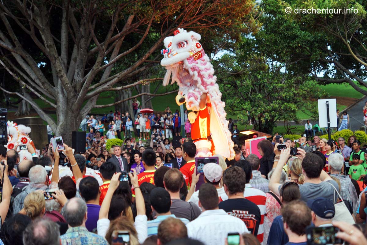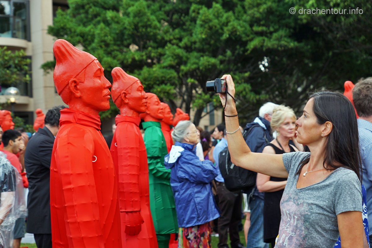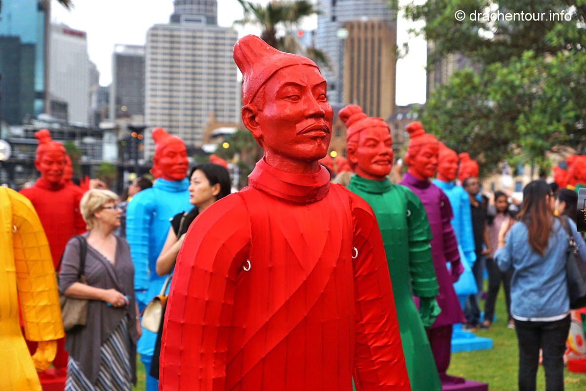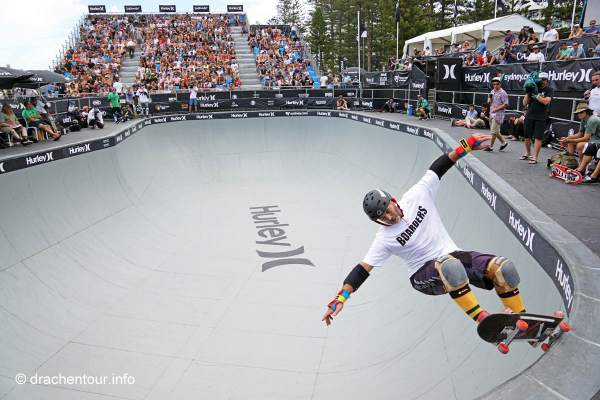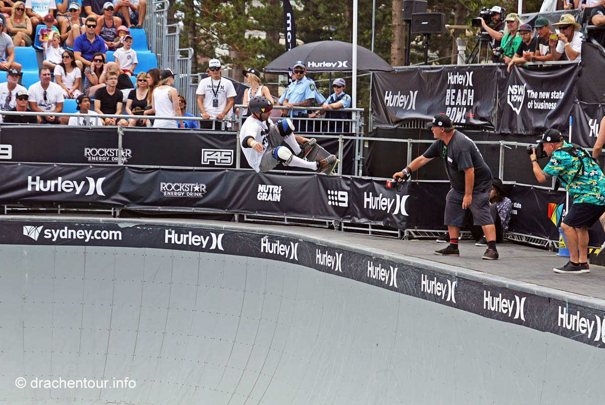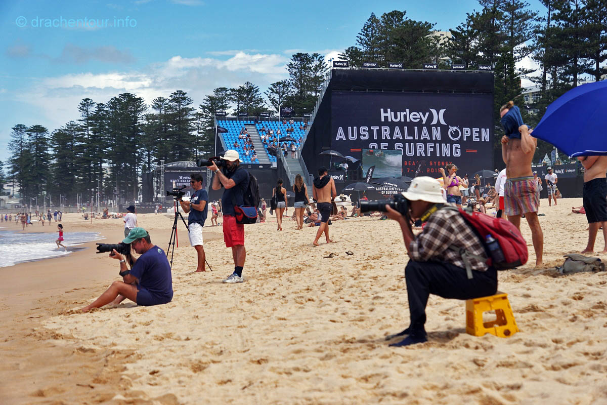 Nach so viel Stadt mussten wir mal unbedingt wieder etwas raus in die Natur, so fuhren wir mit der Fähre in das gemütliche Manly. Die Surfer-Szene macht diesen Strandabschnitt besonders attraktiv, vor allem in dieser Woche, denn es finden die „Australien Open of Surfing“ statt. Zur richtigen Zeit am richtigen Ort :-). Fast den ganzen Tag verbrachten wir dort und bewunderten die Surfer, wie leicht und akrobatisch sie über die Wellen glitten. Parallel hierzu fand auch eine Skateboard Meisterschaft statt und wir konnten die Durchgänge der über 40ig jährigen beobachten, schon gut, was die älteren Herrschaften sich in der Halfpipe noch zutrauen und können. Marek, begeistert von Sportfotografie, tobte sich im wahrsten Sinne des Wortes fotografisch bis zur Erschöpfung aus und hatte eine Mega-Freude, wenn ihm auch das passende Objektiv fehlte, denn dieses war in Freiburg. Auf dem Heimweg kamen wir doch tatsächlich an einem Aldi vorbei, das fanden wir voll lustig und mussten es natürlich auch festhalten und es gab sogar die lecker Moser Schocki – yammi ! Pünktlich am Abend um 19:30 Uhr waren wir dann am Fuße der Harbour Bridge, denn genau heute begannen die Feierlichkeiten zu Ehren des Chinesischen Neuen Jahres. Hierfür hatte man illuminierte Terrakotta Krieger aufgestellt und wichtige Menschen der Regierung Australiens, sowie chinesische VIPs hielten eine Ansprache, Drachen tanzten und als die Sonne hinter dem Horizont verschwand, begrüßten die Chinesen mit lauter Musik und Böllern das neue Jahr der Ziege. Und als krönender Abschluss wurden die Terrakotta Krieger beleuchtet, das war echt ein gelungene Aktion und ein toller Anblick – super !