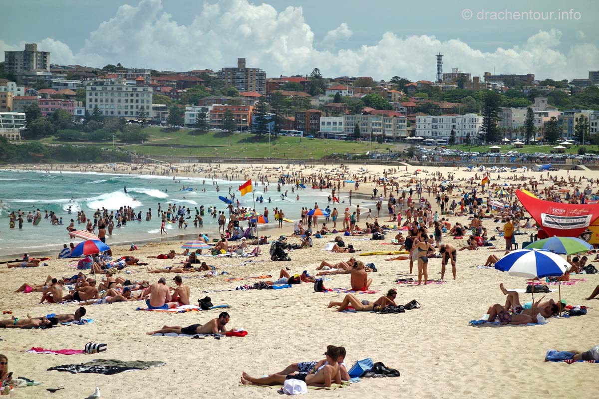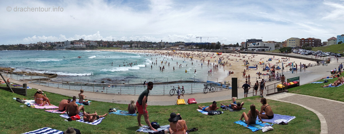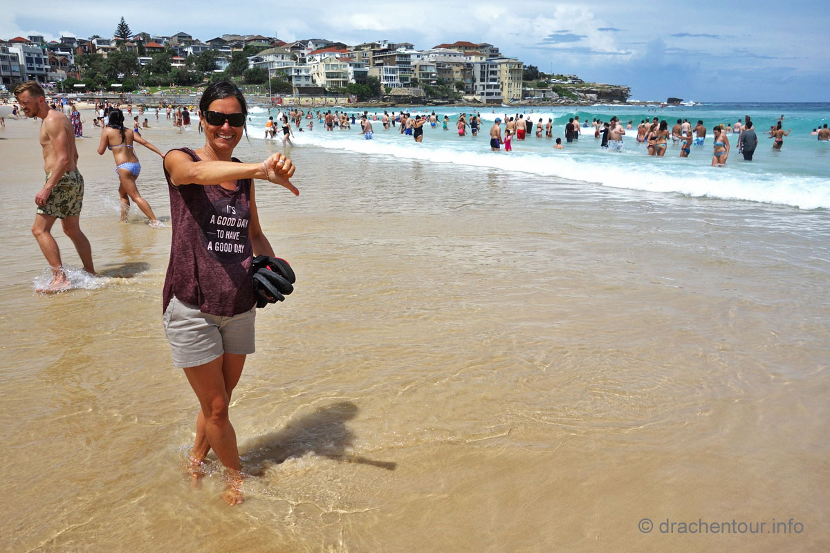 Was wäre Sydney ohne seinen berühmten Strand Bondi, klar, da mussten wir auch noch hin, also schnappten wir uns einen Bus, der uns direkt zum Strand brachte. Und in der Tat hat der Strand sein Prädikat "schönster Strand Australiens" verdient, allerdings ist er so bekannt, dass es auch unwahrscheinlich viele Menschen an diesen Abschnitt zieht. Uns war alles viel zu voll und so lud er uns nicht wirklich zum Verweilen ein und auch auf den Bondi-Coggee-Walk, einer der schönsten Küstenwanderungen Sydneys, den wir eigentlich machen wollten, hatten wir nicht so richtig Lust. So machten wir uns langsam auf den Heimweg und genossen noch die kosmopolitische Atmosphäre am Circular Quai bevor wir zurück zu unserer Lodge fuhren.