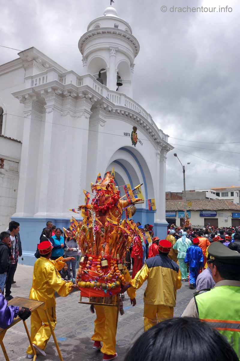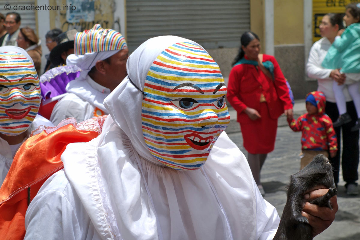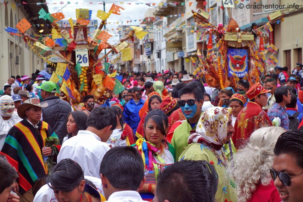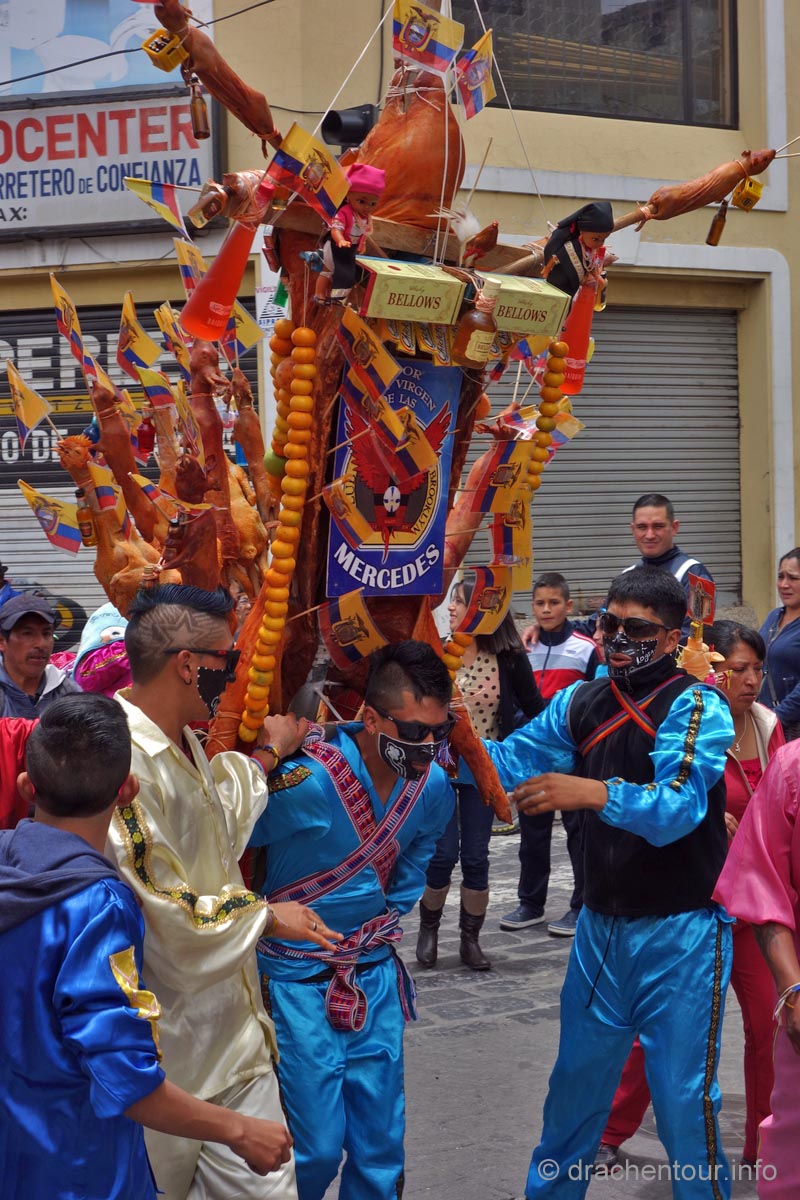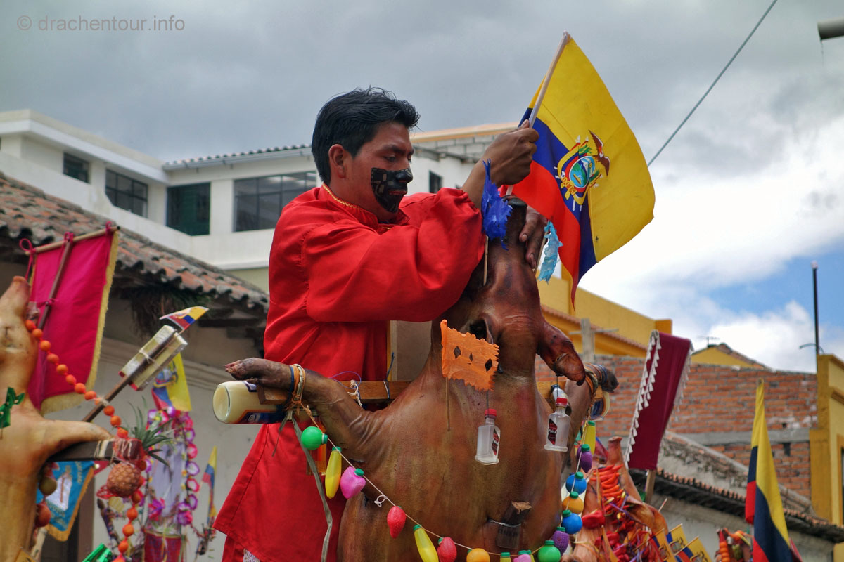 Diese Festlichkeiten werden zu Ehren der "lady of mercy" gehalten. Es herrschte zwei Tage kompletter Ausnahmezustand in den Straßen der Altstadt und das Treiben erinnert mich sehr an Fasnacht, allerdings von allem mehr ! Hunderte von Menschen in bunten Trachten tanzten zur gewöhnungsbedürftigen Musik durch die Straßen und viele weitere bestimmte Figuren, mit phantasievollen Masken hüpften durch die Gegend. Aber die Schweine stahlen allen die Show: mehr als 30 gekreuzigte Schweine, Meerschweinchen und Hühner, dekoriert mit Rumflaschen, Zigaretten und der ecuadorianischen Flagge, wurden von Jung und Alt durch die Stadt getragen – Wahnsinn !
