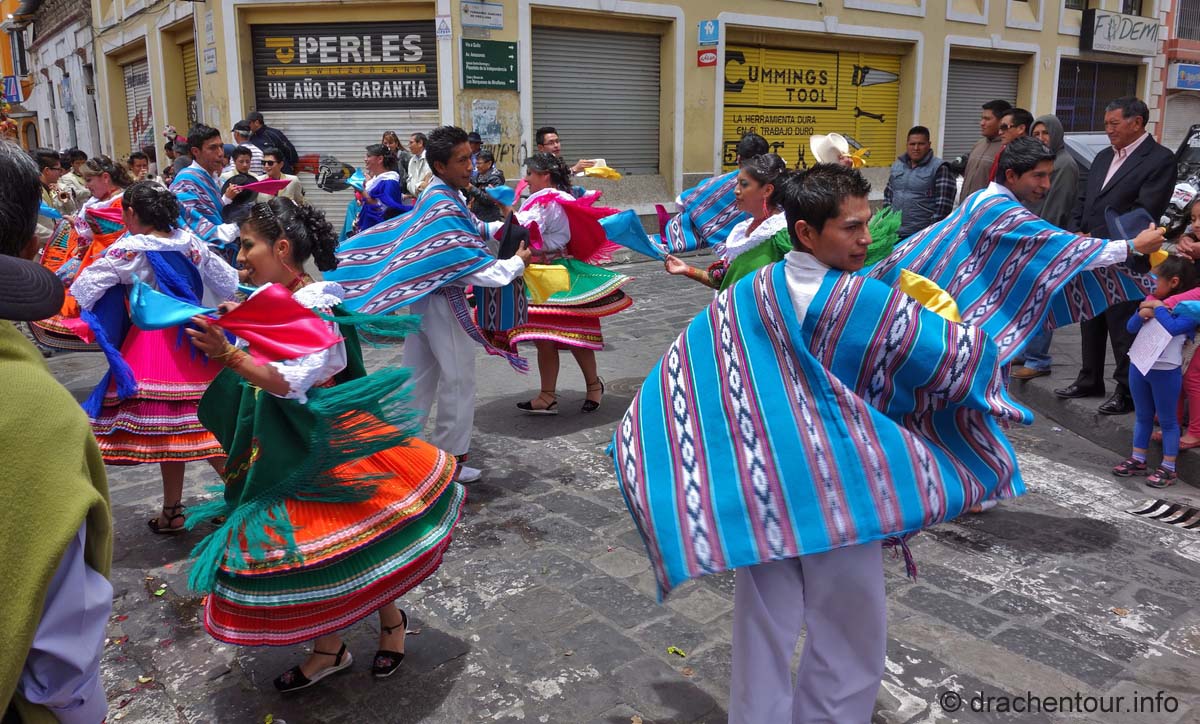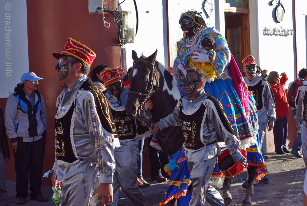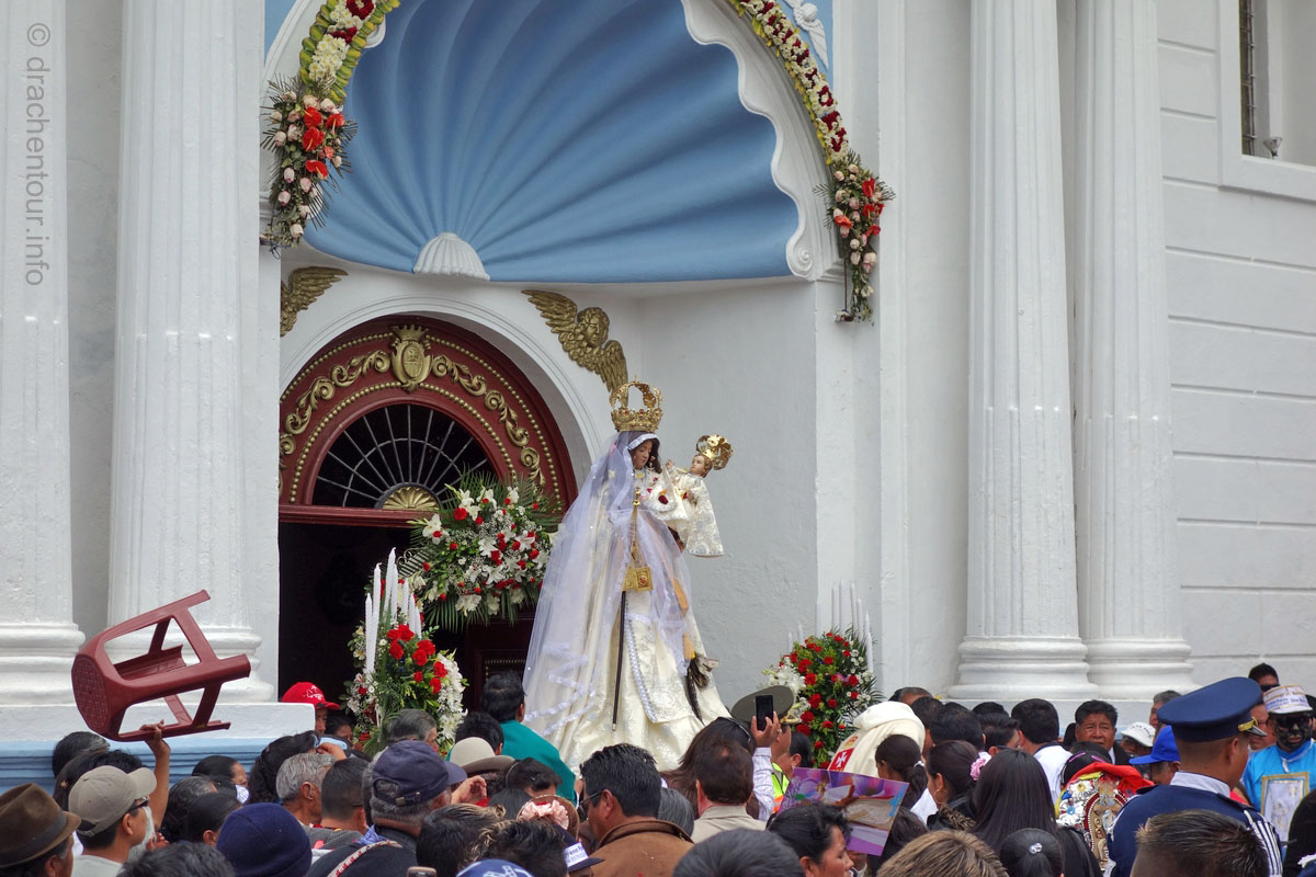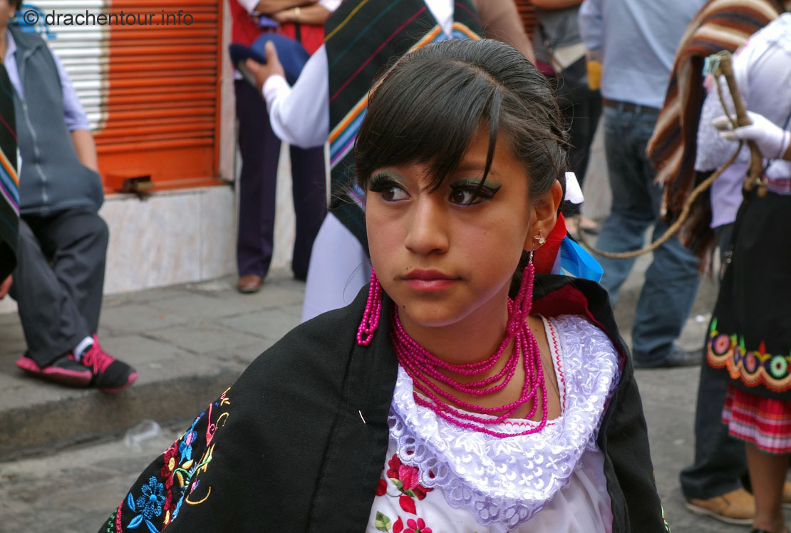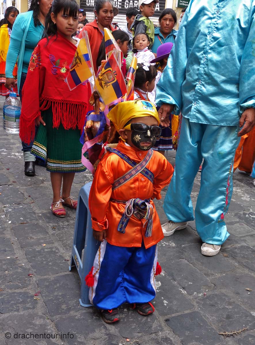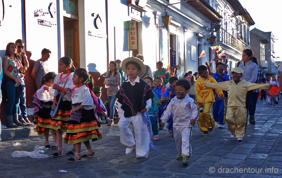 Diese Festlichkeiten werden zu Ehren der "lady of mercy" gehalten. Es herrschte zwei Tage kompletter Ausnahmezustand in den Straßen der Altstadt und das Treiben erinnert mich sehr an Fasnacht, allerdings von allem mehr ! Hunderte von Menschen in bunten Trachten tanzten zur gewöhnungsbedürftigen Musik durch die Straßen und viele weitere bestimmte Figuren, mit phantasievollen Masken hüpften durch die Gegend. Aber die Schweine stahlen allen die Show: mehr als 30 gekreuzigte Schweine, Meerschweinchen und Hühner, dekoriert mit Rumflaschen, Zigaretten und der ecuadorianischen Flagge, wurden von Jung und Alt durch die Stadt getragen – Wahnsinn !