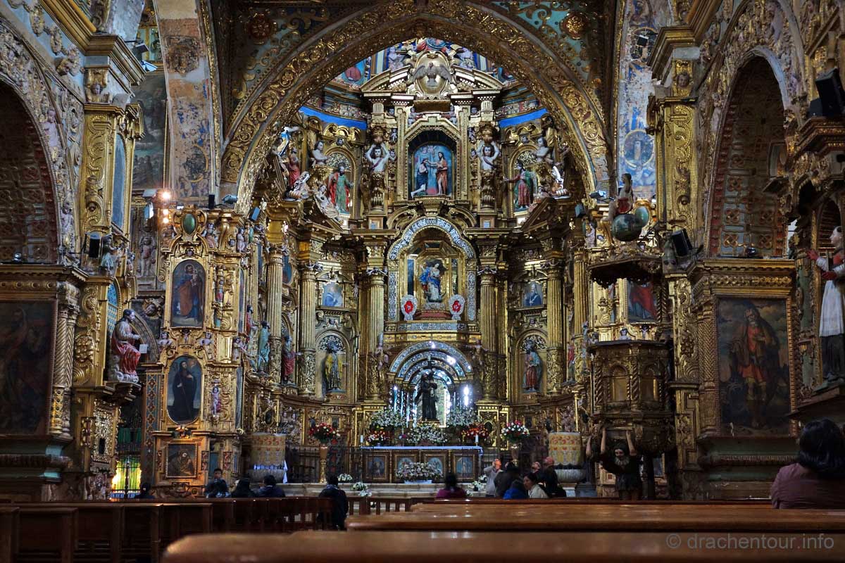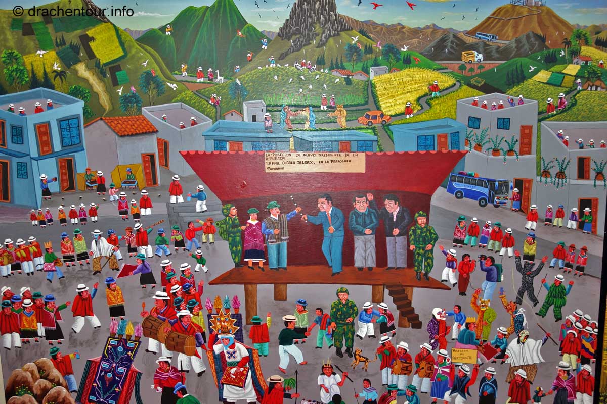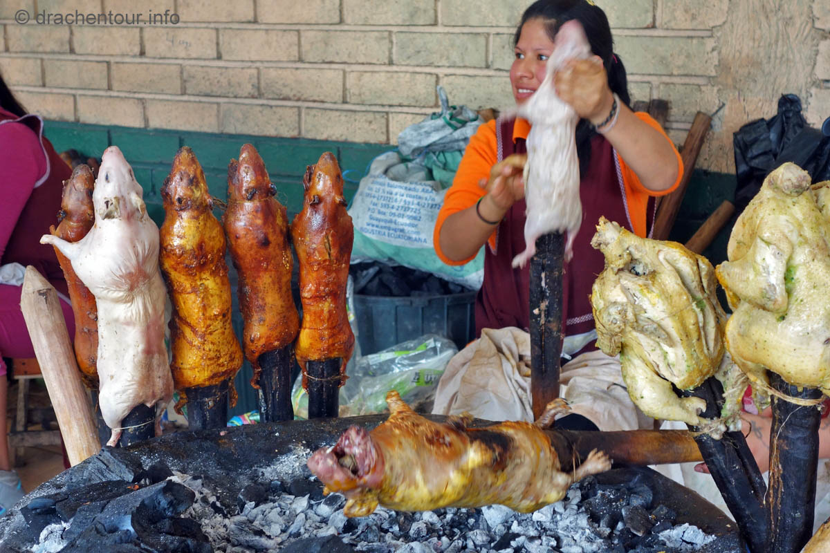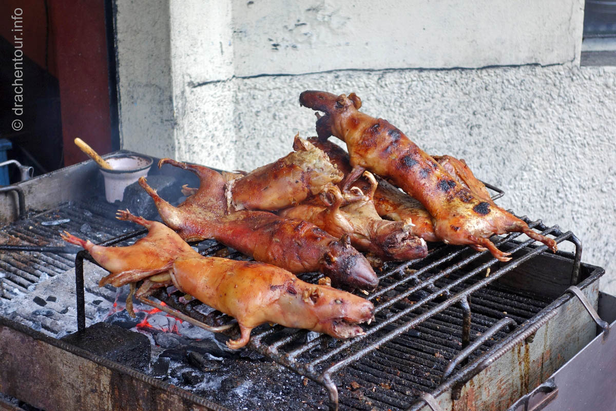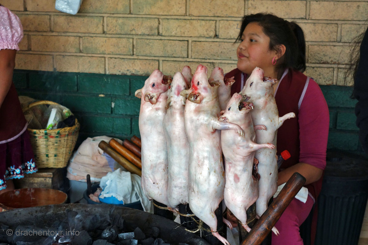Diese Festlichkeiten werden zu Ehren der "lady of mercy" gehalten. Es herrschte zwei Tage kompletter Ausnahmezustand in den Straßen der Altstadt und das Treiben erinnert mich sehr an Fasnacht, allerdings von allem mehr ! Hunderte von Menschen in bunten Trachten tanzten zur gewöhnungsbedürftigen Musik durch die Straßen und viele weitere bestimmte Figuren, mit phantasievollen Masken hüpften durch die Gegend. Aber die Schweine stahlen allen die Show: mehr als 30 gekreuzigte Schweine, Meerschweinchen und Hühner, dekoriert mit Rumflaschen, Zigaretten und der ecuadorianischen Flagge, wurden von Jung und Alt durch die Stadt getragen – Wahnsinn !