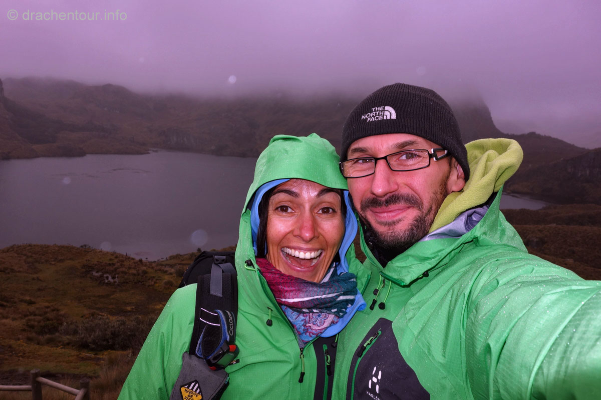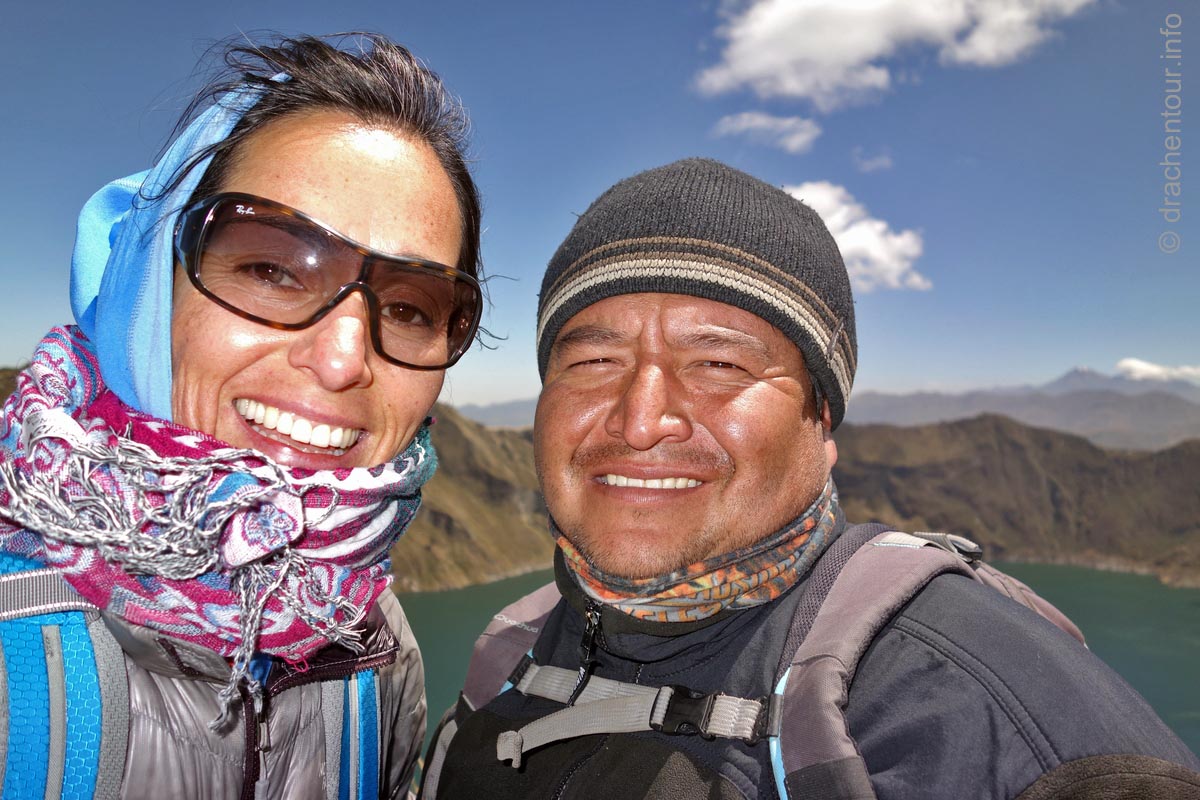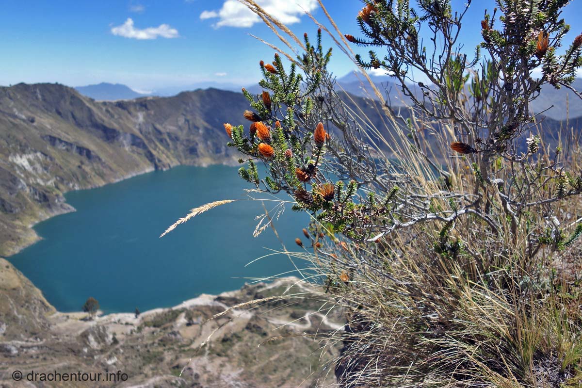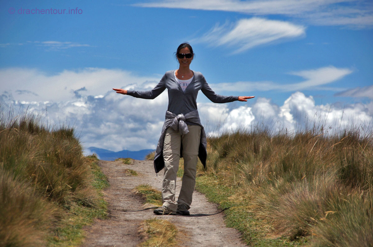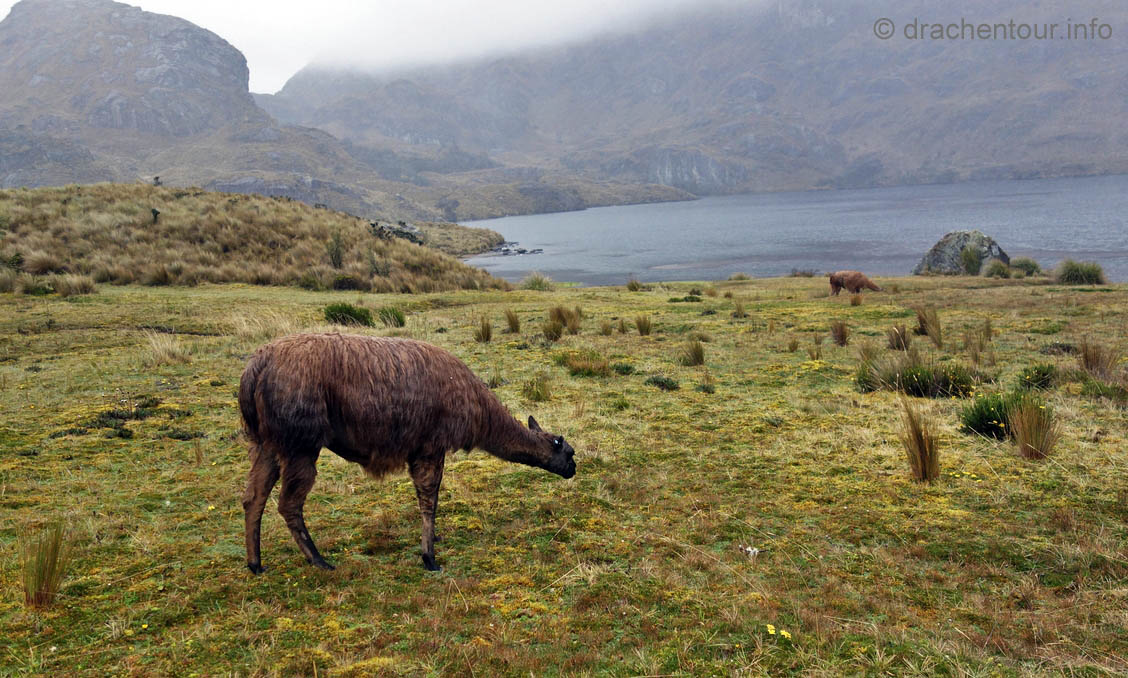Die Fahrt führte durch trockenes und karges Hochland auf fast 4000 Höhenmetern ! Die Landschaft ist großartig und vielfältig; zunächst ging es durch Flickenteppiche aus Feldern und Wald hoch zum Paramo mit seinen im Wind schwingenden Gräsern. Unterwegs passierten wir ein Dorf namens Tigua, welches durch Malereien vom Leben auf dem Land auf Schafsleder zu weltweiter Berühmtheit gelang. Vorbei ging es weiter an den immens großen Rio Tachi Canyon und nach einer zweistündigen Fahrt erreichten wir dann die Lagune: der See schimmerte smaragdgrün (das liegt an den Mineralien im See) und bei strahlendem Sonnenschein konnten wir sogar die Vulkane Illiniza und Cotopaxi sehen - wiedermal ein unglaublich schönes Naturphänomen !