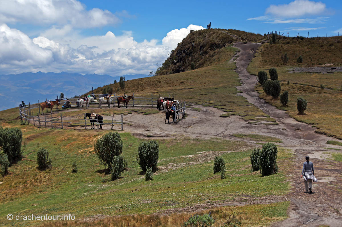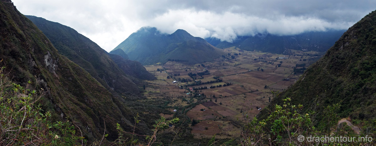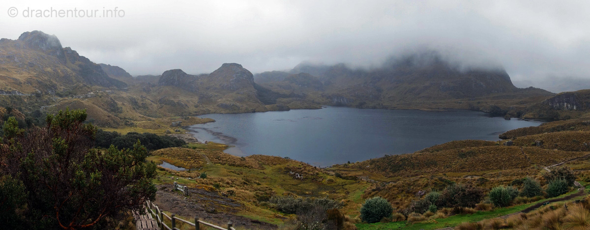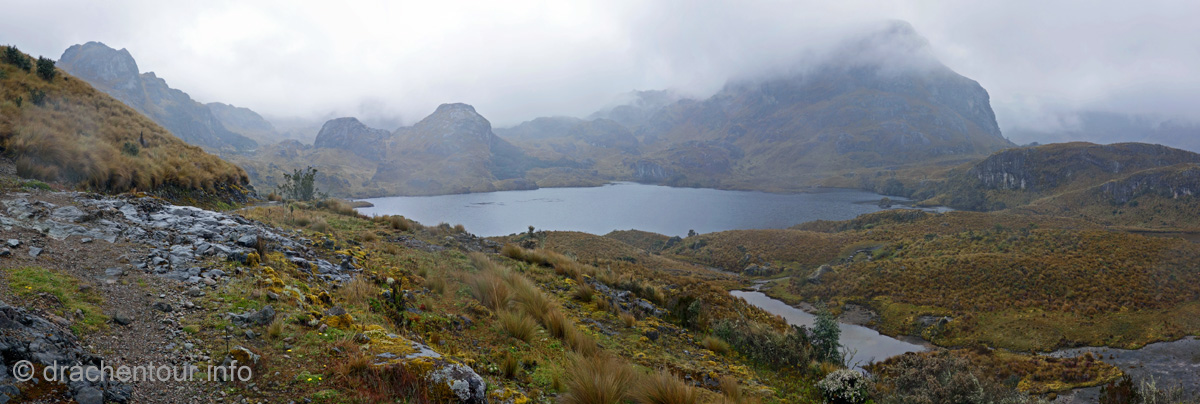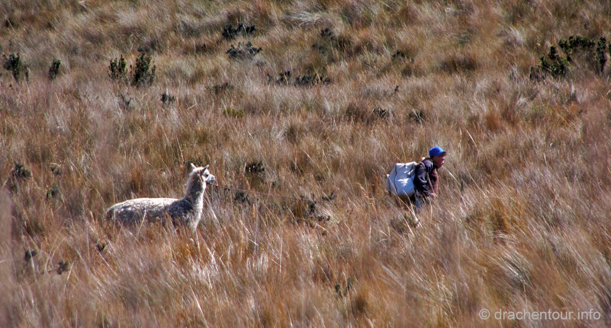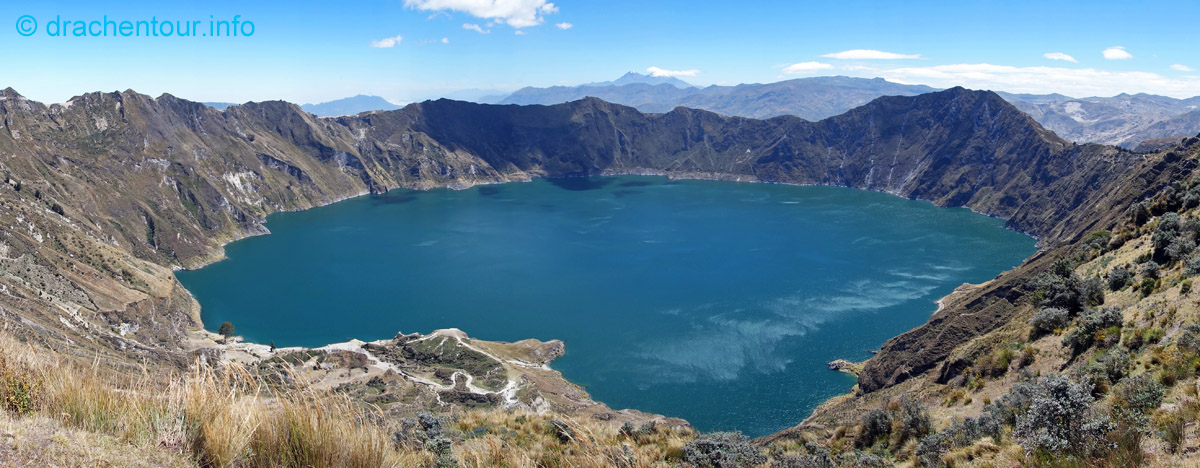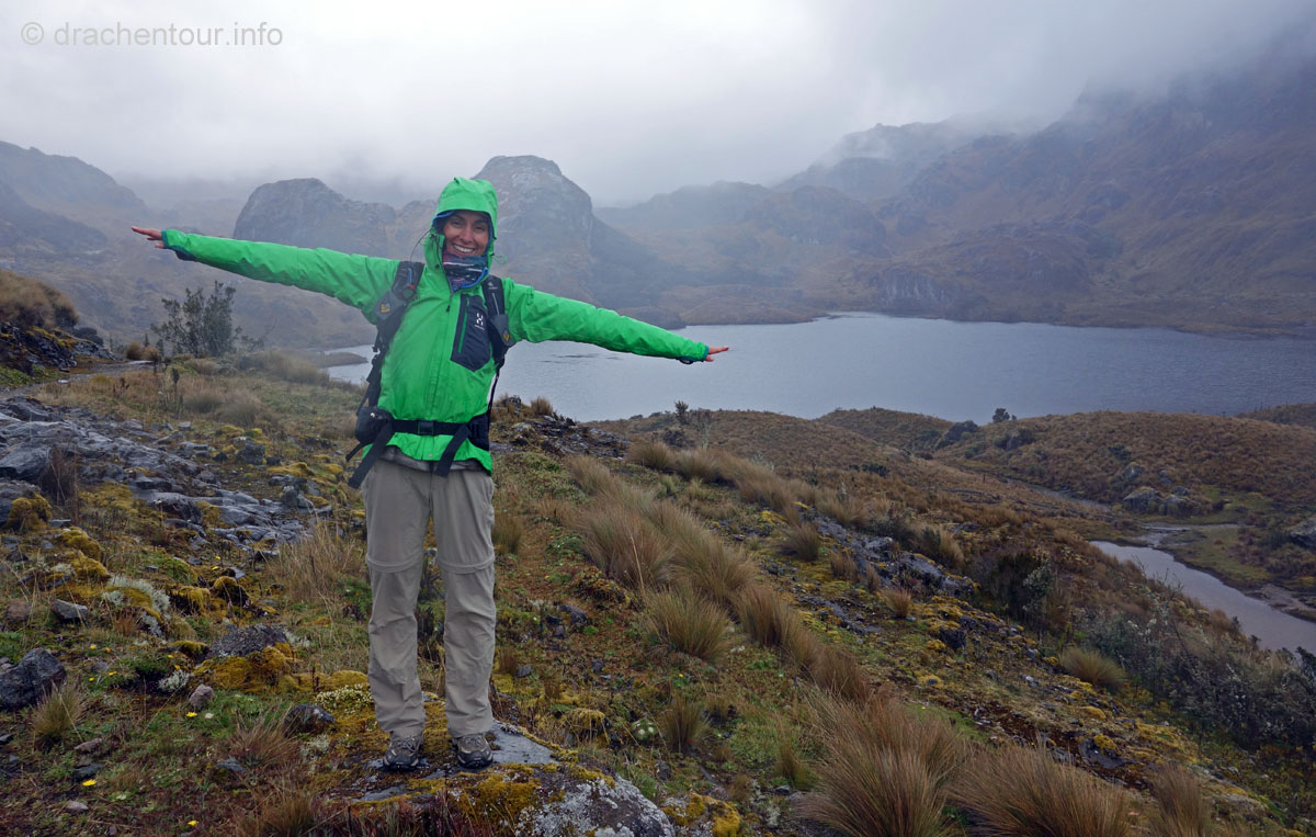 Die Fahrt führte durch trockenes und karges Hochland auf fast 4000 Höhenmetern ! Die Landschaft ist großartig und vielfältig; zunächst ging es durch Flickenteppiche aus Feldern und Wald hoch zum Paramo mit seinen im Wind schwingenden Gräsern. Unterwegs passierten wir ein Dorf namens Tigua, welches durch Malereien vom Leben auf dem Land auf Schafsleder zu weltweiter Berühmtheit gelang. Vorbei ging es weiter an den immens großen Rio Tachi Canyon und nach einer zweistündigen Fahrt erreichten wir dann die Lagune: der See schimmerte smaragdgrün (das liegt an den Mineralien im See) und bei strahlendem Sonnenschein konnten wir sogar die Vulkane Illiniza und Cotopaxi sehen - wiedermal ein unglaublich schönes Naturphänomen !