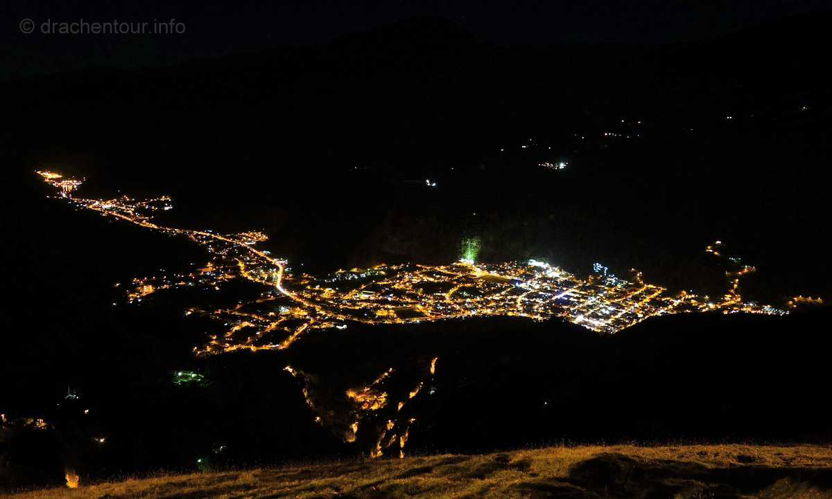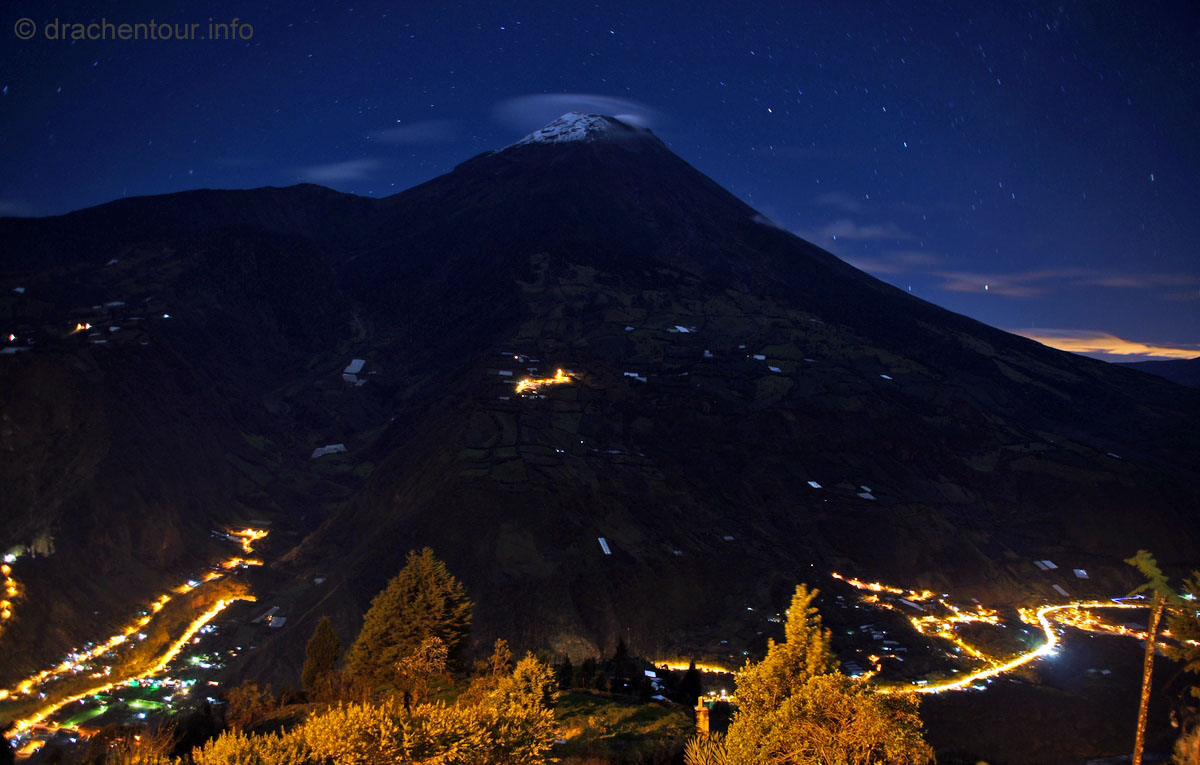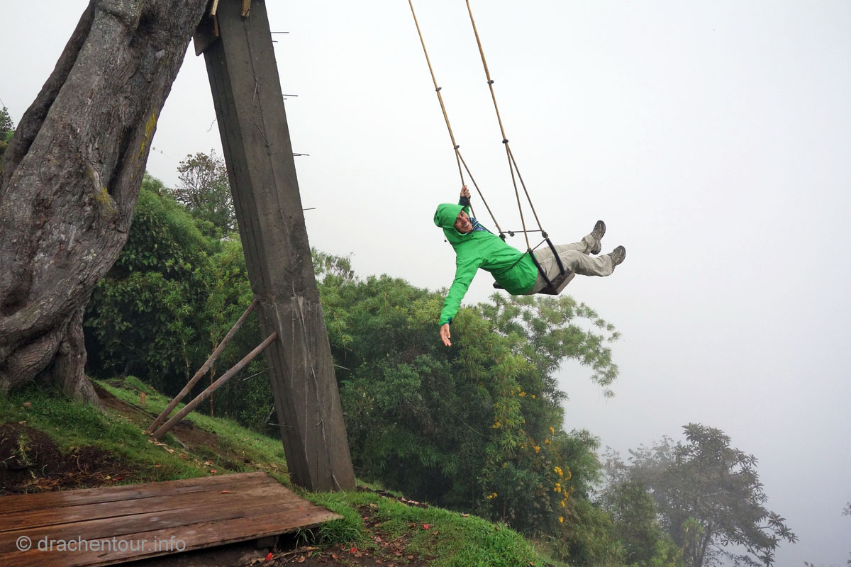 Wie oben schon geschrieben, hatten wir mit dem Wetter etwas Pech, weil es doch sehr viel regnete. Dennoch ließen wir uns nicht unterkriegen und besuchten die Orte, die uns besonders wichtig waren. So fuhren wir trotzdem zur Giant Swing (Riesenschaukel) am Casa de Arbol (Baumhaus). Normalerweise hat man hier einen phänomenalen Ausblick auf den Tunguruhua, bei uns war leider alles nur eine weiße Suppe. Einmal wollten wir den Unruhigen auf alle Fälle mal sehen und da es nachts meist aufklarte, fuhren wir bei Dunkelheit zu einem Aussichtspunkt. Und wir hatten Glück, denn zur Musik von Major Tom zeigte sich der Gigant von einer seiner schönsten Seiten: ohne Wolken nur mit einem kleinen Aschewölkchen - wir waren glücklich !!!