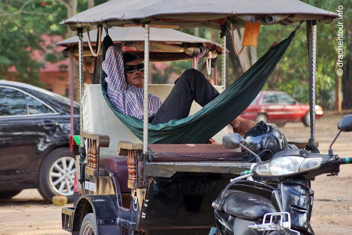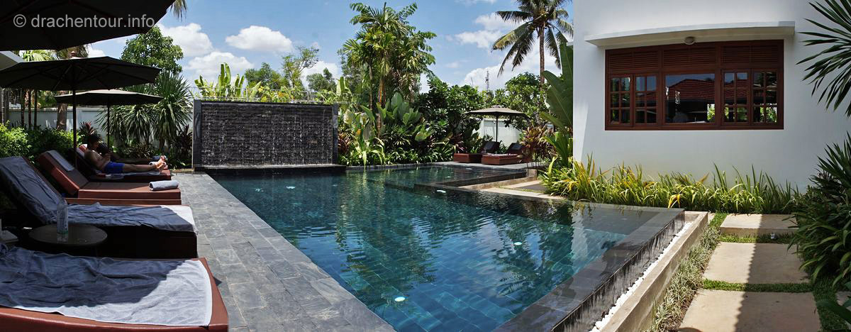 Der Wunsch, die Tempelanlagen von Angkor Wat zu besichtigen, war seit meiner Erkrankung am Dengue Fieber etwas in die Ferne gerückt. Das lag hauptsächlich daran, weil es während der derzeitig herrschenden Regenzeit viele Moskitos gibt und bestimmte unter ihnen können das Fieber übertragen. Das war uns zu riskant, denn eventuell ein zweites Mal mit dieser Krankheit konfrontiert zu werden, sollten wir tunlichst vermeiden. Die Medien informierten uns darüber, dass im Moment Thailand und Kambodscha von einer sehr heftigen Trockenheit heimgesucht werden, d.h. es gab wenige Moskitos, somit ein äußerst geringes Risiko, um von der " bösen-Dengue-Fieber-übertragenden-Mücke " erwischt zu werden. Diese Tatsache war, was uns betrifft, positiv zu bewerten, die Lage für die Bevölkerung spitzte sich allerdings dramatisch zu und die Regierungen diskutierten bestimmte Maßnahmen, die sie einleiten mussten, um an Wasser zu kommen. Die zweite Hürde war, wie kommen wir nach Siem Reap ? Die meisten Touris fliegen, das fanden wir keine gute Idee, aber glücklicherweise gibt es seit ein oder zwei Jahren eine geteerte Straße zwischen Bangkok und Siem Reap ! Jetzt konnte uns nichts mehr abhalten und wir erfüllten uns unseren Herzenswunsch und fuhren mit dem Bus nach Kambodscha - jipiii - Angkor wir kommen !! Im Vorfeld hatten wir die unglaublichsten Geschichten bezüglich des erforderlichen Visums für Kambodscha gelesen, wie zum Beispiel, dass man die Grenzbeamten erst bestechen muss, um an eins zu kommen oder sogar, im ungünstigsten Fall, das gar keins ausgestellt wird. Wir wollten, dass nichts schief geht, so beantragten wir unseres noch von Bangkok aus. Das ist allerdings komplett unnötig gewesen, denn die Touren-Anbieter sind bestens vorbereitet und wir hätten das Visum gleich dreimal unterwegs für die Hälfte des Preises erwerben können - im Nachhinein ist man eben immer schlauer. Die Fahrt mit der Organisation " Attakan " dauerte insgesamt acht Stunden und war hervorragend organisiert : pünktlich fuhren wir los, im Bus wurden Snacks verteilt, an der Grenze wurden wir zu Fuß sicher von einem Grenzhäuschen in das nächste eskortiert und konnten so die ganzen Formalitäten einfach und schnell erledigen und der wartende Bus brachte uns dann zu unserem Endziel nach Siem Reap. Obwohl alles so problemlos lief, fühlten wir uns nach dem Tag wie gerädert ( wir werden eben auch älter ! ) und mussten uns zunächst mal erholen. Dass war allerdings in Anbetracht des sensationellen Hotels keine große Schwierigkeit : wir hatten bei der Hotelwahl, das Sokkhak Boutique Resort, einen absoluten Volltreffer gelandet ! Beim Einchecken erhielten wir ein Upgrade und konnten ein großes, sehr geschmackvoll eingerichtetes Zimmer beziehen. Direkt vor unserem Deluxe-Zimmer befand sich ein wunderschöner Pool inmitten einer oasenhaften Gartenanlage, es war einfach wunderschön und genau das richtige zum Entspannen und zum Vorbereiten der kommenden Tage.