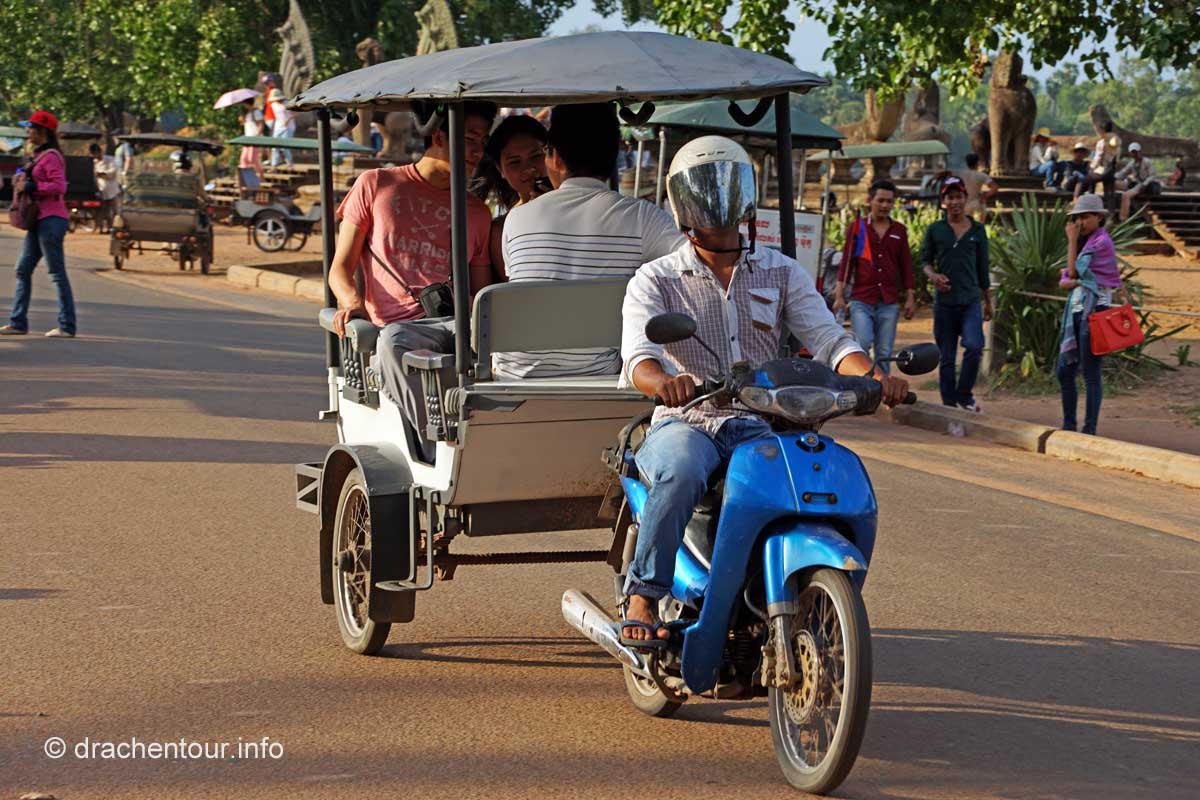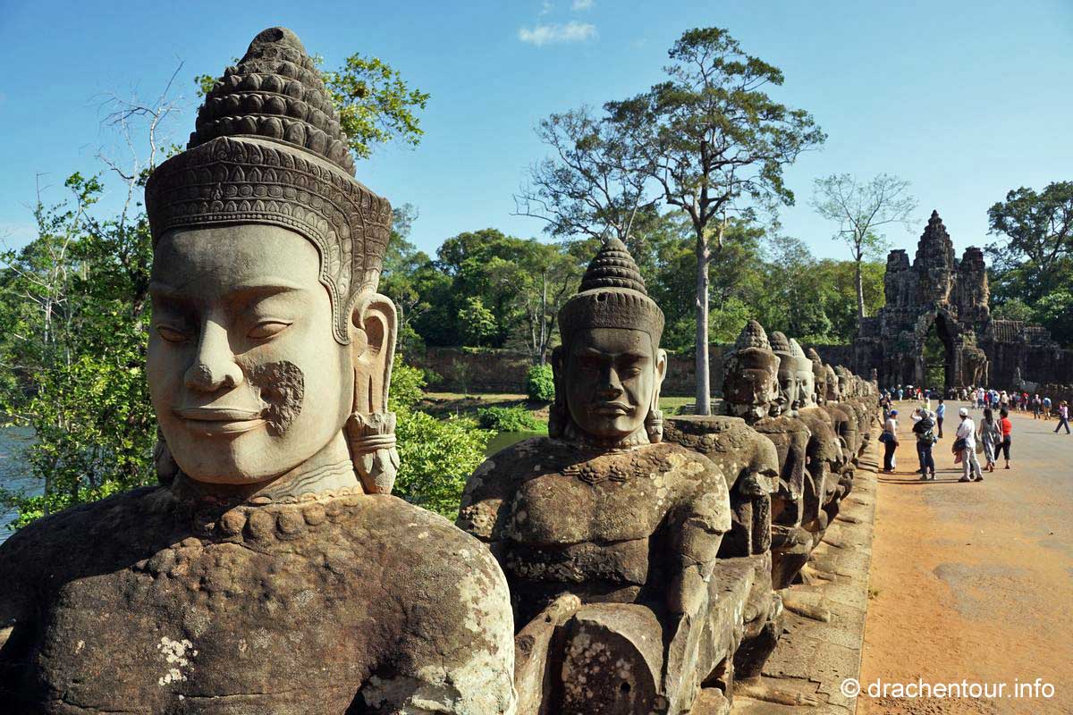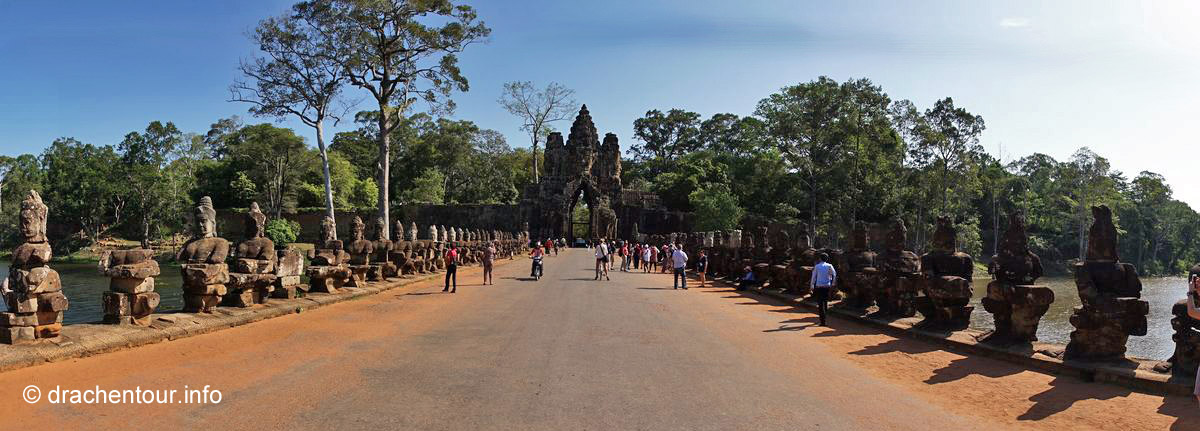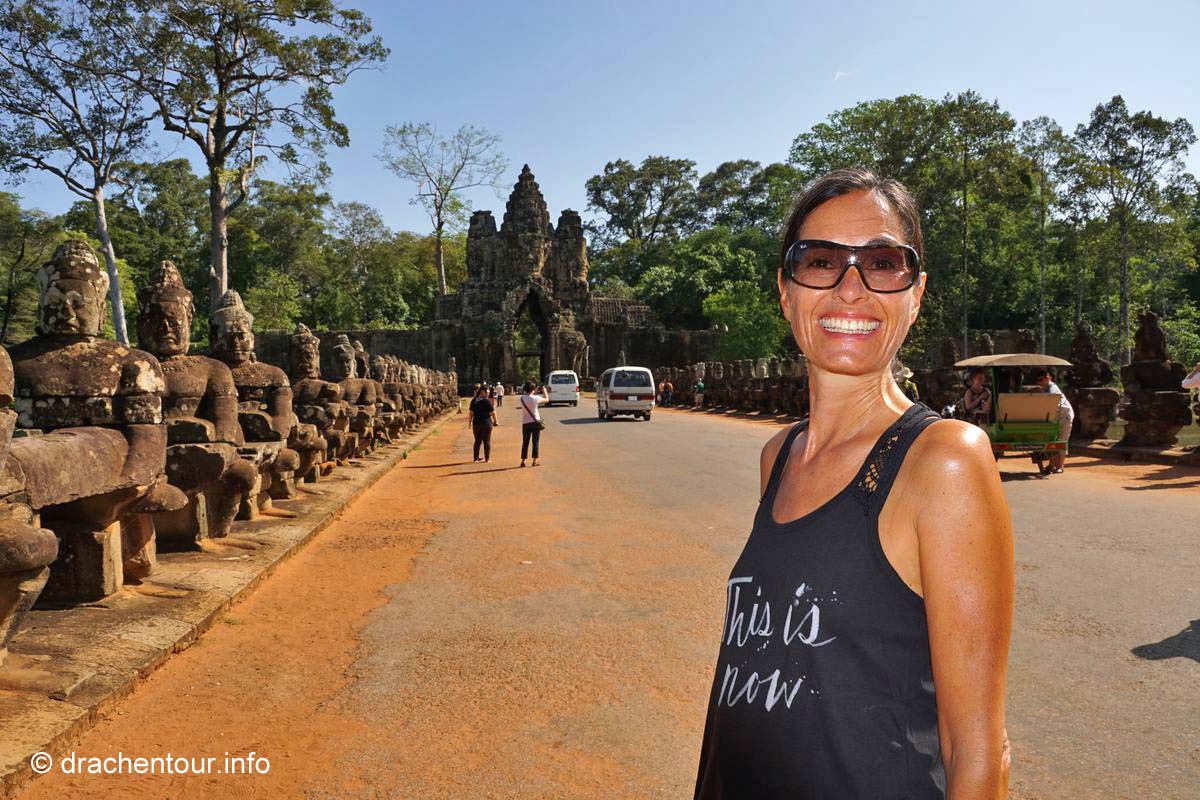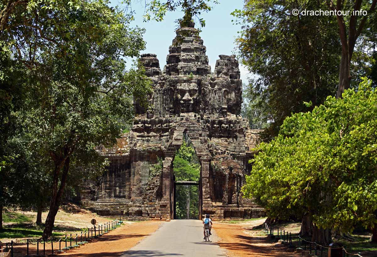 Um 4:00 Uhr klingelte der Wecker, nein - sagten wir beide synchron, beschlossen einstimmig, dass wir auch noch Morgen den Sonnenaufgang bewundern können und schliefen weiter. Im Folgenden möchte ich nun keinem Reiseführer Konkurrenz machen oder unsere Leser mit zu vielen Details langweilen, denn ich könnte ganze Romane zu den Tempeln schreiben, so versuche ich eine kleine, aber feine Zusammenfassung der drei Tage zu geben. Am ersten Tag erkundeten wir die Tempel, die uns am nächsten lagen mit dem Fahrrad. Zunächst fuhren wir auf einer schnurgeraden Straße in einem grünen schattigen Wald vorbei am Haupteingang, wo wir unseren 3-Tages-Pass ( der kostete 40 USD ) kauften und auch den Haupttempel Angkor Wat ließen wir erstmal links liegen und radelten weiter zum Süd-Tor von Angkor Thom. Wir versuchten nämlich schlauer zu sein als die vielen anderen Besucher und klapperten die Tempel gegen den Uhrzeigersinn zu den uns empfohlenen Zeiten ab. So versuchten wir den Menschenmassen zu entkommen, um nicht im Gänsemarsch mit einer unerträglichen Geräuschkulisse im Ohr ( mehr als die Hälfte der Touris waren Chinesen ! ) durch die spirituellen Anlagen gescheucht zu werden. Am Süd-Tor, welches den Eingang zur ehemaligen Hauptstadt markiert, angekommen, mussten wir ernüchtert feststellen, dass es hier nur so von Besuchern wimmelte und wir uns, wie auf einem Jahrmarkt fühlten - unser Plan ist leider nicht aufgegangen. Diese Stimmung wurde zum einen von den großen Gruppen von meist chinesischen Touristen, die alles tausendmal fotografieren mussten ( und wie immer, am liebsten sich selbst ), ausgelöst und zum anderen von den Einheimischen selbst, die aggressiv Getränke und Souvenirs verkaufen wollten ! Wir versuchten diese Hektik auszublenden und ließen uns viel Zeit die Brücke, die von 54 Göttern auf der linken und 54 Dämonen auf der rechten Seite flankiert ist und das am Ende der Brücke thronende imposante Süd-Tor zu bestaunen. Etwas störend fanden wir die Autos und Tuk Tuks, die sich durch das Tor hindurch drängelten.