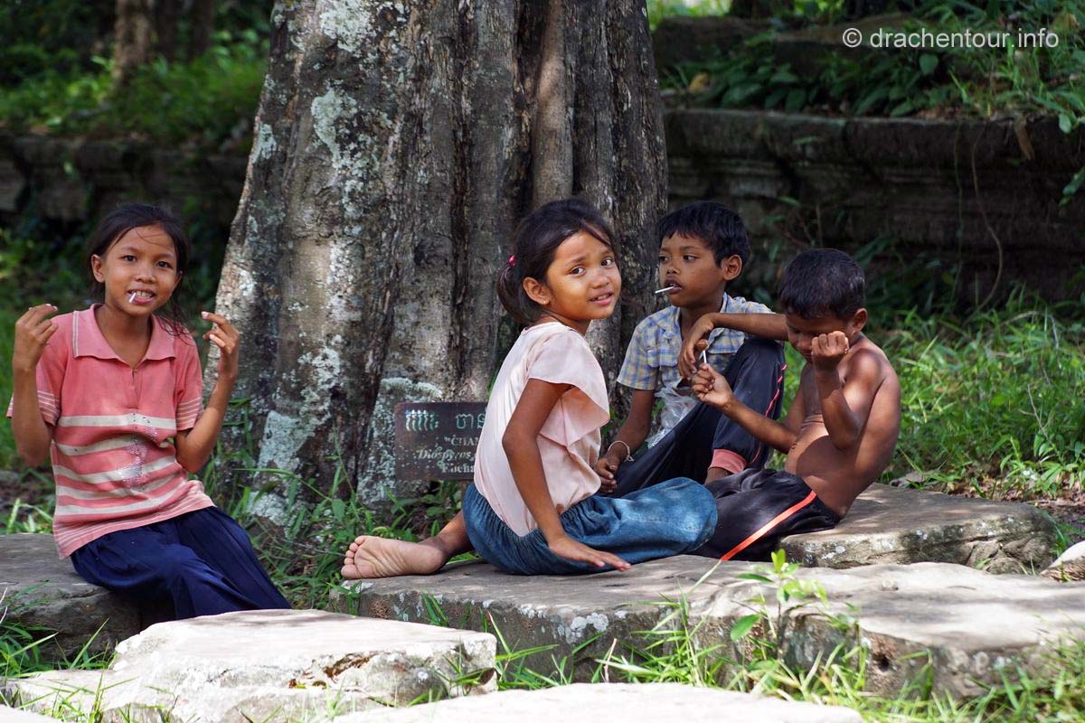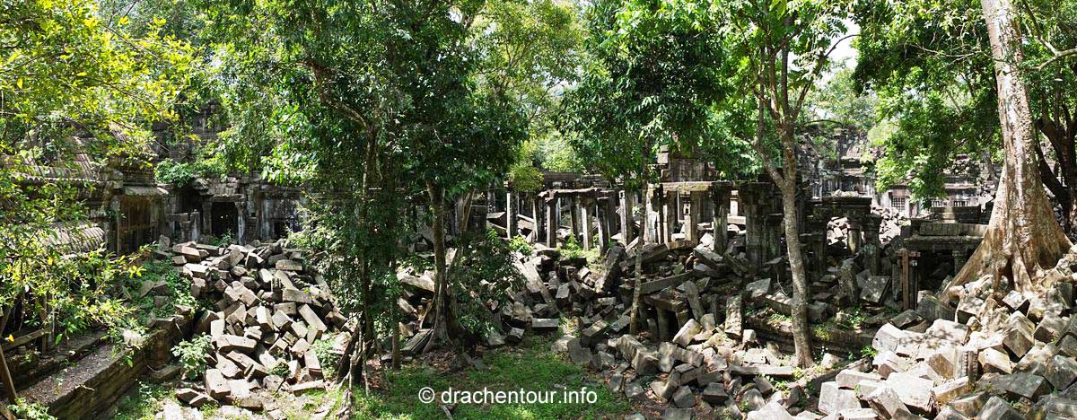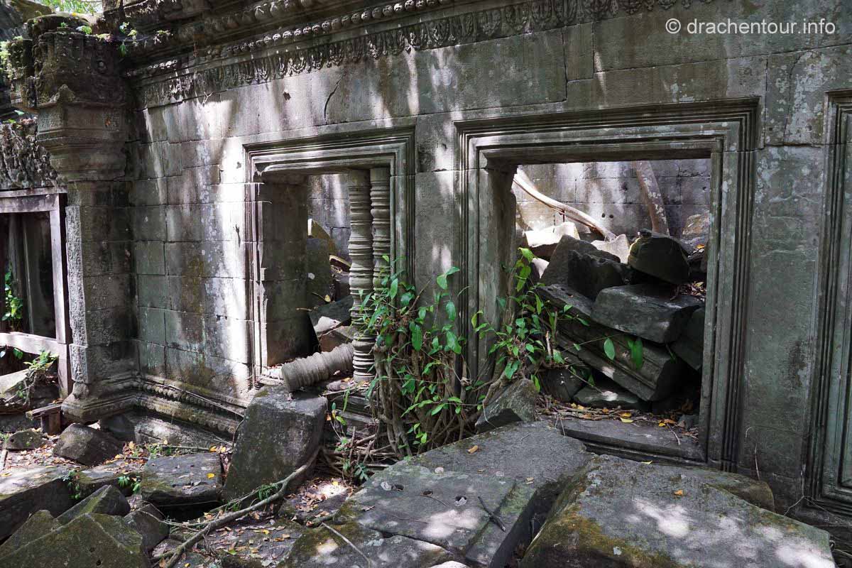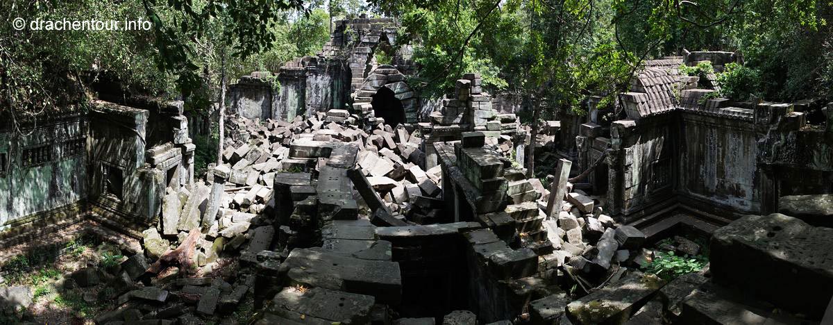 Nochmals weitere 40 Kilometer legten wir zum nächsten Tempel, dem Beng Maelea zurück. Auf dem Weg dorthin fuhren wir durch eine recht monotone Landschaft, lichte Wälder und Reisfelder wechselten sich ab. Spannend hingegen war zu sehen, wie die Einheimischen hier leben. Einfache Hütten, die von Pfeilern getragen werden, die aus einem Zimmer bestehen. Gekocht wird vor dem Haus auf einem holzgefeuerten Herd. Die Bewohner sitzen und liegen in ihren Hängematten unter ihrem schattigen " Haus ". Es herrschte eine fast unerträgliche Hitze und überall war der unglaublich feine rote Sandsteinstaub. Die Häuser hatten keine Elektrizität und auch kein fließend Wasser ! Überall sprangen nackige Kinder mit zerzausten Haaren und dreckiger Kleidung durch die Gegend und spielten. Bei diesen Bildern wurde uns bewusst, wie arm dieses Land eigentlich ist, das vergisst man gerne in Anbetracht der grandiosen Tempelanlagen. Der Beng Maelea Tempel ist ein weiterer spektakulärer Tempel, der für den langen Anfahrtsweg auf alle Fälle entschädigt. Obwohl er mehr einer Ruine gleicht, ist dieser Ort, der noch mehr als Ta Prohm vom Dschungel buchstäblich verschluckt wurde, eine Sehenswürdigkeit ohne Gleichen. Der Zentralturm ist völlig eingestürzt und liegt als riesiger Steinhaufen in den noch zum Teil gut erhaltenen Galerien, deren quaderförmige Steinklötze mit hellgrünem Moos überzogen sind, überall sind Würgefeigen am Werk und verleihen dem Tempel einen grandiosen und wilden " Indiana-Jones-Look ". Wir kraxelten über die Steinhaufen und entdeckten dabei immer wieder erstaunlich gut erhaltene Steinmetzarbeiten, wir kamen uns vor, wie auf einer Schatzsuche - es war spitze !!