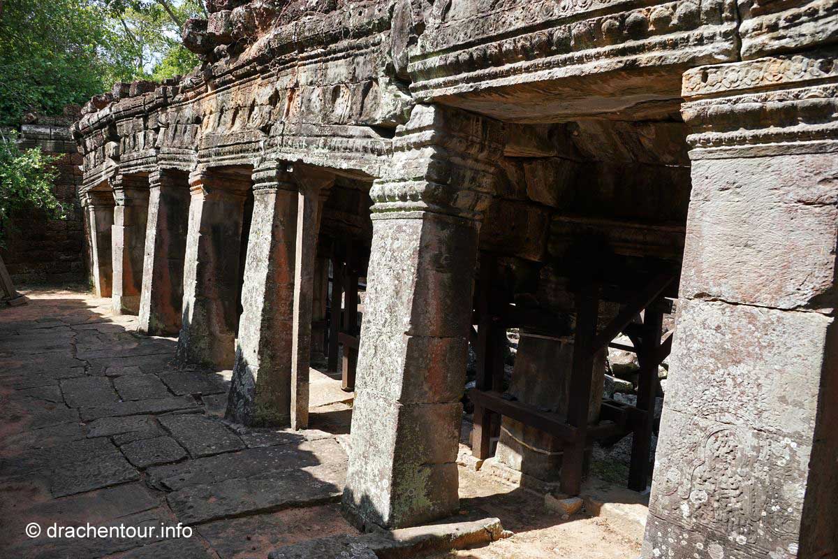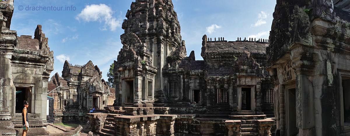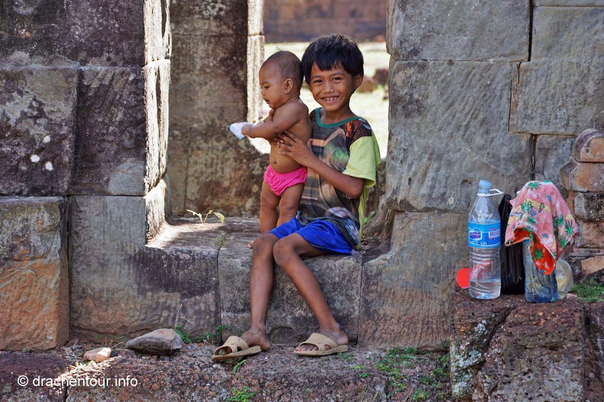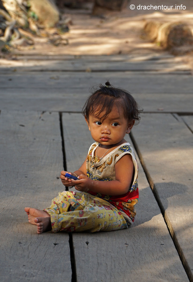 Nochmals weitere 40 Kilometer legten wir zum nächsten Tempel, dem Beng Maelea zurück. Auf dem Weg dorthin fuhren wir durch eine recht monotone Landschaft, lichte Wälder und Reisfelder wechselten sich ab. Spannend hingegen war zu sehen, wie die Einheimischen hier leben. Einfache Hütten, die von Pfeilern getragen werden, die aus einem Zimmer bestehen. Gekocht wird vor dem Haus auf einem holzgefeuerten Herd. Die Bewohner sitzen und liegen in ihren Hängematten unter ihrem schattigen " Haus ". Es herrschte eine fast unerträgliche Hitze und überall war der unglaublich feine rote Sandsteinstaub. Die Häuser hatten keine Elektrizität und auch kein fließend Wasser ! Überall sprangen nackige Kinder mit zerzausten Haaren und dreckiger Kleidung durch die Gegend und spielten. Bei diesen Bildern wurde uns bewusst, wie arm dieses Land eigentlich ist, das vergisst man gerne in Anbetracht der grandiosen Tempelanlagen. Der Beng Maelea Tempel ist ein weiterer spektakulärer Tempel, der für den langen Anfahrtsweg auf alle Fälle entschädigt. Obwohl er mehr einer Ruine gleicht, ist dieser Ort, der noch mehr als Ta Prohm vom Dschungel buchstäblich verschluckt wurde, eine Sehenswürdigkeit ohne Gleichen. Der Zentralturm ist völlig eingestürzt und liegt als riesiger Steinhaufen in den noch zum Teil gut erhaltenen Galerien, deren quaderförmige Steinklötze mit hellgrünem Moos überzogen sind, überall sind Würgefeigen am Werk und verleihen dem Tempel einen grandiosen und wilden " Indiana-Jones-Look ". Wir kraxelten über die Steinhaufen und entdeckten dabei immer wieder erstaunlich gut erhaltene Steinmetzarbeiten, wir kamen uns vor, wie auf einer Schatzsuche - es war spitze !!