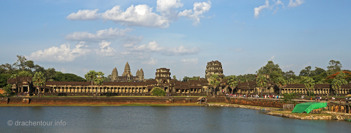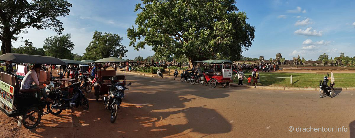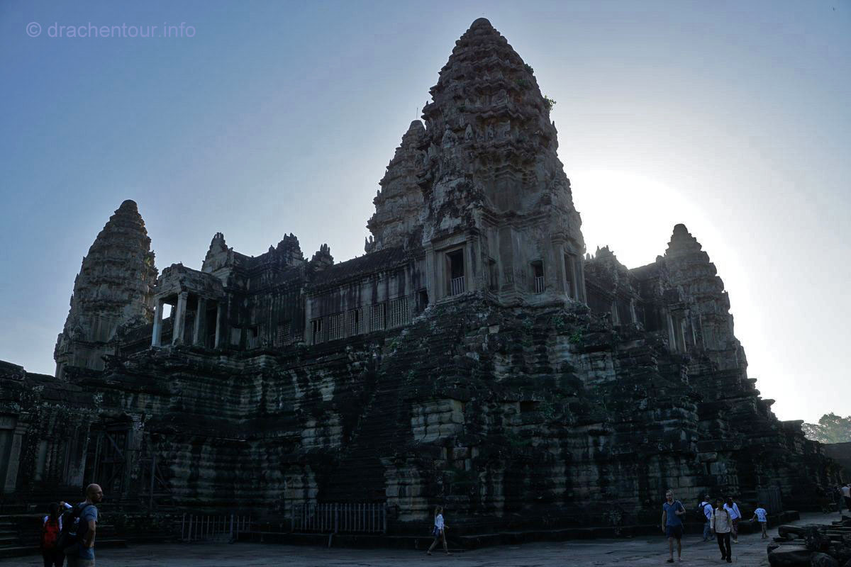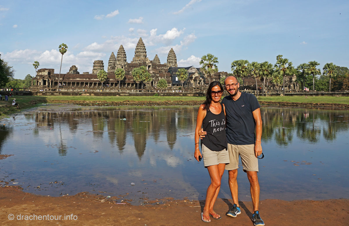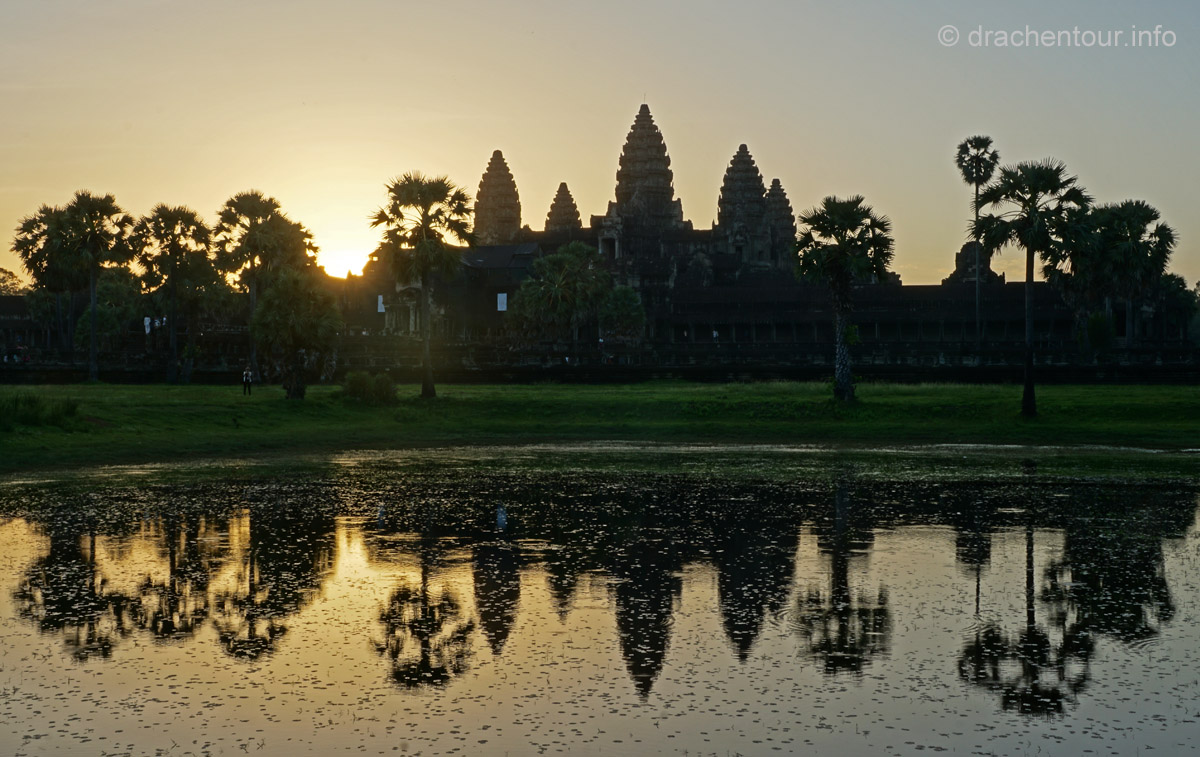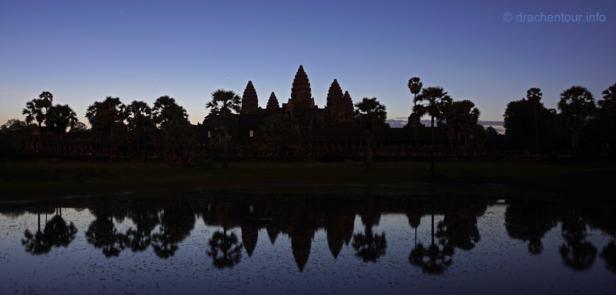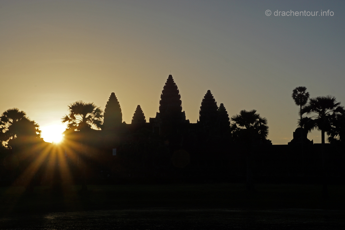 Und täglich grüßt das Murmeltier .... wieder klingelte der Wecker um 4:00 Uhr ! Dieses Mal schafften wir es uns zu überwinden und schwangen uns, naja wir hievten uns eher in unsere Fahrradsättel und los ging es zum Haupttempel Angkor Wat, den wir bei Sonnenaufgang sehen wollten. Die frische Luft und die morgendliche friedliche Stimmung weckten uns sachte auf, während wir die 6 Kilometer bei Dunkelheit zum Tempel zurücklegten. Am Tempel waren wir dann fast alleine, nur eine Gruppe aus vier Touristen war bereits vor Ort. Wir suchten uns ein schönes Plätzchen auf einer Wiese vor einem kleinen Teich mit Blickrichtung auf den Tempel, der noch verborgen in der Nacht lag. Langsam füllte sich die Wiese mit Besuchern aus aller Herren Ländern, minütlich wurden es mehr und der Geräuschpegel nahm unangenehme Ausmaße an, vorbei war es mit der Ruhe und der Besinnlichkeit, es wurde wie wild geknipst und nur wenige waren sich wahrscheinlich wirklich bewusst, welches Heiligtum sich uns allmählich zeigte, während die Sonne langsam seinen Weg am Himmel fand.