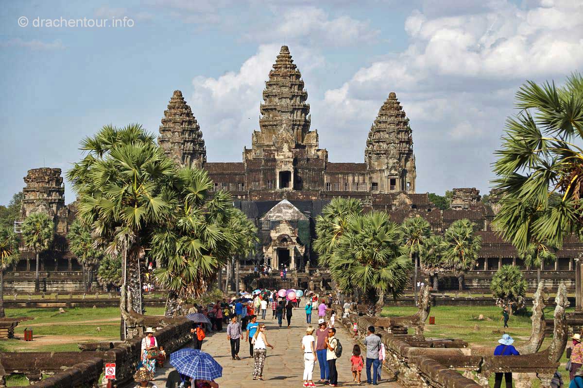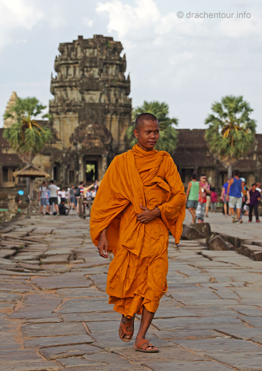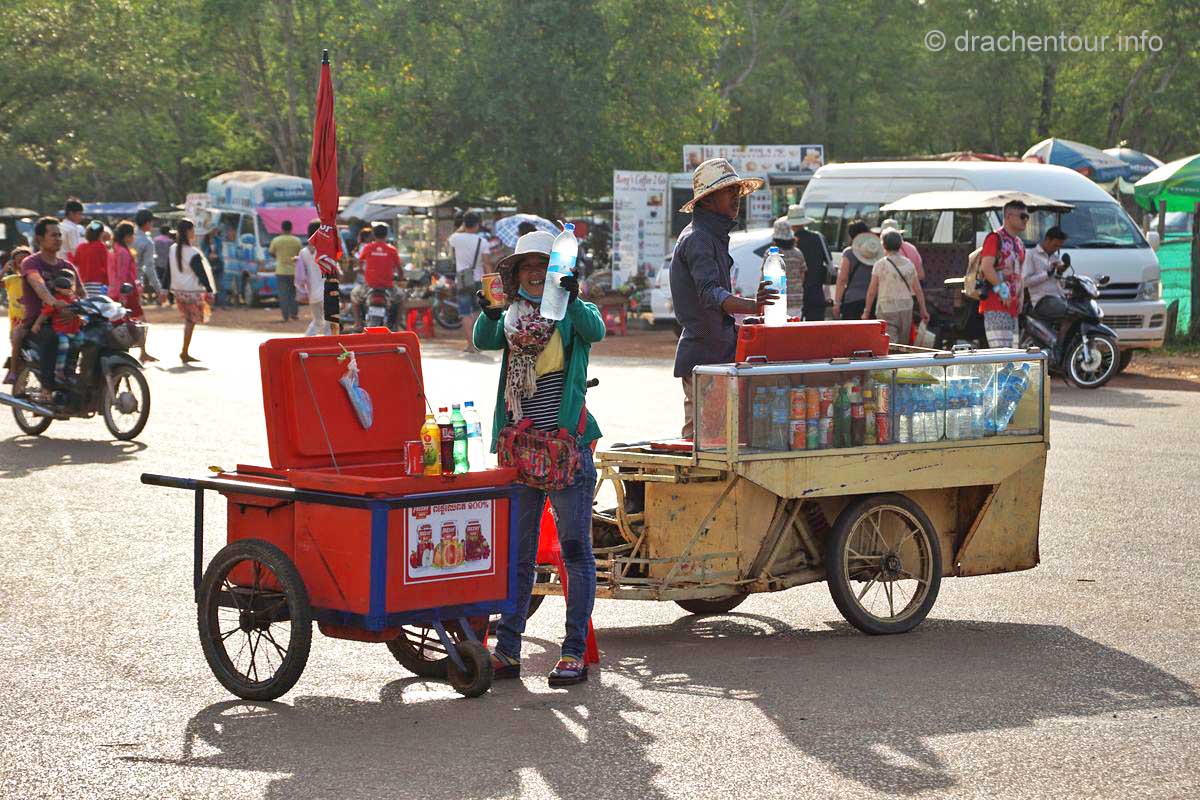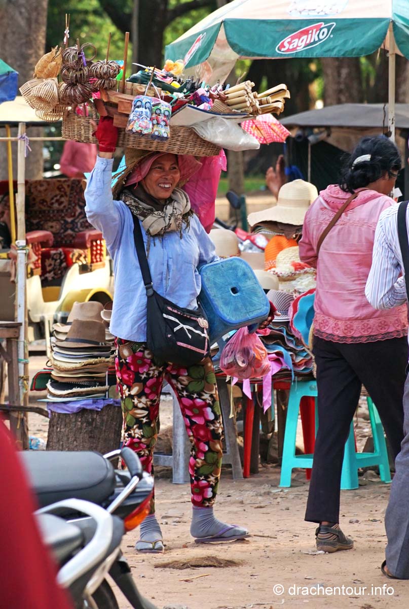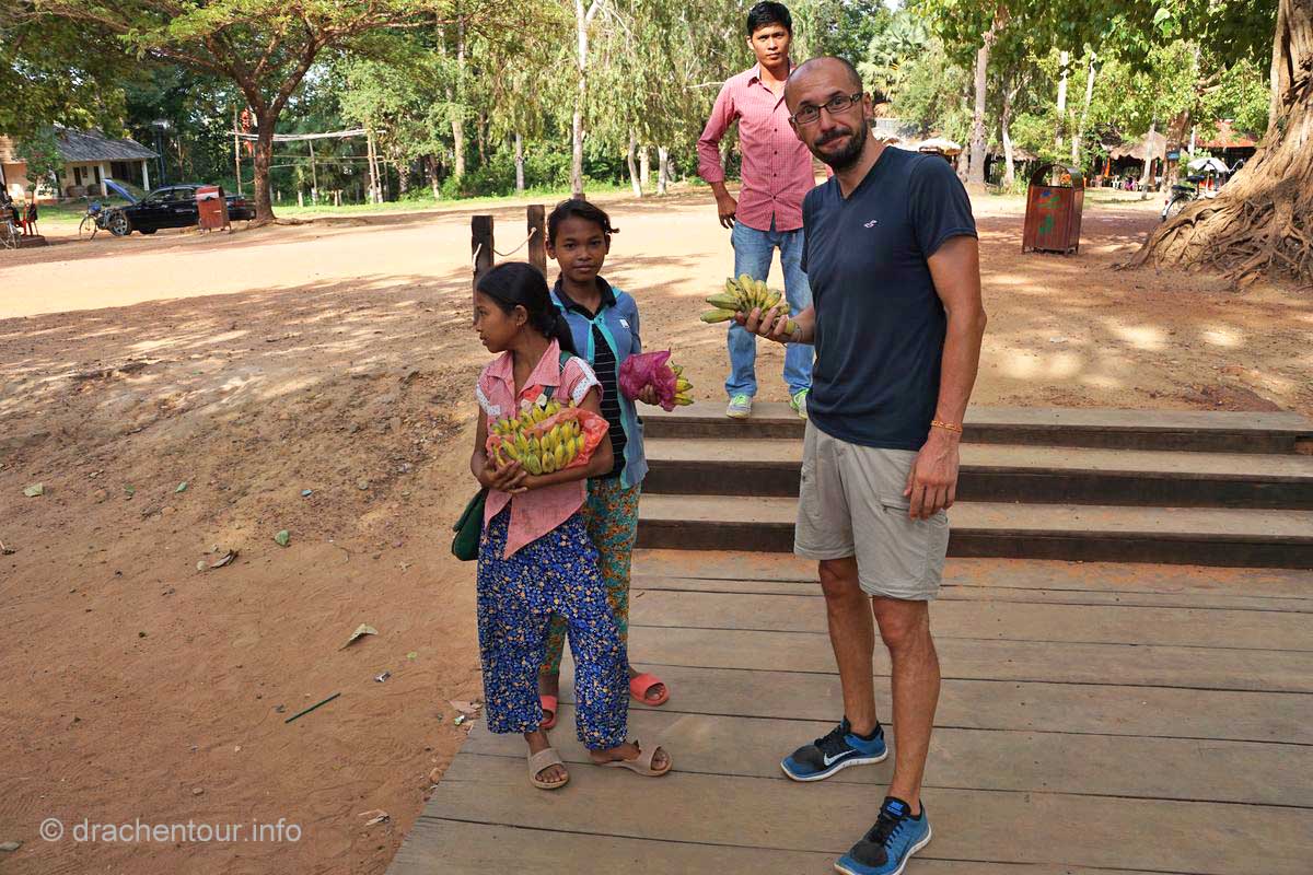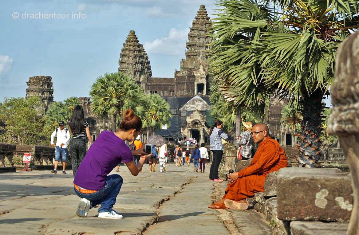 Am Ende dieses Berichtes möchte ich noch ein paar kritische Gedanken loswerden. Die magische Stätte wird von Millionen von Besuchern quasi buchstäblich überrannt, überall sind sie mit Sonnenhüten und Sonnenschirmen, um sich vor den heißen Strahlen zu schützen. Alle paar Meter bleiben sie stehen und machen mit ihren Smartphones und Tablets Fotos und Selfies. Überall hören wir das Klicken der Auslöser und die Stimmen der Touristenführer, die in allen erdenklichen Sprachen faszinierende Fakten und Geschichten zu den Bauwerken wissen. Die großen Gewinner dieser Entwicklung sind die kambodschanischen Verkäufer, indem sie alles Mögliche zum Verkauf anbieten. Oder sie machen ein sehr lohnendes Geschäft mit einem Pferd vor dem Tempel, auf welches sich die Touristen setzten können, dann bekommen sie noch einen Cowboyhut auf den Kopf und fertig ist das Erinnerungsbild ( kitschiger und doofer geht´s wohl nicht mehr ! ), ABER es sichert dem Anbieter ein sehr lukratives Einkommen. Die Anlage ist diesem enormen Menschenmassen nicht gewachsen, die Grundmauern der Tempel werden immer unstabiler, an den Wänden verewigen sich Besucher mit Graffiti ( wie doof kann man denn sein ? ) und wo bleibt da noch die Spiritualität und die Ruhe ? Glücklicherweise unternimmt die Regierung bereits schon einiges, so hat sie zum Beispiel Wachmänner engagiert, damit keine Graffiti mehr gepinselt werden können oder es dürfen nur noch eine begrenzte Anzahl von Besuchern auf den Hauptturm des Angkor Wat Tempels. Des Weiteren wird im Moment auch diskutiert keine Touristenbusse mehr in den Park zu lassen, das würde bedeuten, dass die Besucher laufen müssen, mit dieser Maßnahme versprechen sich die Verantwortlichen, dass Angkor wieder zu einem spirituellen Ort wird. Es ist uns klar, dass auch wir zu den Touristen zählen und zu diesen Zerstörungen beitragen. Uns unterscheidet allerdings, dass wir diese Meisterwerke ruhig und respektvoll betrachten. So glaube ich, dass es zukünftig sehr wichtig ist, dass empfindliche Orte, wie Angkor, mit mehr Respekt besucht werden sollten, und dass nicht mit jedem lausigen Einfall Geld verdient werden muss. Gilt zu hoffen, dass die schönen Tänzerinnen nicht weiter bröckeln und nachkommende Generationen diesen Schatz der Menschheit bewundern dürfen.