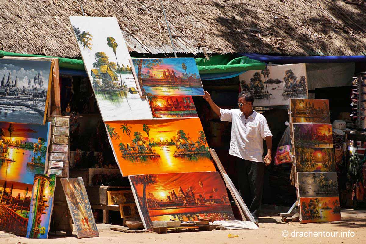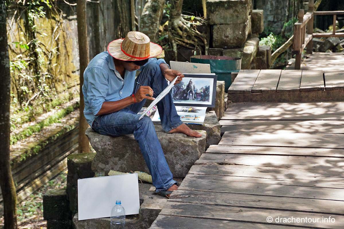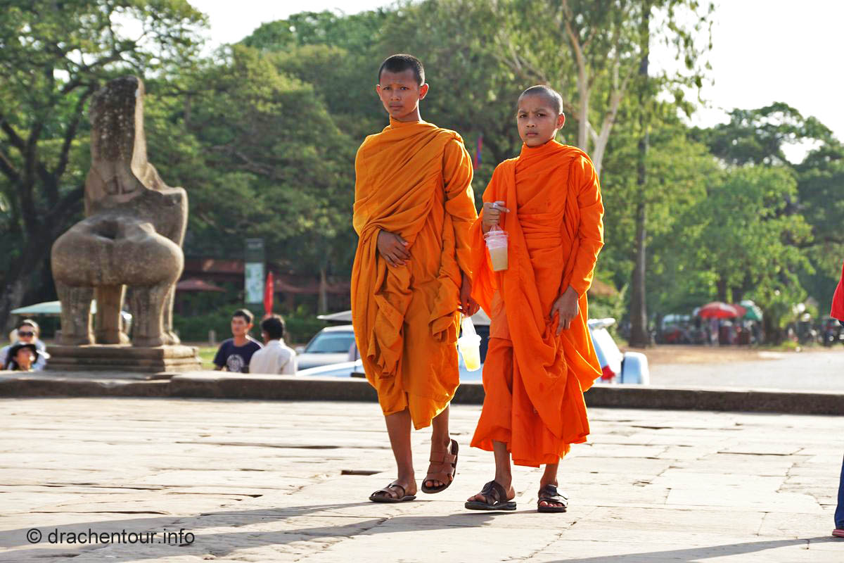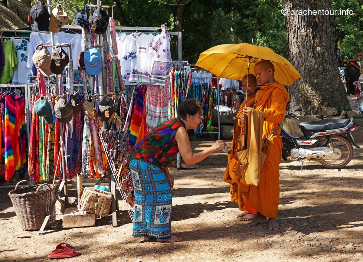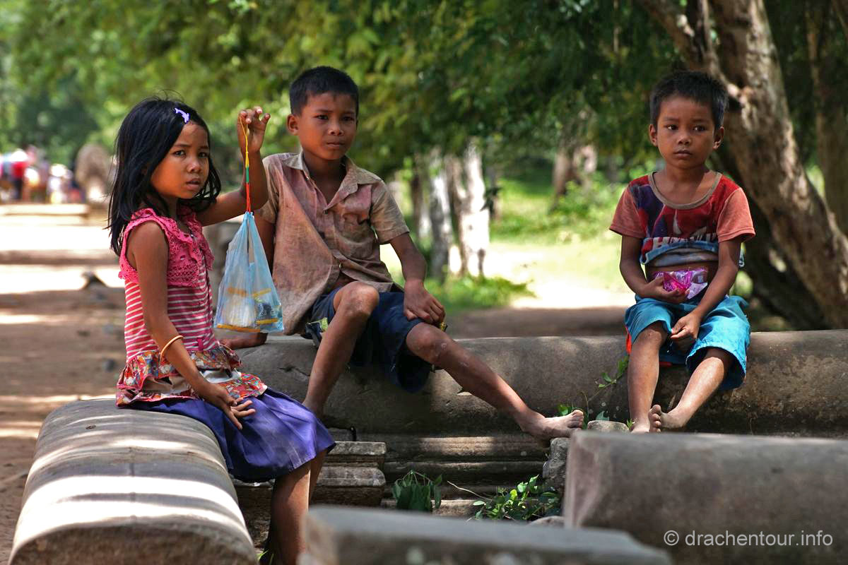 Am Ende dieses Berichtes möchte ich noch ein paar kritische Gedanken loswerden. Die magische Stätte wird von Millionen von Besuchern quasi buchstäblich überrannt, überall sind sie mit Sonnenhüten und Sonnenschirmen, um sich vor den heißen Strahlen zu schützen. Alle paar Meter bleiben sie stehen und machen mit ihren Smartphones und Tablets Fotos und Selfies. Überall hören wir das Klicken der Auslöser und die Stimmen der Touristenführer, die in allen erdenklichen Sprachen faszinierende Fakten und Geschichten zu den Bauwerken wissen. Die großen Gewinner dieser Entwicklung sind die kambodschanischen Verkäufer, indem sie alles Mögliche zum Verkauf anbieten. Oder sie machen ein sehr lohnendes Geschäft mit einem Pferd vor dem Tempel, auf welches sich die Touristen setzten können, dann bekommen sie noch einen Cowboyhut auf den Kopf und fertig ist das Erinnerungsbild ( kitschiger und doofer geht´s wohl nicht mehr ! ), ABER es sichert dem Anbieter ein sehr lukratives Einkommen. Die Anlage ist diesem enormen Menschenmassen nicht gewachsen, die Grundmauern der Tempel werden immer unstabiler, an den Wänden verewigen sich Besucher mit Graffiti ( wie doof kann man denn sein ? ) und wo bleibt da noch die Spiritualität und die Ruhe ? Glücklicherweise unternimmt die Regierung bereits schon einiges, so hat sie zum Beispiel Wachmänner engagiert, damit keine Graffiti mehr gepinselt werden können oder es dürfen nur noch eine begrenzte Anzahl von Besuchern auf den Hauptturm des Angkor Wat Tempels. Des Weiteren wird im Moment auch diskutiert keine Touristenbusse mehr in den Park zu lassen, das würde bedeuten, dass die Besucher laufen müssen, mit dieser Maßnahme versprechen sich die Verantwortlichen, dass Angkor wieder zu einem spirituellen Ort wird. Es ist uns klar, dass auch wir zu den Touristen zählen und zu diesen Zerstörungen beitragen. Uns unterscheidet allerdings, dass wir diese Meisterwerke ruhig und respektvoll betrachten. So glaube ich, dass es zukünftig sehr wichtig ist, dass empfindliche Orte, wie Angkor, mit mehr Respekt besucht werden sollten, und dass nicht mit jedem lausigen Einfall Geld verdient werden muss. Gilt zu hoffen, dass die schönen Tänzerinnen nicht weiter bröckeln und nachkommende Generationen diesen Schatz der Menschheit bewundern dürfen.
