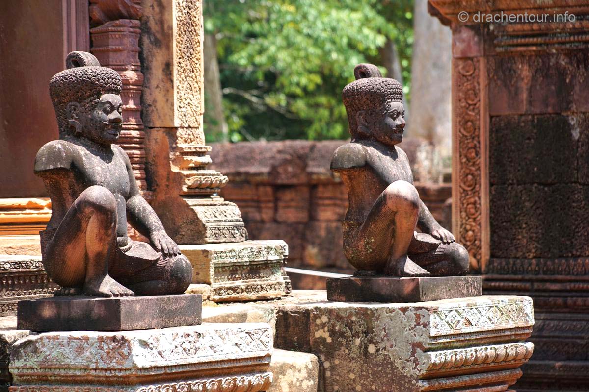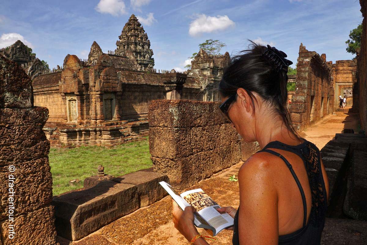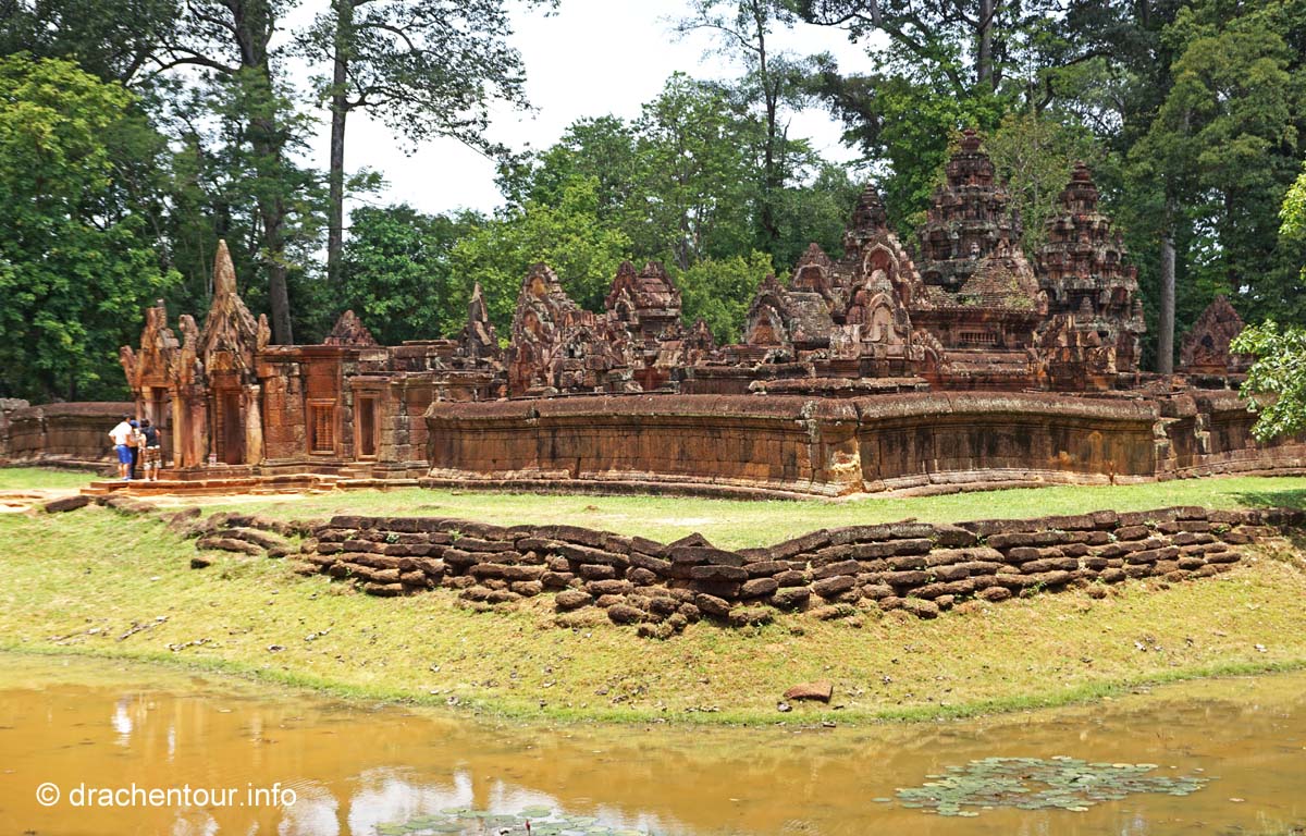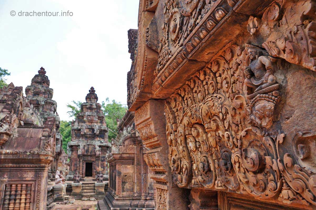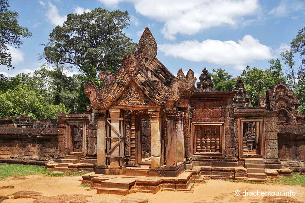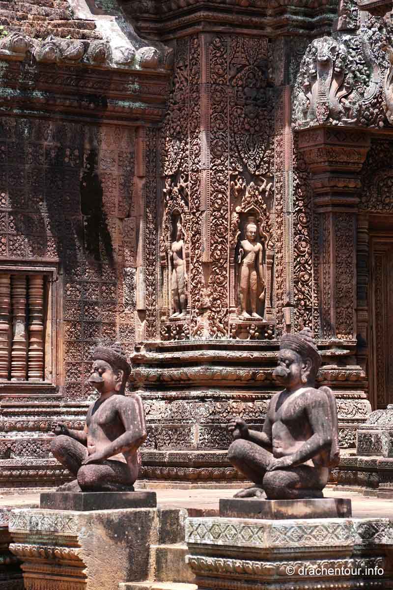 An unserem letzten Tag in Angkor besuchten wir Tempel, die etwas weiter entfernt von unserem Hotel lagen, weshalb wir für diese Tour ein Auto mit Fahrer mieteten. Nach dem Banteay Samre war der Banteay Srei, der sich ca. 30 Kilometer nordöstlich von Siem Reap befindet, unser begehrtes Ziel. Der kleine Tempel hebt sich mit seinem rosafarbenen Sandstein von dem ihn umgebenden grünen dichten Wald ab, er erstrahlt wie ein unwirklicher Feenpalast. Er wurde mit besonders schönen und tiefen Reliefs dekoriert, die überall zu sehen waren. Ständig entdeckten wir ein neues wunderschönes Bild und mussten es bildlich festhalten, da kann man sich ja vorstellen, dass uns eine Auswahl der Bilder für die Homepage ziemlich schwer fiel :-) !