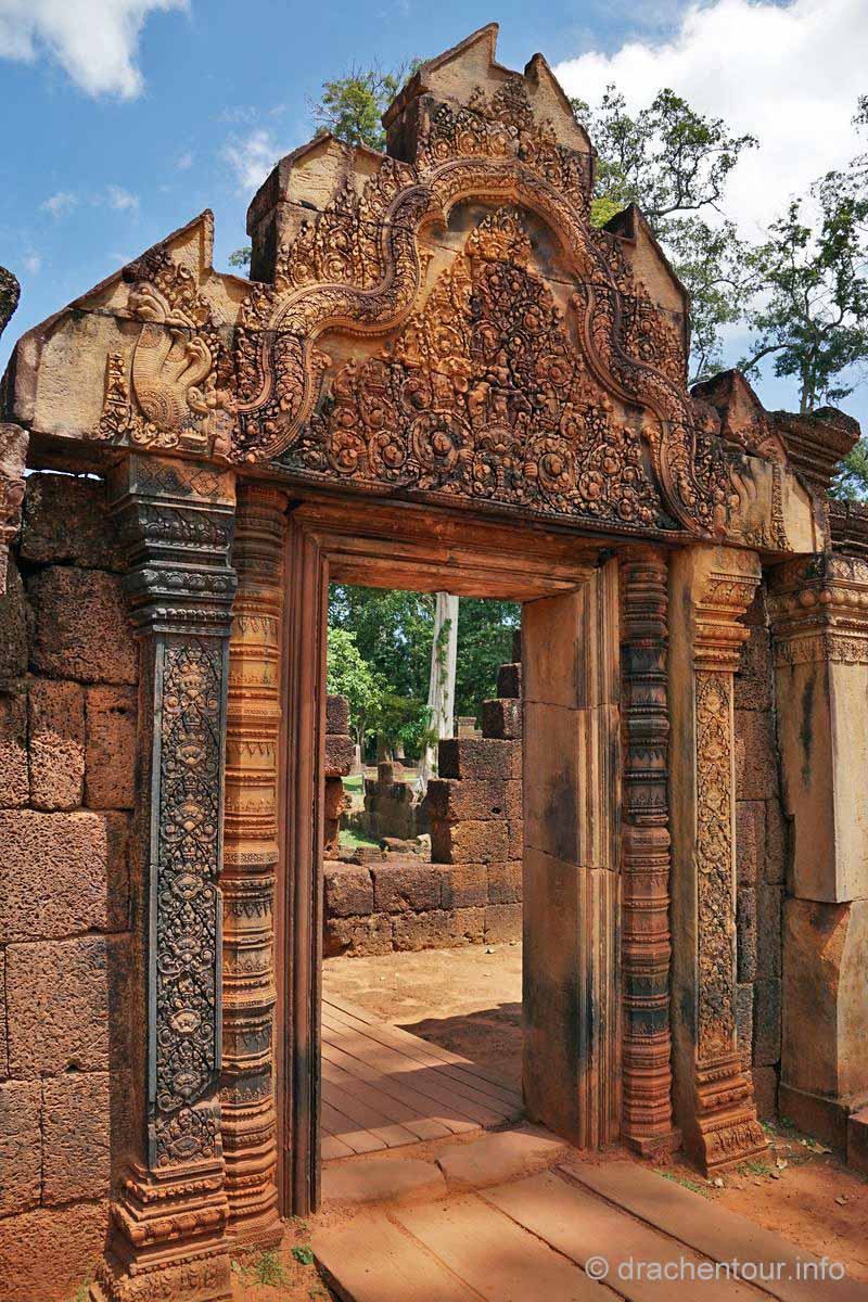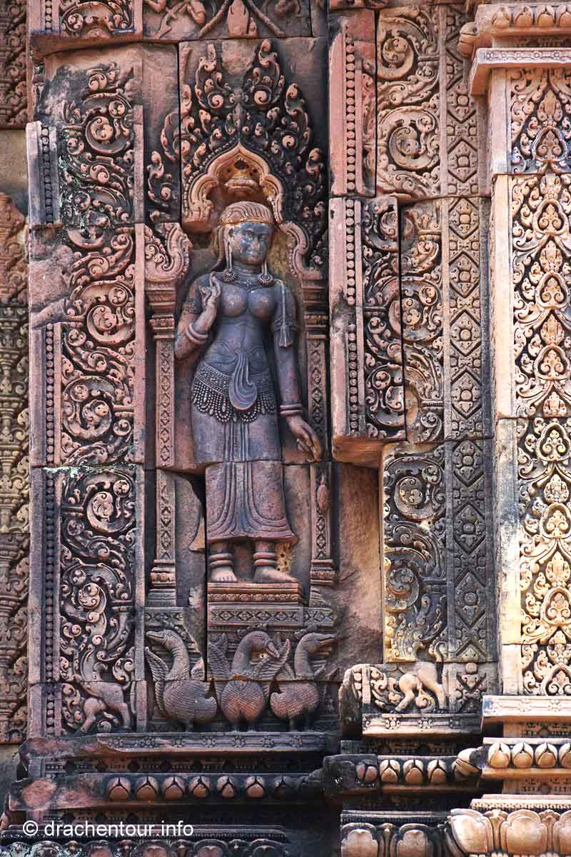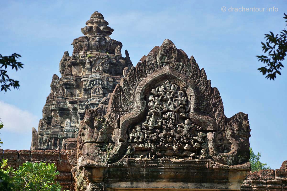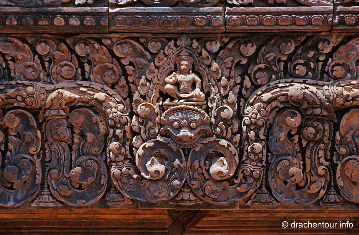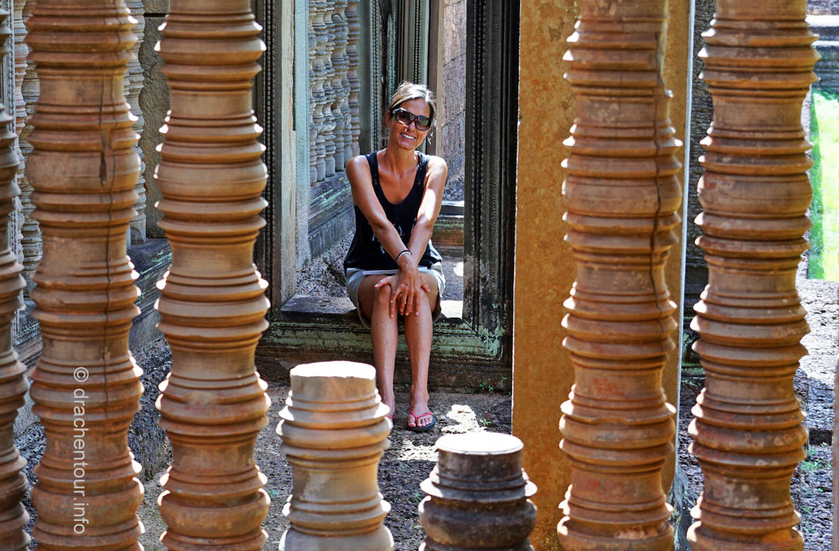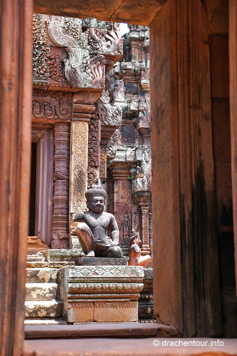An unserem letzten Tag in Angkor besuchten wir Tempel, die etwas weiter entfernt von unserem Hotel lagen, weshalb wir für diese Tour ein Auto mit Fahrer mieteten. Nach dem Banteay Samre war der Banteay Srei, der sich ca. 30 Kilometer nordöstlich von Siem Reap befindet, unser begehrtes Ziel. Der kleine Tempel hebt sich mit seinem rosafarbenen Sandstein von dem ihn umgebenden grünen dichten Wald ab, er erstrahlt wie ein unwirklicher Feenpalast. Er wurde mit besonders schönen und tiefen Reliefs dekoriert, die überall zu sehen waren. Ständig entdeckten wir ein neues wunderschönes Bild und mussten es bildlich festhalten, da kann man sich ja vorstellen, dass uns eine Auswahl der Bilder für die Homepage ziemlich schwer fiel :-) !