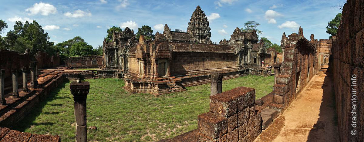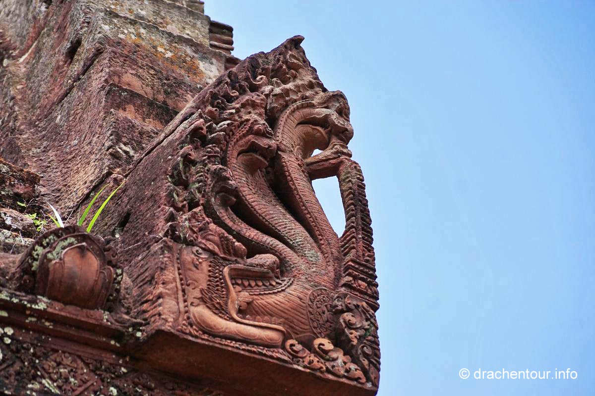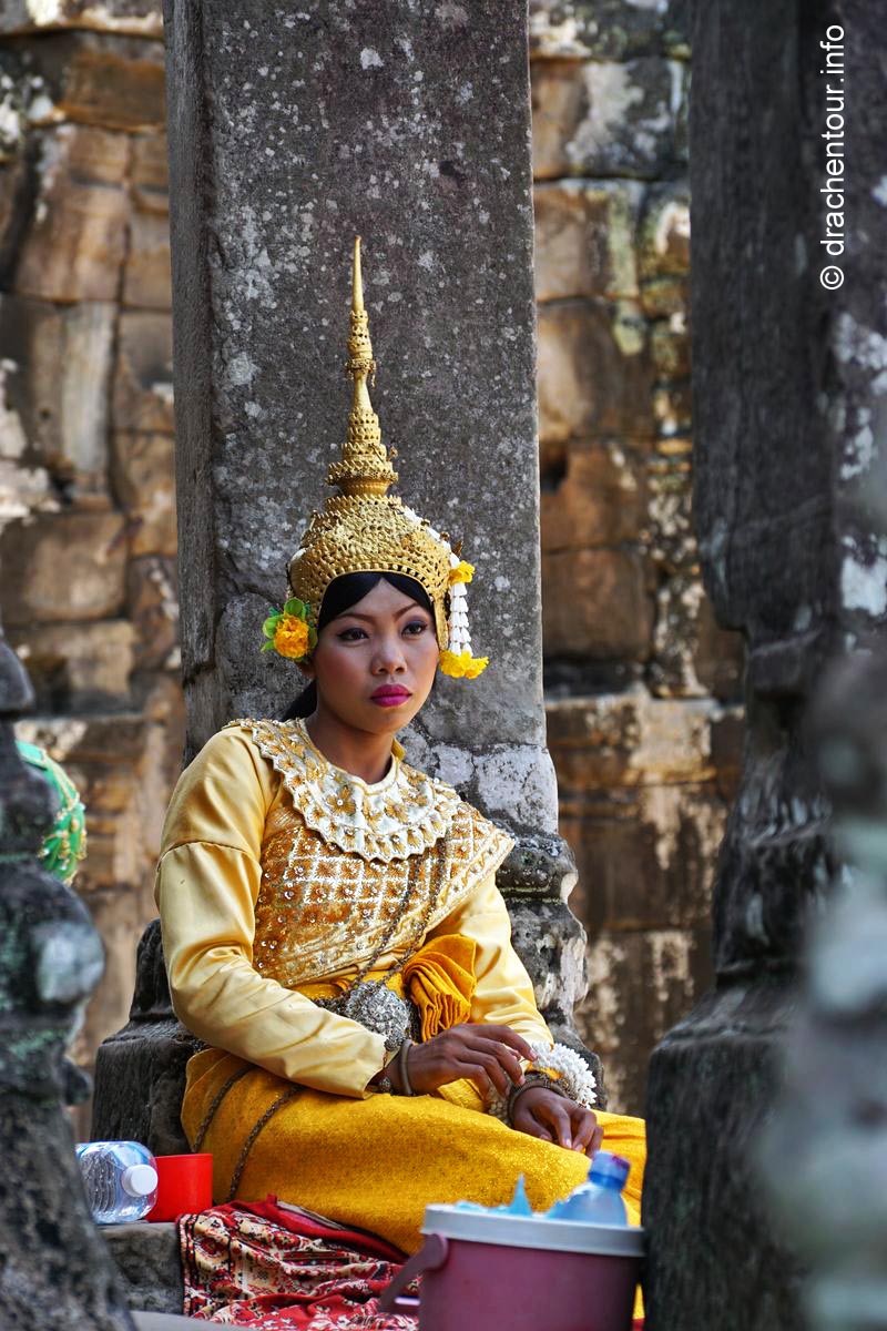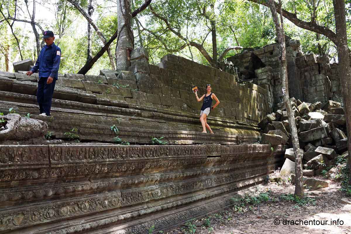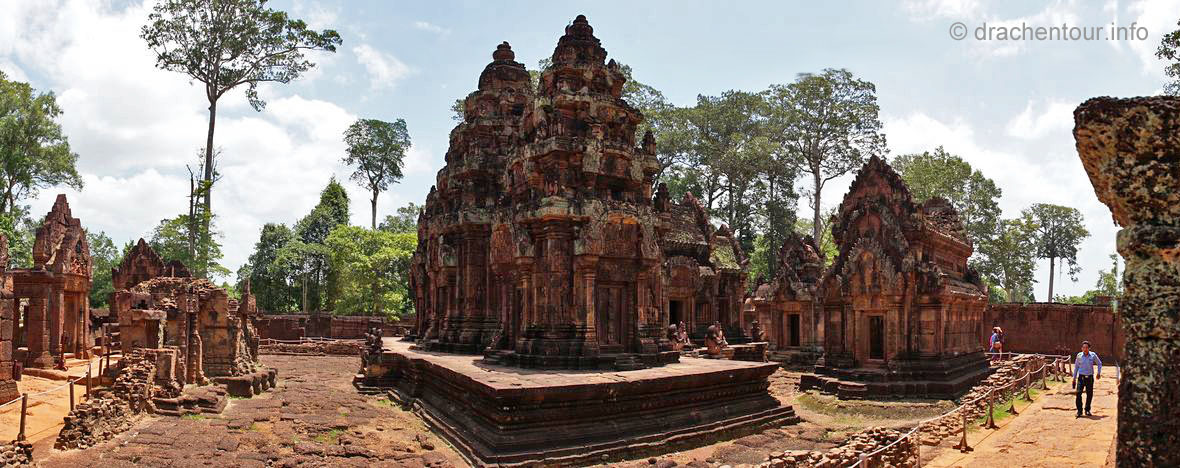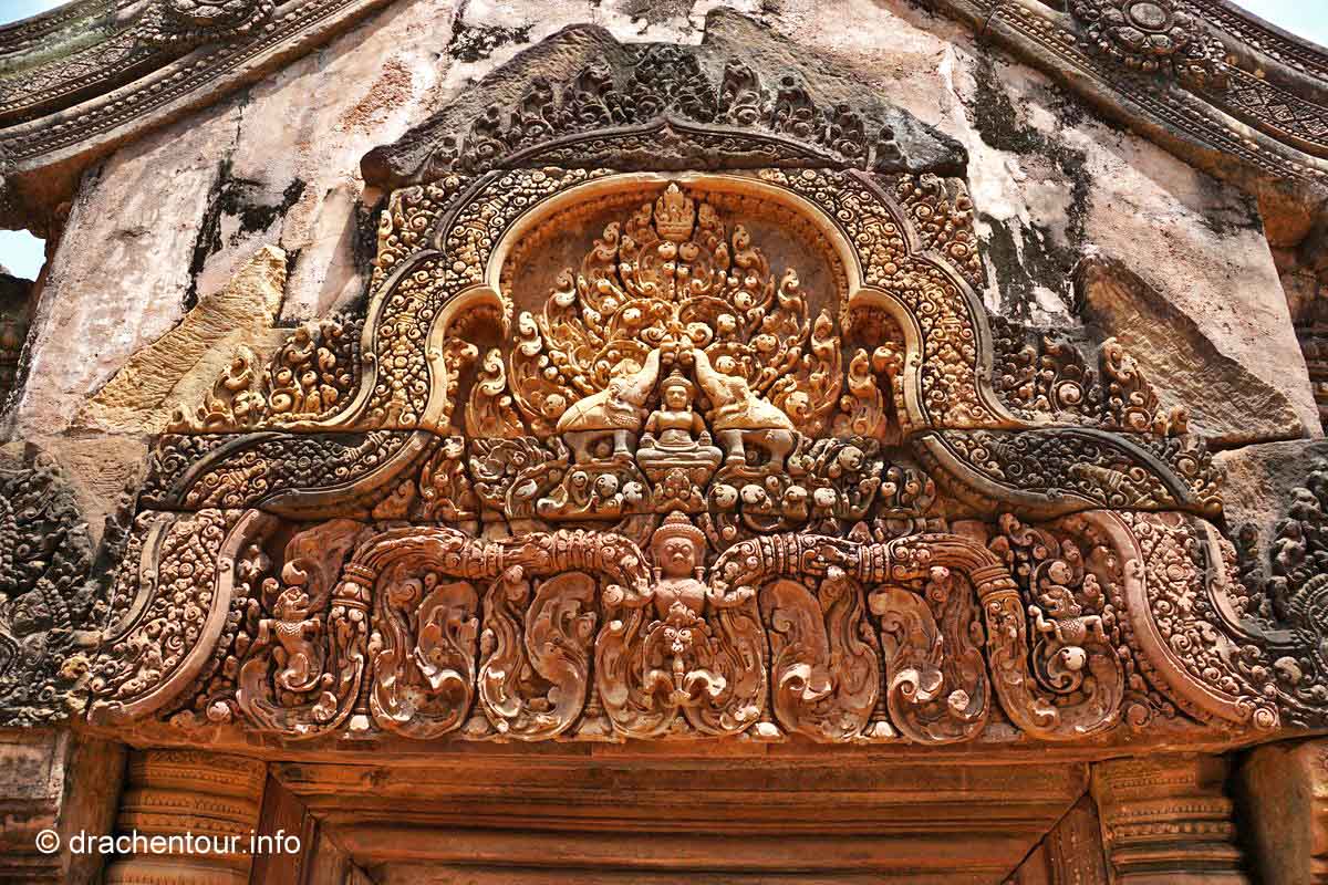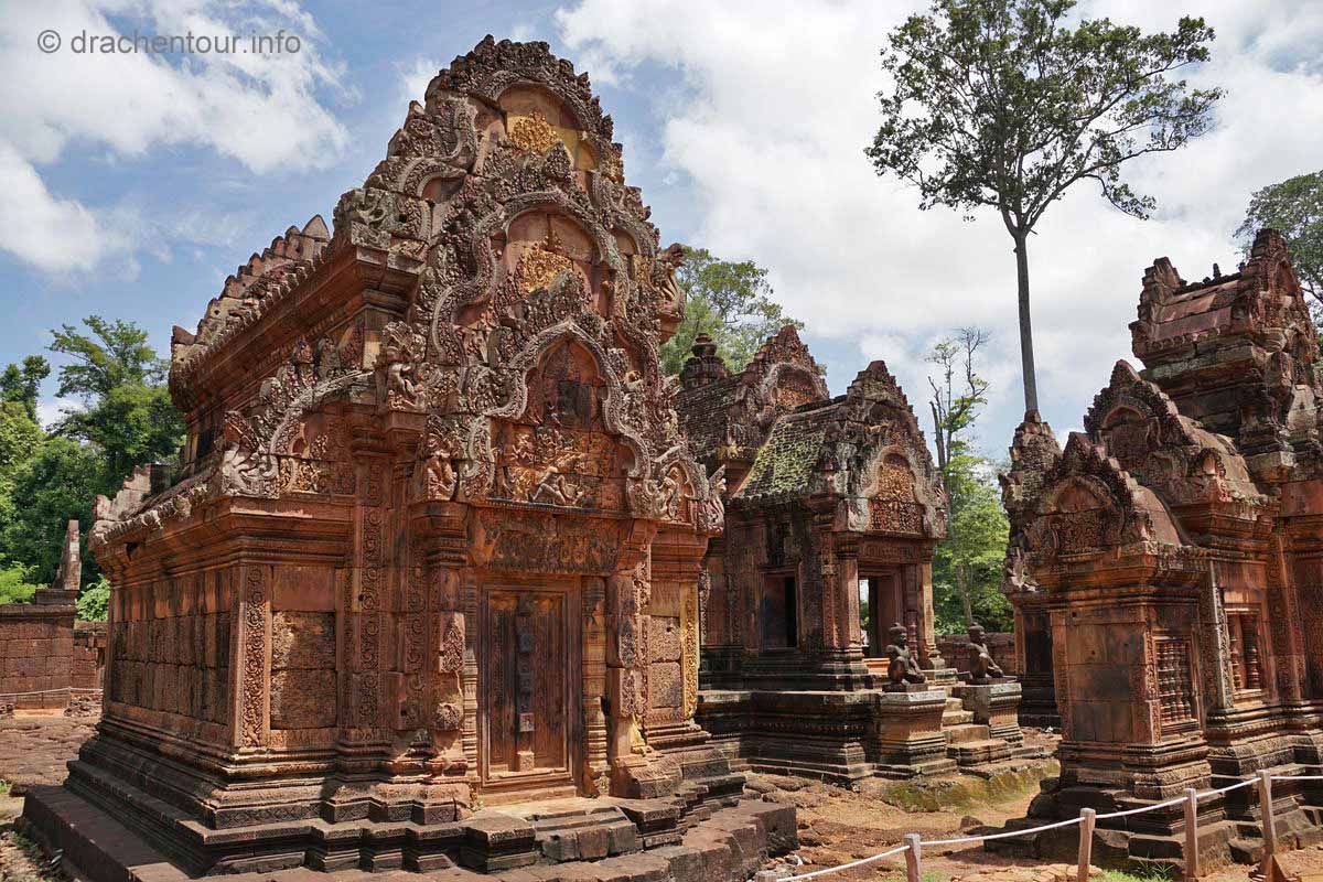 An unserem letzten Tag in Angkor besuchten wir Tempel, die etwas weiter entfernt von unserem Hotel lagen, weshalb wir für diese Tour ein Auto mit Fahrer mieteten. Nach dem Banteay Samre war der Banteay Srei, der sich ca. 30 Kilometer nordöstlich von Siem Reap befindet, unser begehrtes Ziel. Der kleine Tempel hebt sich mit seinem rosafarbenen Sandstein von dem ihn umgebenden grünen dichten Wald ab, er erstrahlt wie ein unwirklicher Feenpalast. Er wurde mit besonders schönen und tiefen Reliefs dekoriert, die überall zu sehen waren. Ständig entdeckten wir ein neues wunderschönes Bild und mussten es bildlich festhalten, da kann man sich ja vorstellen, dass uns eine Auswahl der Bilder für die Homepage ziemlich schwer fiel :-) !