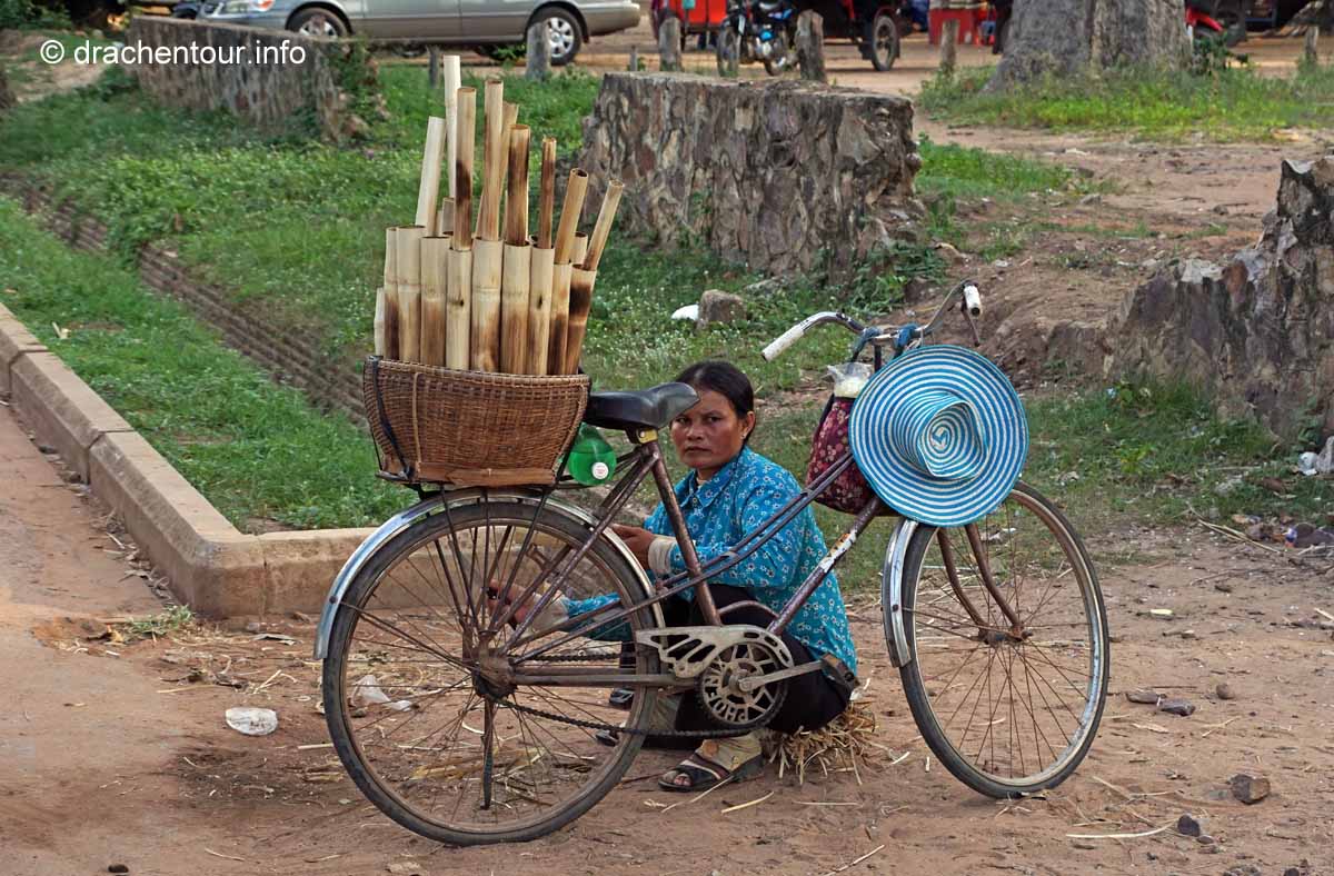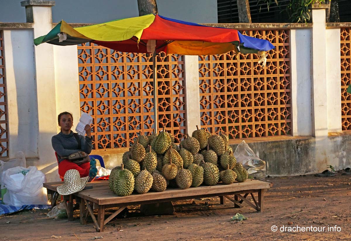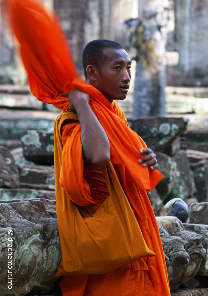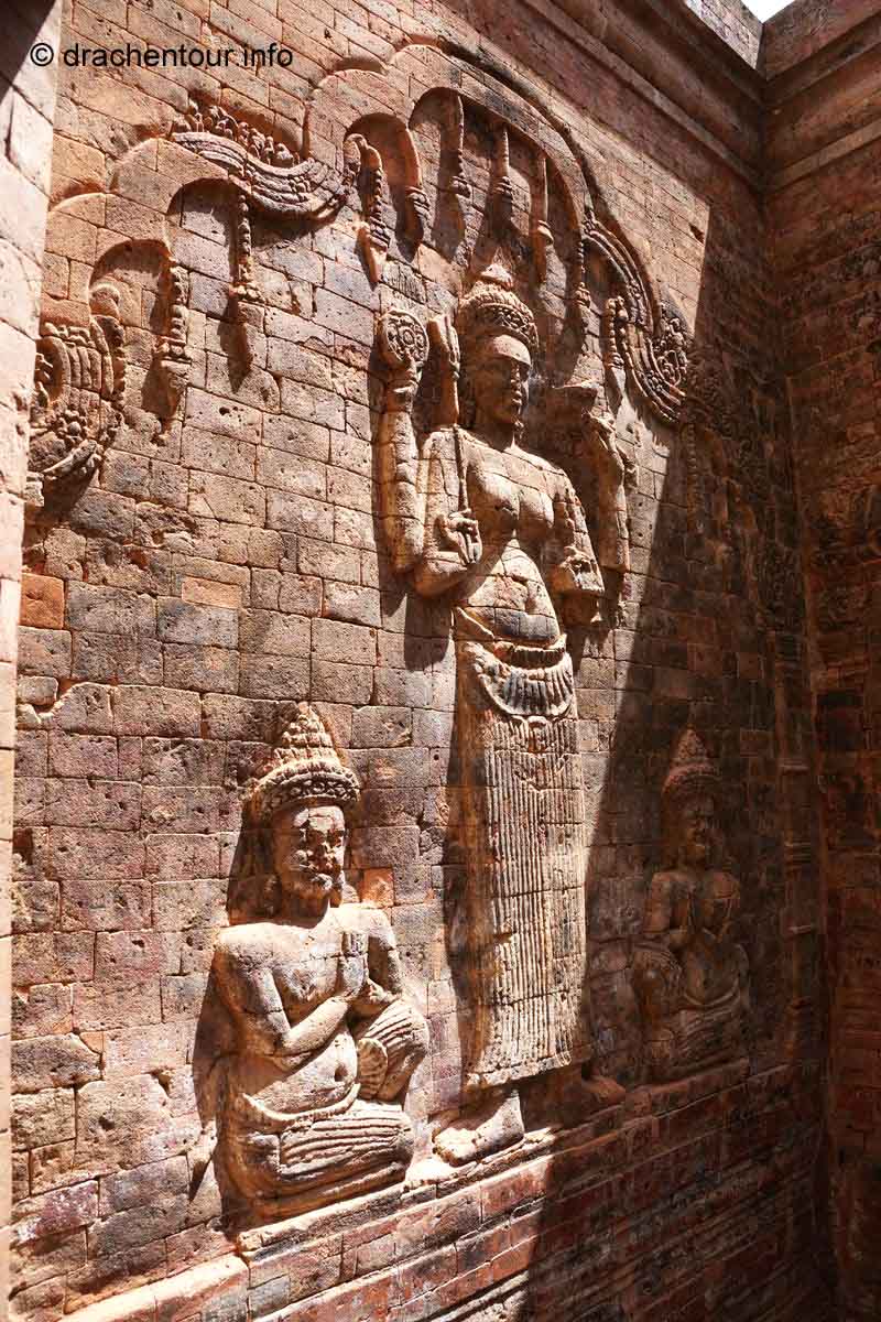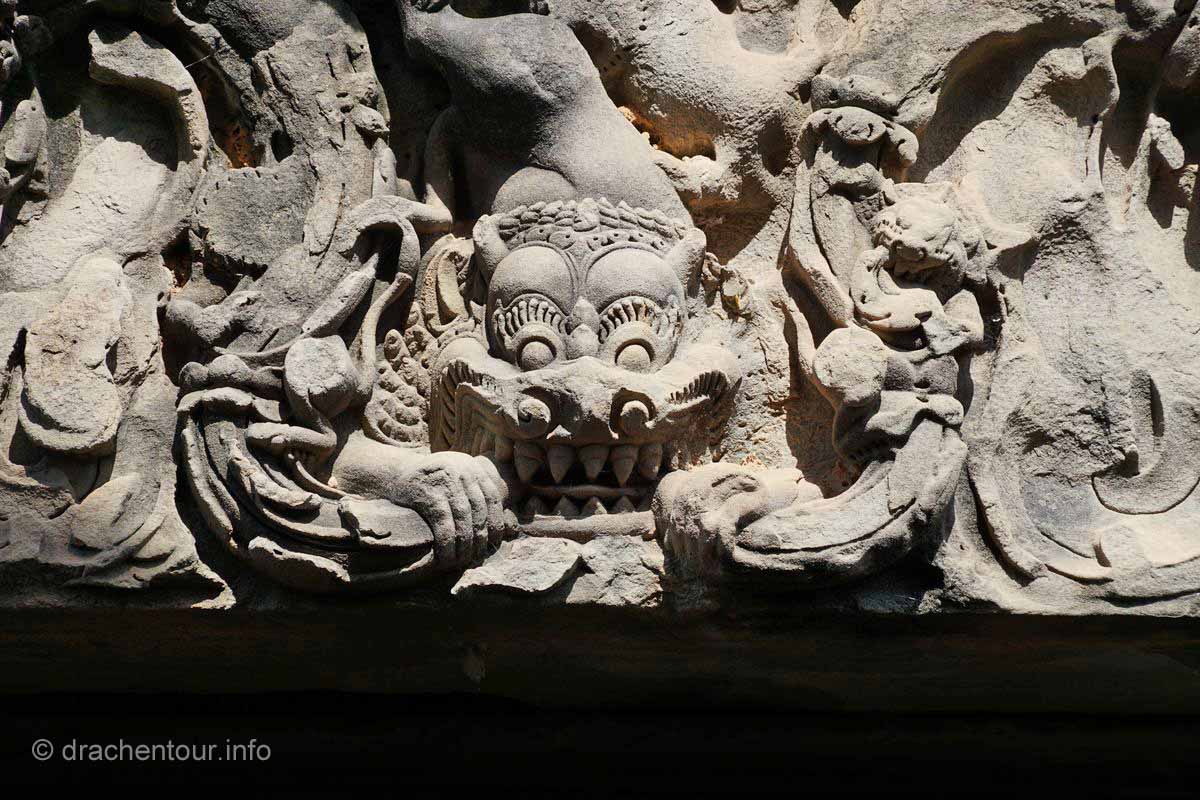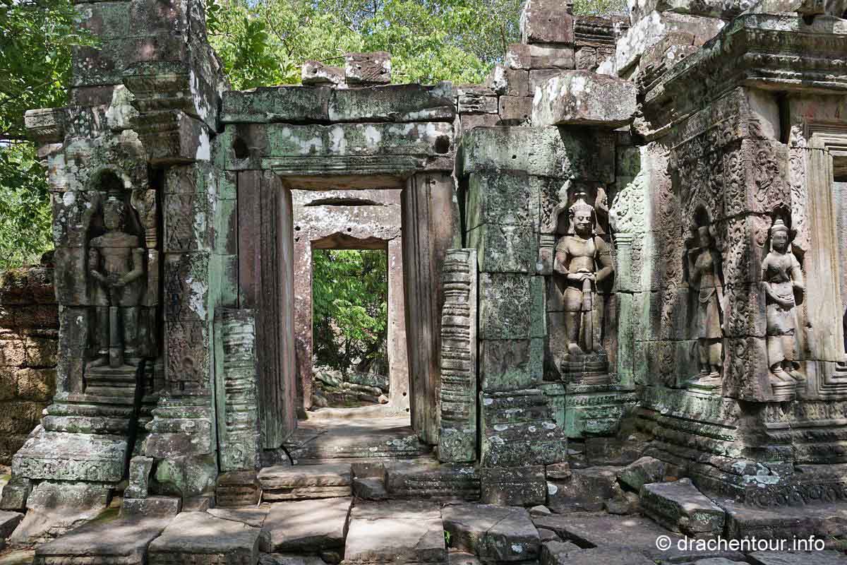 An unserem letzten Tag in Angkor besuchten wir Tempel, die etwas weiter entfernt von unserem Hotel lagen, weshalb wir für diese Tour ein Auto mit Fahrer mieteten. Nach dem Banteay Samre war der Banteay Srei, der sich ca. 30 Kilometer nordöstlich von Siem Reap befindet, unser begehrtes Ziel. Der kleine Tempel hebt sich mit seinem rosafarbenen Sandstein von dem ihn umgebenden grünen dichten Wald ab, er erstrahlt wie ein unwirklicher Feenpalast. Er wurde mit besonders schönen und tiefen Reliefs dekoriert, die überall zu sehen waren. Ständig entdeckten wir ein neues wunderschönes Bild und mussten es bildlich festhalten, da kann man sich ja vorstellen, dass uns eine Auswahl der Bilder für die Homepage ziemlich schwer fiel :-) !