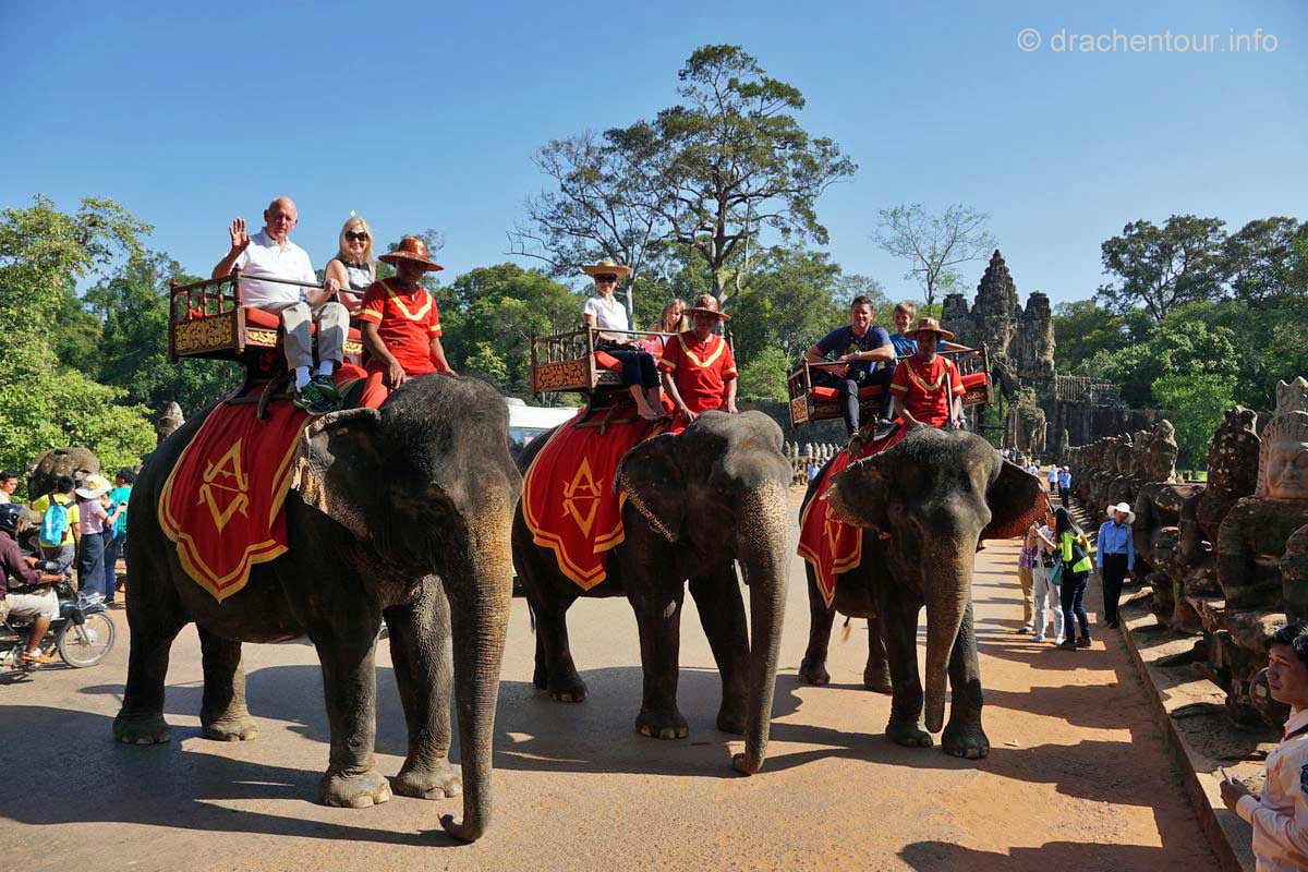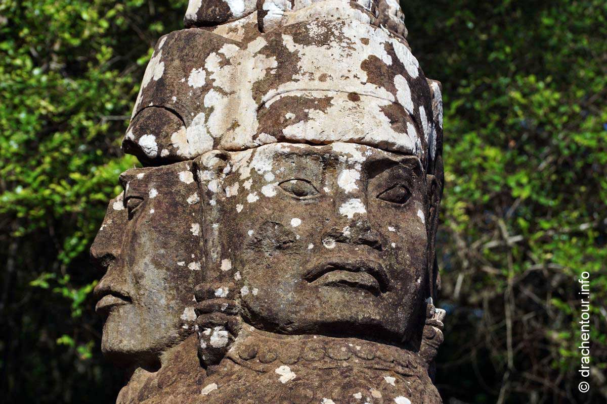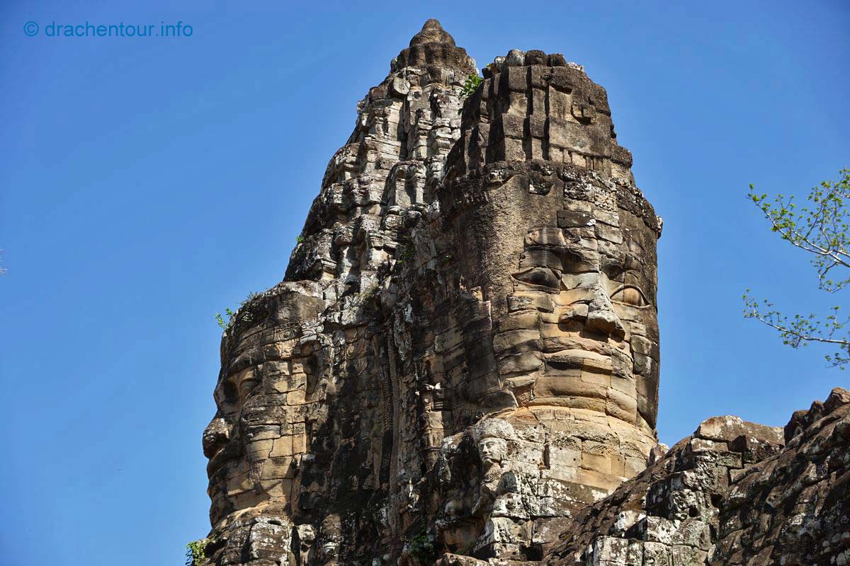 Schon besser gefällt uns der Blick zurück zum Süd-Tor, nachdem wir durchgelaufen waren. Es ist über 20 Meter hoch und geht oben in einen Turm über und dort oben sind vier große Gesichter eingemeißelt, die mit einem freundlichen Lächeln in die vier Himmelsrichtungen schauen. Am Fuße des Tores entdeckten wir Elefanten, die mit ihren langen Rüsseln Lotusblumen pflücken.