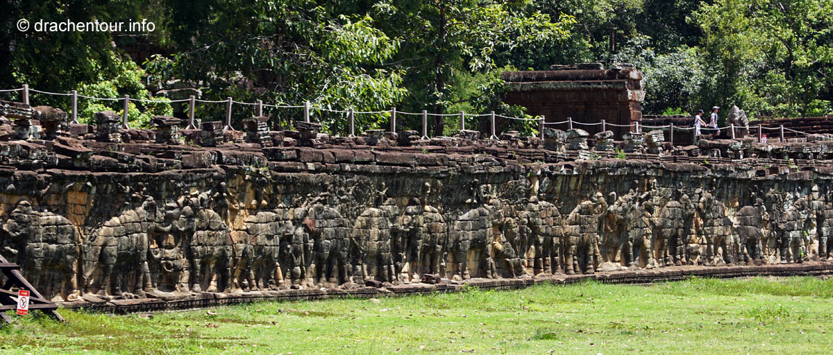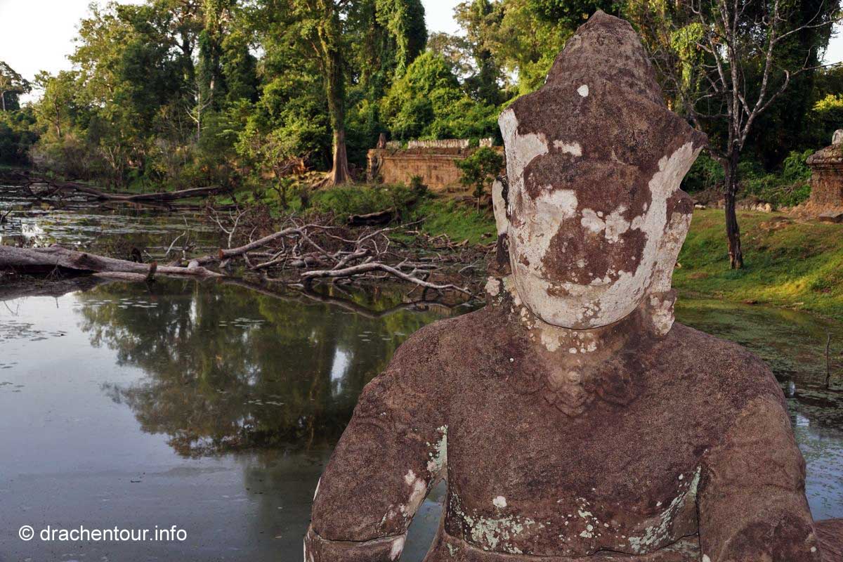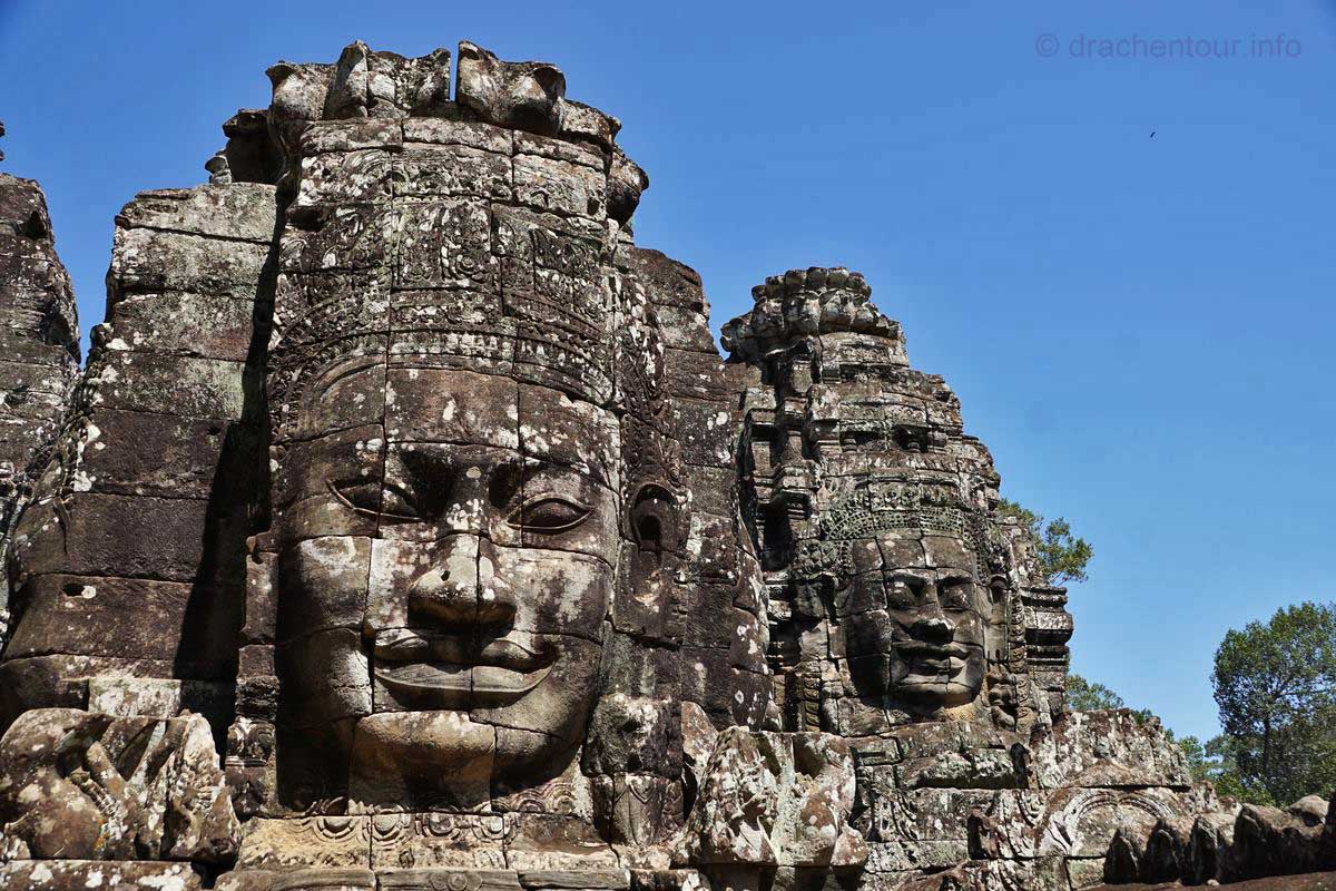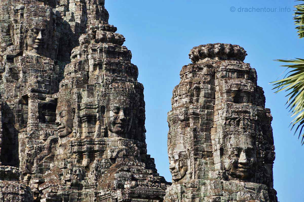 Schon besser gefällt uns der Blick zurück zum Süd-Tor, nachdem wir durchgelaufen waren. Es ist über 20 Meter hoch und geht oben in einen Turm über und dort oben sind vier große Gesichter eingemeißelt, die mit einem freundlichen Lächeln in die vier Himmelsrichtungen schauen. Am Fuße des Tores entdeckten wir Elefanten, die mit ihren langen Rüsseln Lotusblumen pflücken.