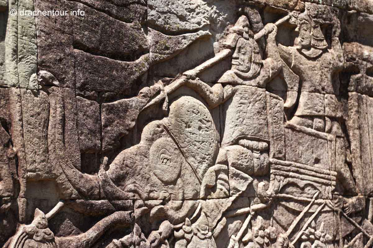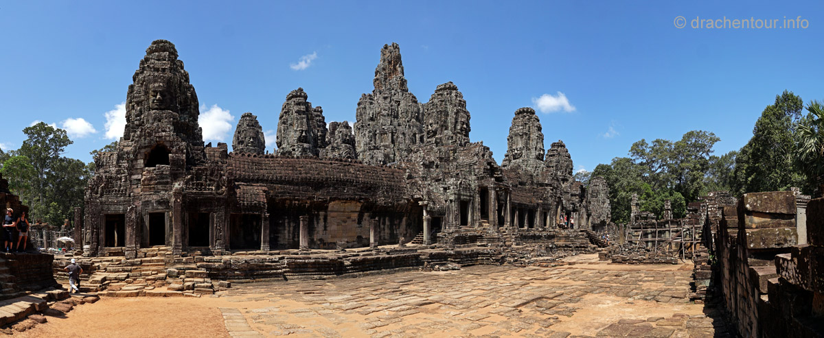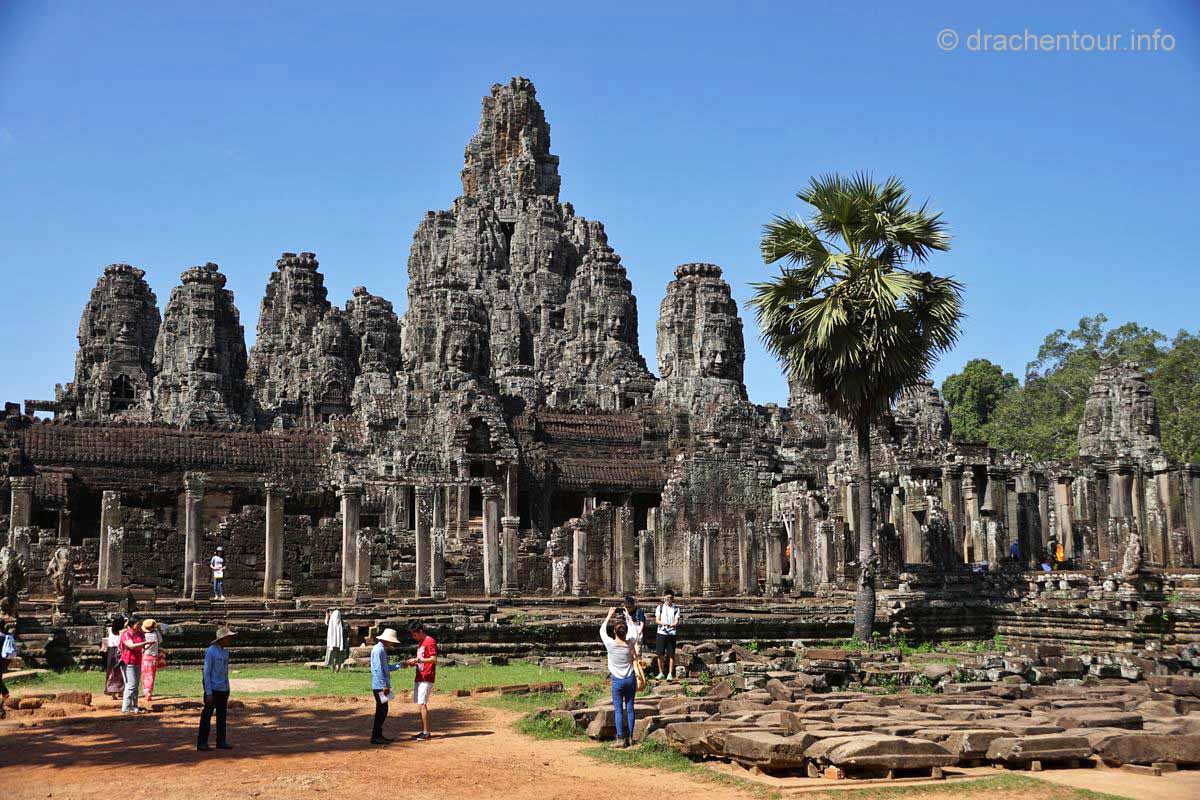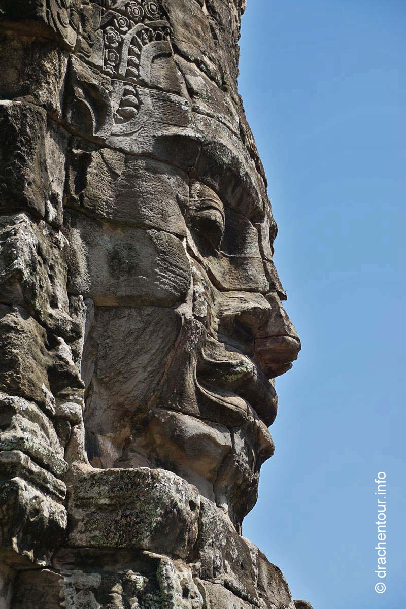 Im Mittelpunkt der quadratischen ca. 9 Quadratkilometer großen Stadt, die von einer hohen Mauer und einem hundert Meter breiten Wassergraben umgeben ist, und in der Anfang des 13. Jahrhunderts mehr Menschen als in jeder anderen europäischen Stadt lebten, steht unser nächstes Ziel, der berühmte Bayon-Tempel. Der Bayon ist der Tempel mit den vielen lächelnden Gesichtern, hier stehen 54 Türme und alle haben die vier Gesichter. Allerdings sprang der Funke der Faszination nicht wirklich auf uns über, lag es vielleicht daran, dass ich in schöner in Erinnerung hatte ( ich war bereits vor 15 Jahren schon einmal in Angkor ) oder vielleicht auch an den unglaublich vielen Touristen, die achtlos überall herumkletterten und in der Gegend herumbrüllten ( oder beides ). Diese Situation stimmte mich etwas nachdenklich und ich machte mir schon etwas Sorgen, wenn es den ganzen Tag so zugehen sollte, dann wäre das doch sehr schade !