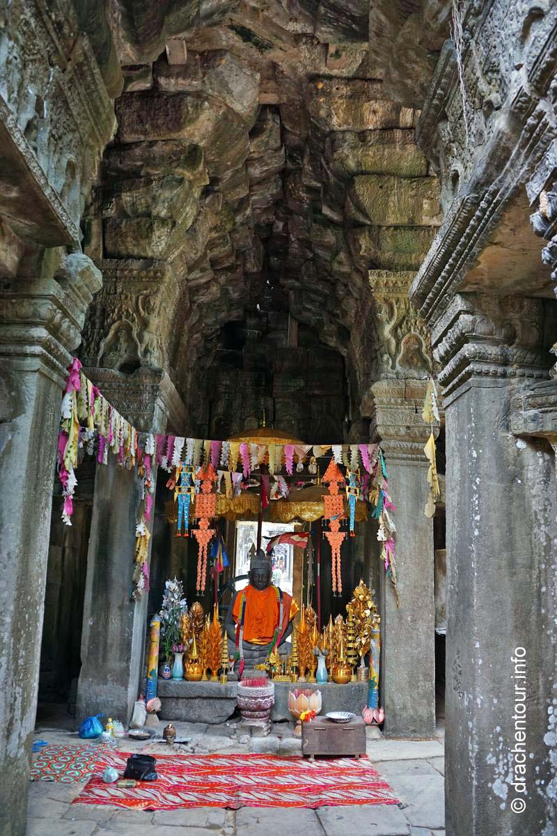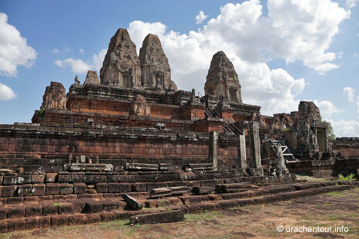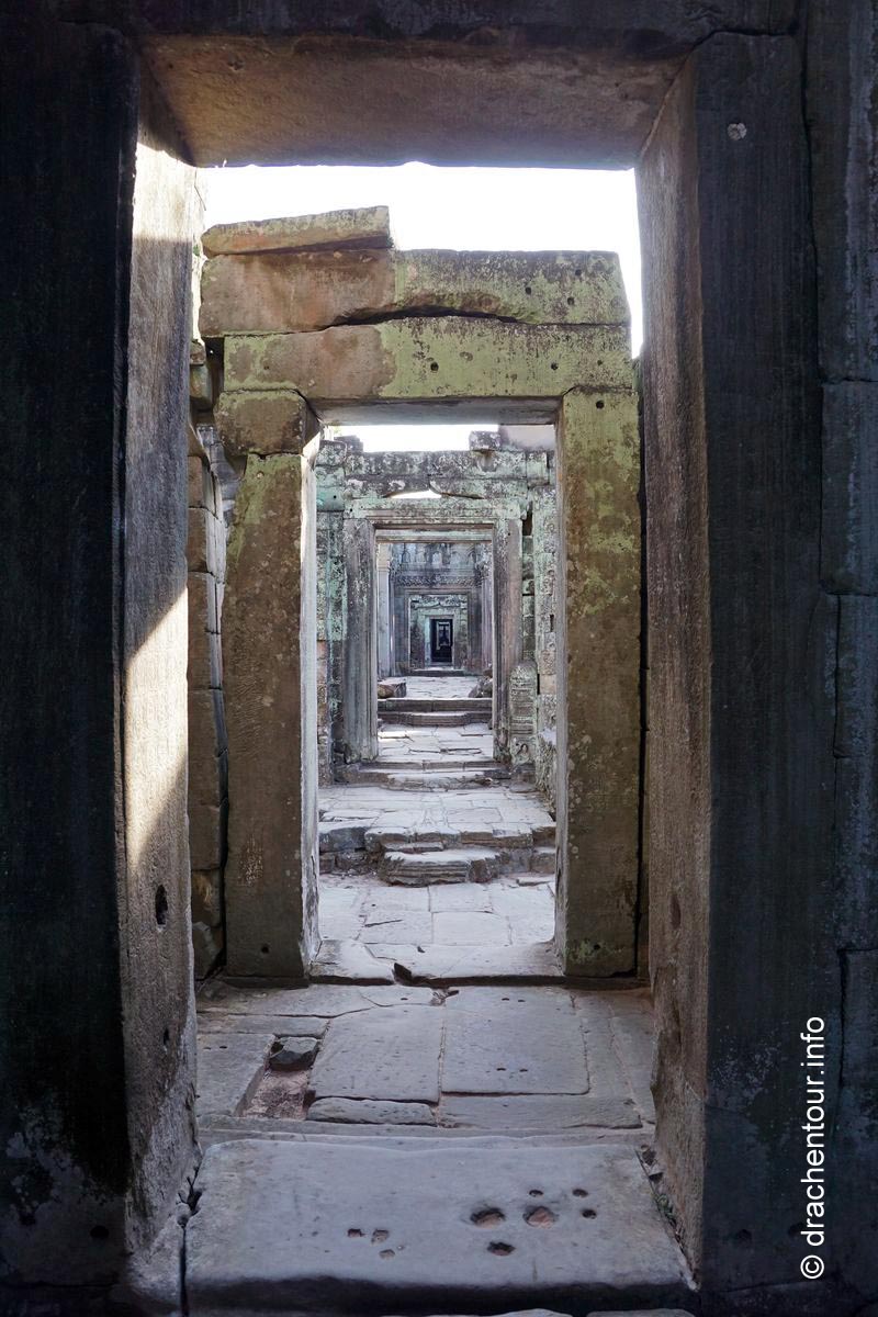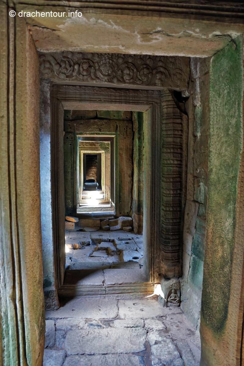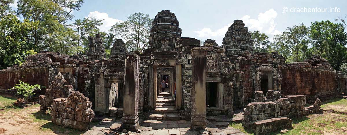 Danach kühlten wir uns im Pool ab und überlegten, welche Tempel wir noch am Nachmittag besichtigen wollten. Wir entschieden uns für die große Tour, allerdings stiegen wir nun auf das Tuk Tuk um, denn zu sehr schmerzte uns der Hintern von den unbequemen Sätteln der viel zu kleinen Fahrräder. Unser Fahrer holte uns vor dem Hotel ab und wir zeigten ihm dann, welche Anlagen er anfahren sollte, natürlich wieder antizyklisch zu den anderen Besuchern und dieses Mal klappte auch unsere Strategie und wir waren fast immer alleine – jipii ! Folgende Schmuckstücke haben wir aus der Fülle der Tempel ausgewählt : Prasat Kravan, Banteay Kdei, Sras Srang, Pre Rup, East Mebon, Ta Som, Neak Pean und Preah Khan. Jeder Tempel war einzigartig hatte etwas Besonderes zu entdecken. Mittlerweile war es bereits Abend und es wurde langsam dunkel und wir hatten nun wahrlich genug Tempel gesehen, so fuhren wir zu unserem Hotel, plantschten eine Runde im Pool und mussten erstmal die ganze Pracht der heutigen Erlebnisse Revue passieren lassen, es ist unglaublich, wie die Menschen in der damaligen Zeit ohne maschinelle Hilfe solche Wunderwerke errichten konnten !