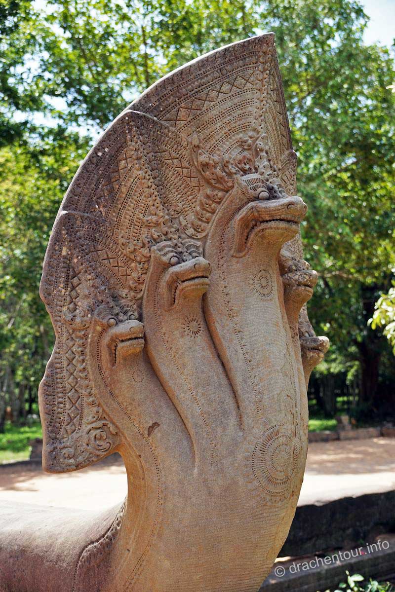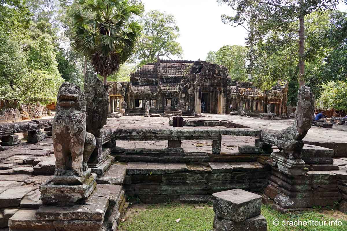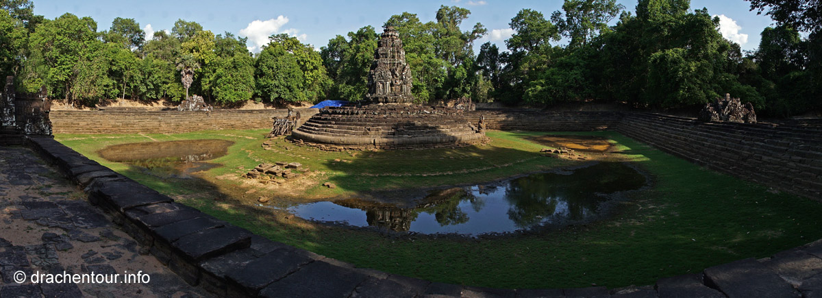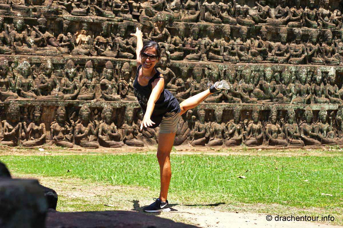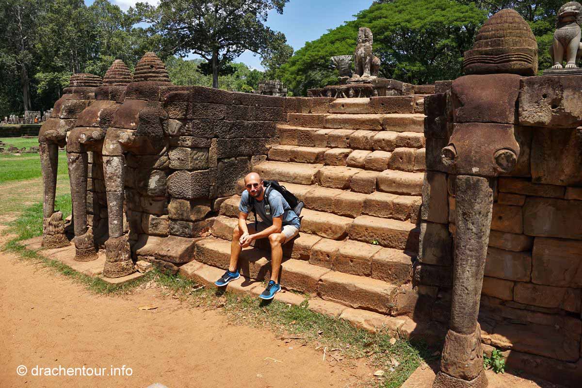 Weiter radelten wir zum Königspalast und zu seinen ihn umgebenden Bauwerken, hiervon ist allerdings nicht mehr wirklich viel erhalten, weil die weltlichen Gebäude aus Holz errichtet wurden, lediglich die Elefantenterrasse und die Terrasse des Lepra Königs sind noch recht gut in Schuss. Mittlerweile war es auch schon sehr heiß, d.h. weit über 40 Grad und wir brauchten dringend eine Pause von den Tempeln, so radelten wir die zehn Kilometer zurück zu unserem Hotel und sprangen voller Freude in den Pool und entspannten uns ein wenig im Garten, bevor wir uns wieder in den Sattel schwangen, um nochmals zu den Tempeln zu fahren.