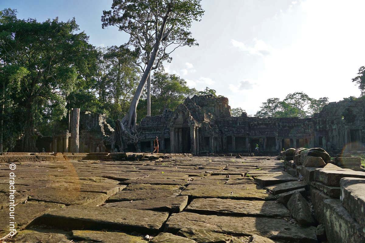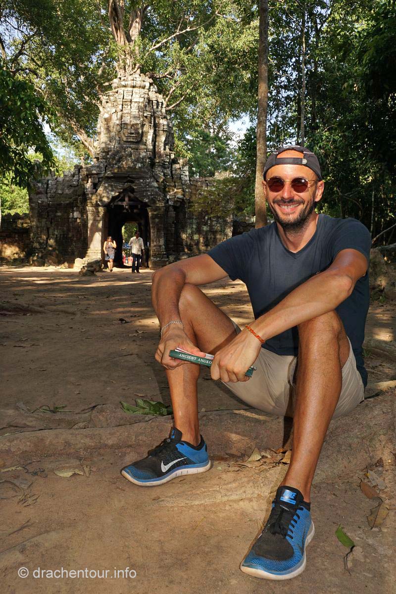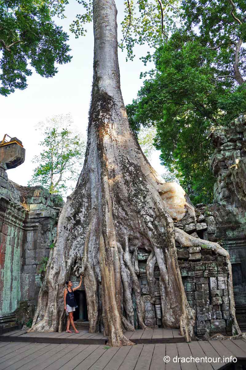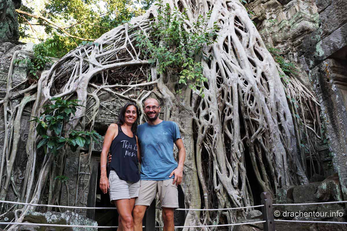 Unser Weg führte uns erneut am Bayon vorbei und endete dann im Ta Phrom, der seit dem Film Tomb Raider weltbekannt ist. Er wird auch als " Dschungel-Tempel " bezeichnet, da die von Bäumen und Pflanzen umwachsenen Ruinen nicht freigelegt wurden. Kurz vor Schließung der Anlage gewährte uns der Wächter noch Einlass, und dass war unser großes Glück, wir waren alleine und es herrschte eine traumhafte Stille, so dass der Zauber auf uns übersprang. Auf dem Weg zum Tempel ertönte dann plötzlich über uns eine gewaltige Geräuschkulisse - ne, nein nicht die Chinesen :-) - es handelte sich um das Zirpen der Zikaden. Wir liefen weiter und wir waren begeistert von dem, was unsere Augen erblicken durften : immer wieder sahen wir Gebäude mit riesigen Würgefeigen, welche die alten Mauern mit ihren kräftigen Wurzeln gleichzeitig sprengten und doch fest umklammerten – fantastisch ! Alles war perfekt - wir genossen und vergaßen die Zeit komplett. Von dem Wächter wurden wir dann aus unserer Welt gerissen, denn er suchte uns bereits, weil der Tempel seit über einer halben Stunde geschlossen war. Berauscht von den magischen Eindrücken radelten wir vergnügt nach Hause.