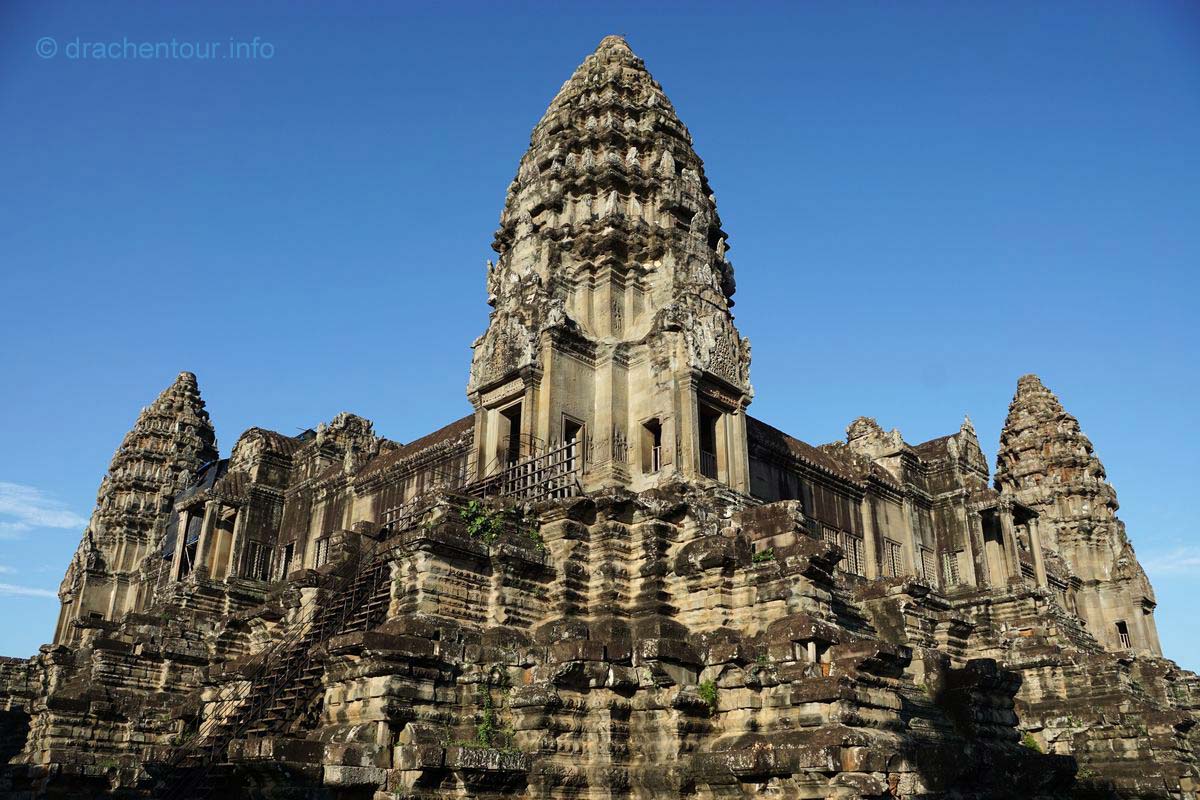 Denn das Letztere stand noch heute auf unserer " to-do-Liste ", wir erarbeiteten uns einen guten Besichtigungsplan für die Tempelanlagen von Angkor Wat. Da hatten wir noch richtig was zu tun, denn es gibt nur wenige Orte der Erde, die dem überwältigenden Ausmaß der Bauwerke von Angkor Wat das Wasser reichen können. Das Areal, auf dem sich neben zahlreichen Tempelanlagen und Überreste der verschiedenen Hauptstädte der Khmer, auch dichte wunderschöne Wälder zu finden sind, breitet sich auf einer Fläche von über 400 Quadratkilometer aus. Diese Vielfalt an höchst interessanten archäologischen Bauwerken sind hauptsächlich dem König Yasoyarman I zu verdanken, denn er ließ riesige Bewässerungsanlagen bauen, die es dem Volk ermöglichten hohe landwirtschaftliche Erträge zu erzielen. Das bedeutet, genug Nahrung, dies führte zu Macht und Wohlstand und die Khmer ergriffen diese Chance und bauten Tempel und große Städte, das zog sich über einige Jahrhunderte hinweg