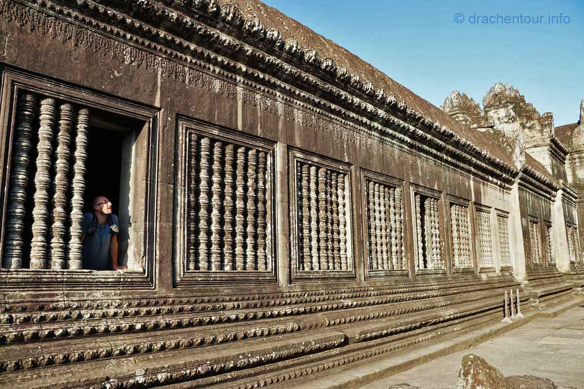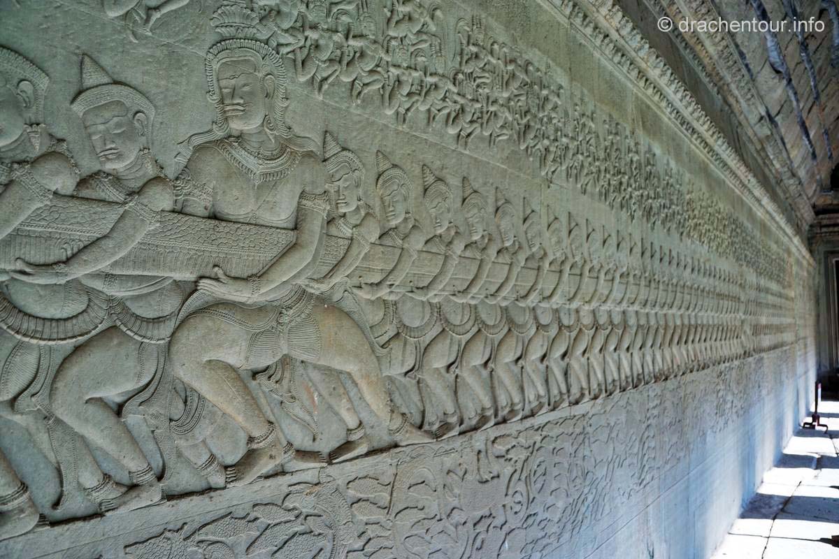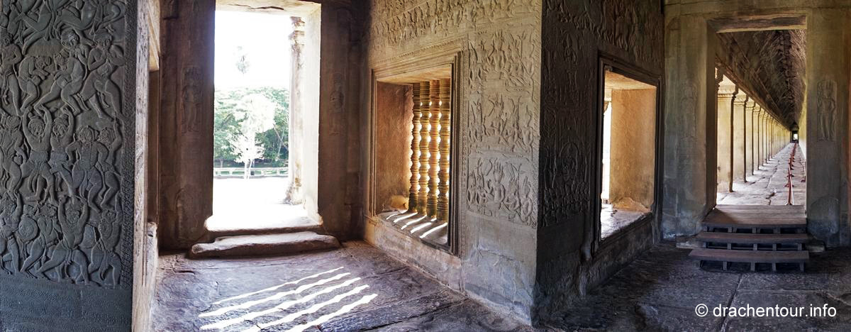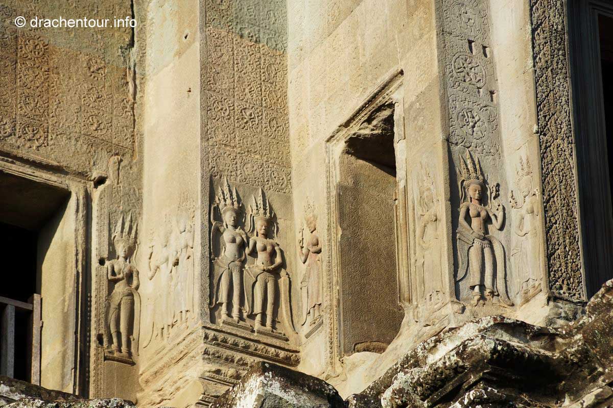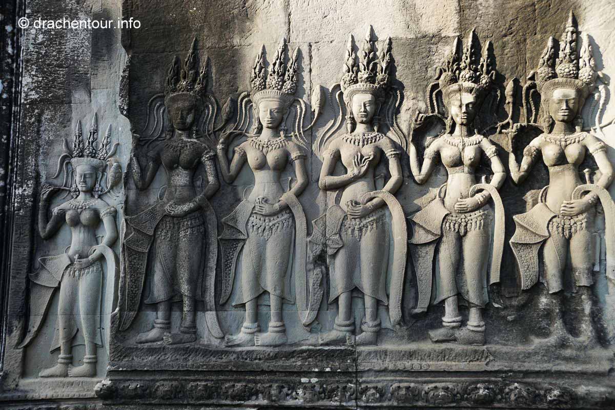 Langsam kamen wir mit unseren Gedanken wieder zurück auf die Wiese und stellten freudig fest, dass wir so gut, wie alleine waren – super ! So beschlossen wir, obwohl wir müde und hungrig waren, die Gunst der frühen Stunde zu nutzen, um den Tempel zu besichtigen. Dieser Haupttempel ist weltweit einer der größten religiösen Stätten und ist bis heute einer der besten erhaltenen Tempel der Region Angkor. Nun kurz eine kleine Zusammenfassung : der König Suryavarman II lies Angkor Wat als Tempel und Mausoleum im 12.Jahrhundert errichten, er gehörte dem Vishnuismus an und deshalb war Angkor Wat anfangs eine Verehrungsstätte des Gottes Vishnu. Erst später, im 13.Jahrhundert, als unter dem König Jayavarman VII der Buddhismus Einzug ins Land hielt, wurde Angkor Wat in einen buddhistischen Tempel umgewandelt. Besonders eindrucksvoll sind die Flachreliefs an den Wänden, die Szenen des Königs Suryavarman II und seine Kriegszüge, sowie Szenen aus dem Hinduismus darstellen. Sie erzählen quasi ganze Geschichten in einer Art Comic, die wir versuchten zu interpretieren. Viel mehr waren wir aber von der sagenhaften Arbeit, d.h die Präzision der gemeißelten Bilder und das hohe Niveau der Kunst überhaupt fasziniert, es waren 3D Bilder - unglaublich, was die Menschen hier an die Wand gezaubert haben. Grandios fanden wir die in Stein gehauenen Apsaras, das sind Figuren von barbusigen Tänzerinnen, alle sind unterschiedlich und wunderschön ! Wir verbrachten einige Stunden im Tempel ( mit nur ganz wenigen Touristen :-) ), vor allem in den Galerien, deren Wände von den traumhaft schönen Reliefs geschmückt sind und bewunderten die spitzenmäßigen Zeugnisse der Vergangenheit der Khmer. Anschließend radelten wir wieder zurück ins Hotel, um hungrig über das ausgezeichnete Frühstück herzufallen.