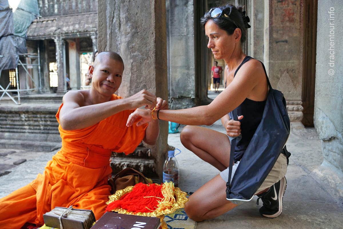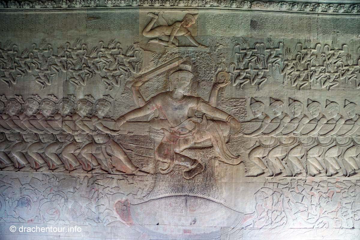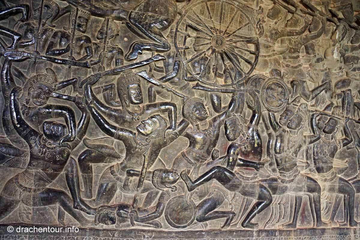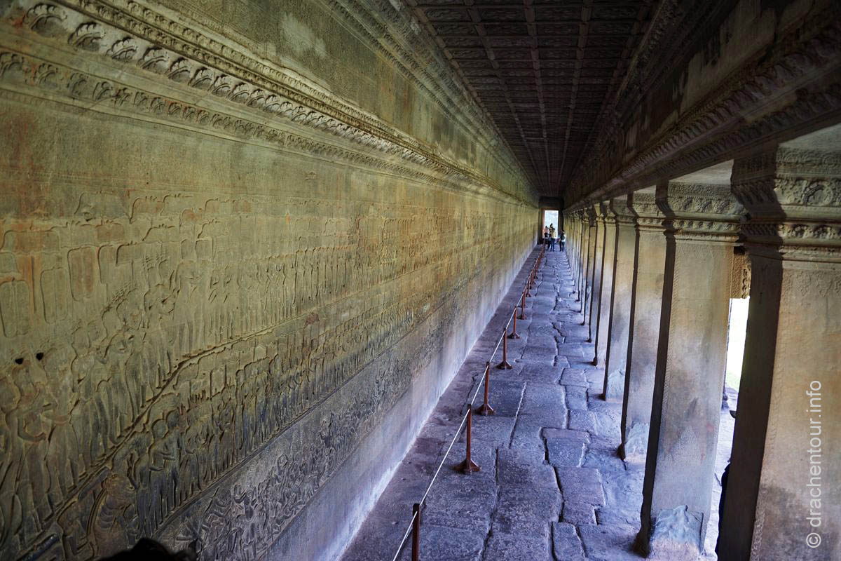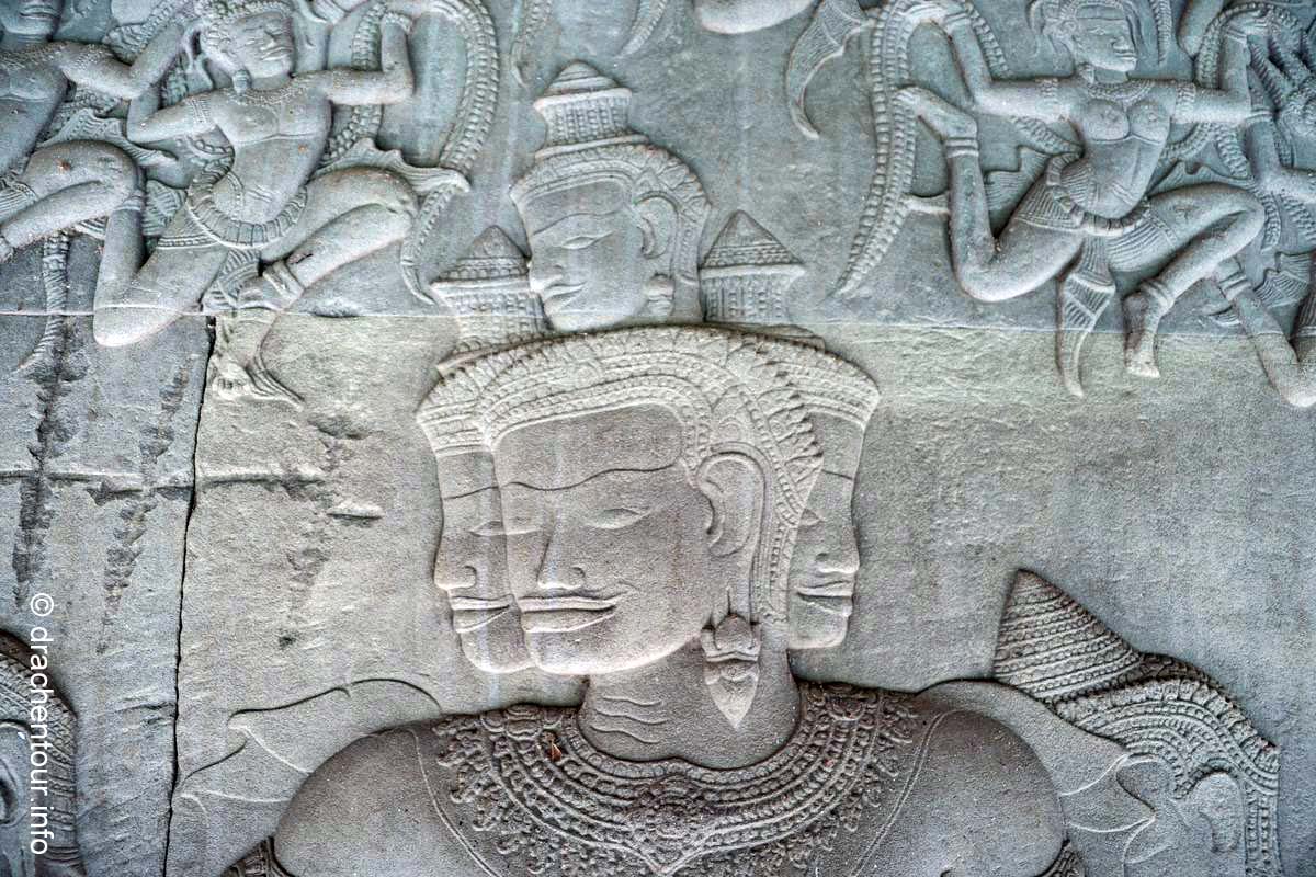 Langsam kamen wir mit unseren Gedanken wieder zurück auf die Wiese und stellten freudig fest, dass wir so gut, wie alleine waren – super ! So beschlossen wir, obwohl wir müde und hungrig waren, die Gunst der frühen Stunde zu nutzen, um den Tempel zu besichtigen. Dieser Haupttempel ist weltweit einer der größten religiösen Stätten und ist bis heute einer der besten erhaltenen Tempel der Region Angkor. Nun kurz eine kleine Zusammenfassung : der König Suryavarman II lies Angkor Wat als Tempel und Mausoleum im 12.Jahrhundert errichten, er gehörte dem Vishnuismus an und deshalb war Angkor Wat anfangs eine Verehrungsstätte des Gottes Vishnu. Erst später, im 13.Jahrhundert, als unter dem König Jayavarman VII der Buddhismus Einzug ins Land hielt, wurde Angkor Wat in einen buddhistischen Tempel umgewandelt. Besonders eindrucksvoll sind die Flachreliefs an den Wänden, die Szenen des Königs Suryavarman II und seine Kriegszüge, sowie Szenen aus dem Hinduismus darstellen. Sie erzählen quasi ganze Geschichten in einer Art Comic, die wir versuchten zu interpretieren. Viel mehr waren wir aber von der sagenhaften Arbeit, d.h die Präzision der gemeißelten Bilder und das hohe Niveau der Kunst überhaupt fasziniert, es waren 3D Bilder - unglaublich, was die Menschen hier an die Wand gezaubert haben. Grandios fanden wir die in Stein gehauenen Apsaras, das sind Figuren von barbusigen Tänzerinnen, alle sind unterschiedlich und wunderschön ! Wir verbrachten einige Stunden im Tempel ( mit nur ganz wenigen Touristen :-) ), vor allem in den Galerien, deren Wände von den traumhaft schönen Reliefs geschmückt sind und bewunderten die spitzenmäßigen Zeugnisse der Vergangenheit der Khmer. Anschließend radelten wir wieder zurück ins Hotel, um hungrig über das ausgezeichnete Frühstück herzufallen.