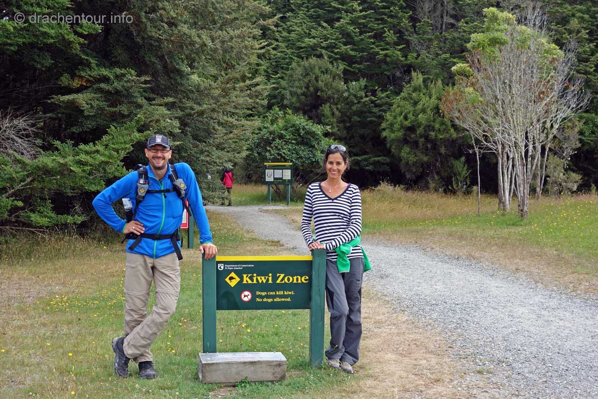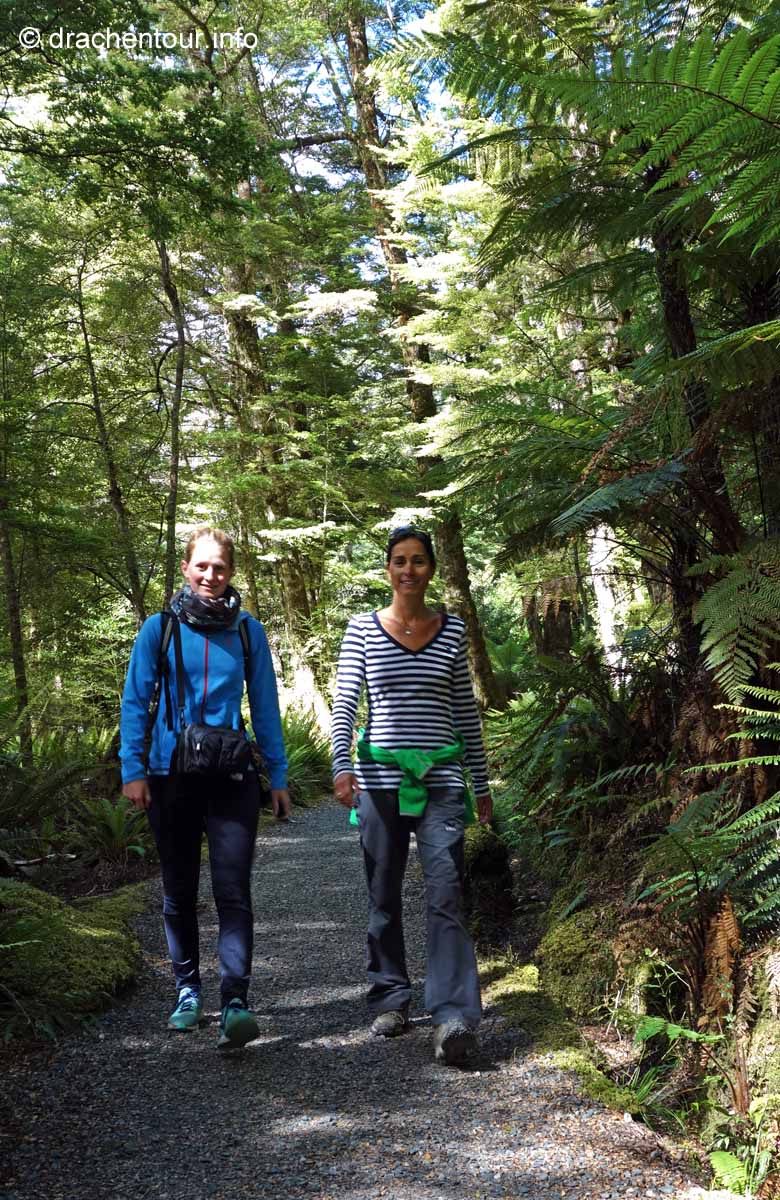 Unser Campingplatz liegt nur 5 km vom berühmten “ Kepler Track “ entfernt und so war es glasklar, dass wir zumindest einen Teil dieser Wanderung, die eine der "Great Walks" von Neuseeland ist, begehen wollten. Also hieß es den Rucksack packen und die Wanderschuhe schnüren. Wir starteten gemütlich auf einem sehr schönen Weg entlang des Seeufers bis wir zum eigentlichen Startpunkt des Tracks gelangten. Unser Ziel war die Luxmore Hut auf ca. 1100 m, von wo aus man einen tollen Blick auf einen Teil des Fjordlandes haben soll. Zunächst folgten wir einem sehr gut ausgebauten Weg, über überbrückte Bäche und Holzstege und Treppen, dabei bewunderten wir die vielfältige Flora des Waldes: von Moosen behangene Buchen und eine Fülle von Farnen und Aufsitzerpflanzen - wir fühlten uns wie im Dschungel. Unterbrochen wurde das grüne Dickicht durch kleine romantische Strände am Ufer des Lake Te Anaus, die wir nur mit Sandfliegen ( diese garstigen Viecher ) teilen mussten.