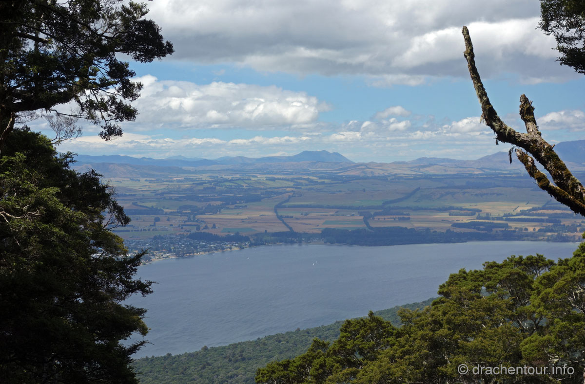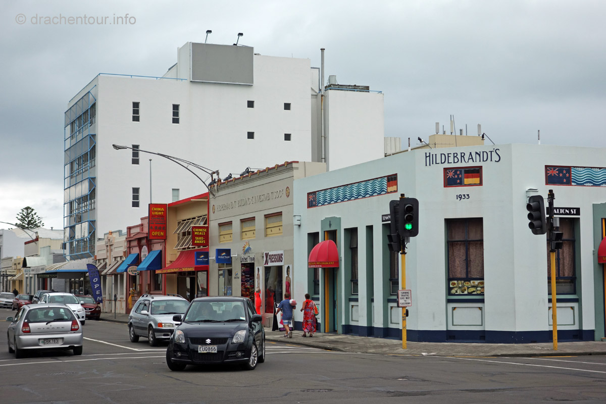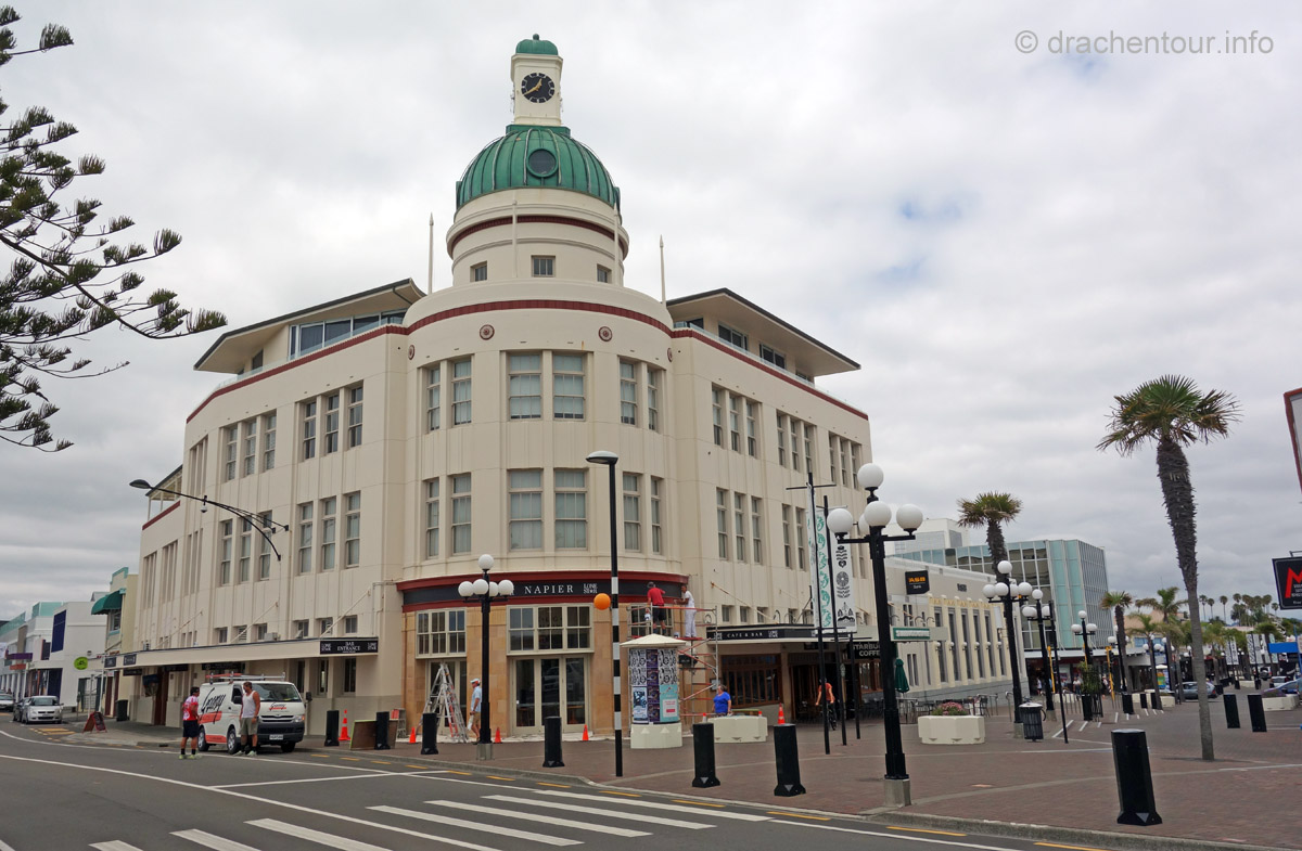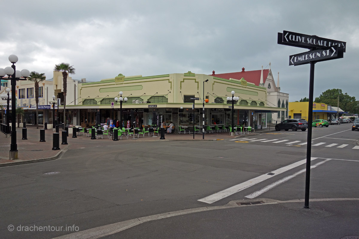 Weiter ging unsere Fahrt zu unserem nächsten Ziel, dem Lake Taupo. Unterwegs kamen wir allerdings noch an dem interessanten und schönen Ort Napier vorbei, so hielten wir spontan an und unternahmen einen kurzen Stadtbummel durch die niedlichen Gässchen. Dieser Stopp war auch echt sehr lohnend, denn Napier hat eine äußerst bewegte Geschichte hinter sich. Alles war relativ normal bis 1931, denn dann erschütterte ein schlimmes Erdbeben die gesamte Region. Dieses plus das anschließende Großfeuer zerstörte das Örtchen vollständig ! Die Bewohner und auch viele andere Neuseeländer ließen sich nicht unterkriegen und erschufen die Stadt Napier neu in einem „ Art Déco-Stil “. So erstrahlt die Stadt in einem besonderen Glanz mit schönen pastellfarbenen Häusern und den üblichen Merkmalen des Stils.
