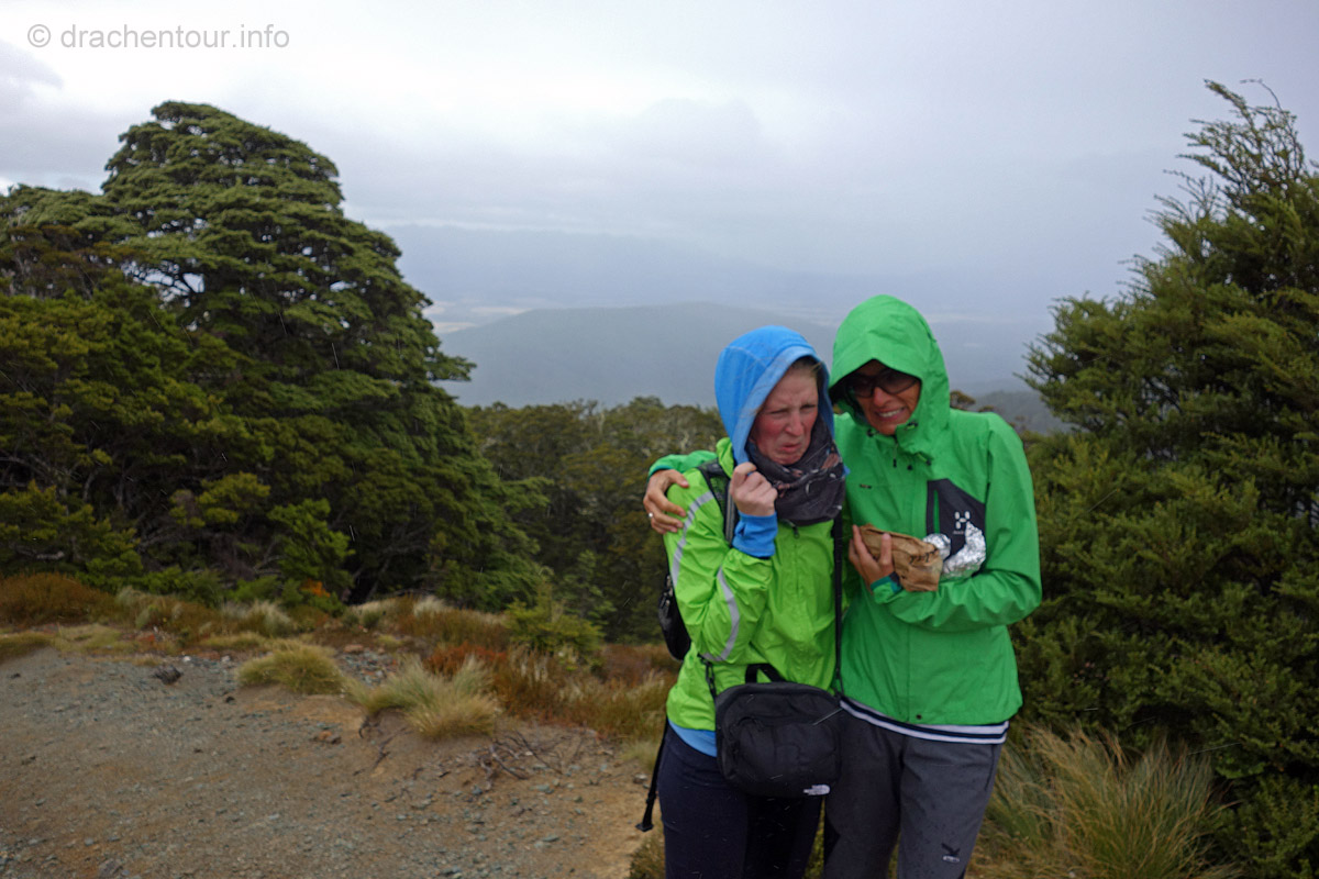Nach drei Stunden einfachen Wanderns wurde es etwas anstrengender, denn es ging nun ganz schön bergauf, aber die Aussicht, einen tollen Blick auf die Landschaft zu ergattern, spornte uns an. Dennoch zog sich der Aufstieg ganz schön in die Länge, aber wir liefen tapfer weiter und konnten die ersten Ausblicke genießen, allerdings waren wir noch immer von dichtem Wald umgeben, so hofften wir die Waldgrenze bald erreicht zu haben. Dem war auch so, allerdings hatte uns die angekündigte Regenfront ebenfalls erreicht und zeitgleich mit dem Ankommen am Aussichtspunkt zog der Himmel zu und es begann zu regnen und wir konnten außer einer grauen Suppe nichts sehen - Schade eigentlich. So machten wir uns auf den Heimweg, leider regnete es immer noch in Strömen und wir waren bis auf die Knochen nass. Als wir endlich den Startpunk vom Kepler Track wieder erreicht haben, wollten wir nicht noch die Strecke um den See zu unserem Campingplatz laufen, so fragten wir zwei "crazy Kiwis" ( mit Auto, die gerade eine vier tägige Wanderung beendeten und ebenso patschnass wie wir ), ob sie uns mit nach Te Anau nehmen konnten. Sie konnten nicht nein sagen und wir waren happy, endlich ins Trockene zu kommen.