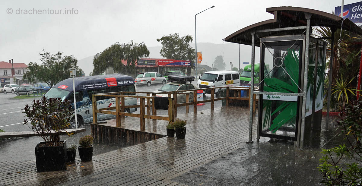 Heute Morgen wurden wir durch das Prasseln der Regentropfen auf unserem Juicy-Dach geweckt, das heißt die Schlechtwetterfront hing noch über uns – ufff ! Glücklicherweise ließ der Regen dann aber doch schnell nach, so dass wir im Freien - wenn’s auch kalt war - frühstücken konnten ! Gut gestärkt starteten wir in unseren langen "Juicytag" und fuhren zunächst dieselbe Straße über Queenstown zurück nach Wanaka, welches am gleichnamigen See liegt. In diesem verschlafenen und nicht besonders sehenswerten Örtchen legten wir einen kurzen Stopp ein und bummelten durch die Straßen. Weiter ging es dann durch eine herrliche leicht hügelige Landschaft bis zu einem schönen Campingplatz ( mit einem ausgedienten Hangar als Küche und Toilettenbereich ) bei Haast, wo wir eine Nacht verbringen wollten. Denn mittlerweile war es bereits früher Abend und wir wollten auch echt nicht mehr im Bus sitzen, so erholten wir uns etwas und gönnten uns ein leckeres Abendessen - Wraps + eine riesen Schüssel Salat - lecker.