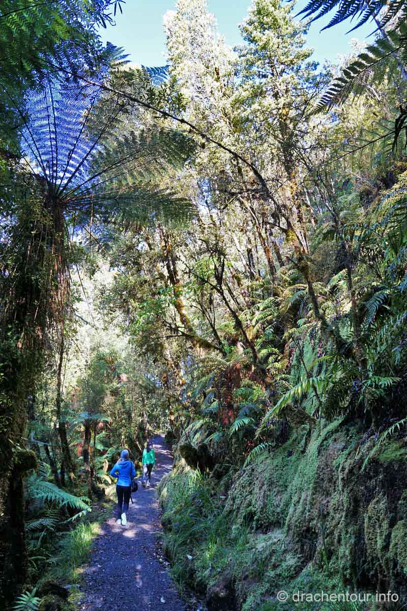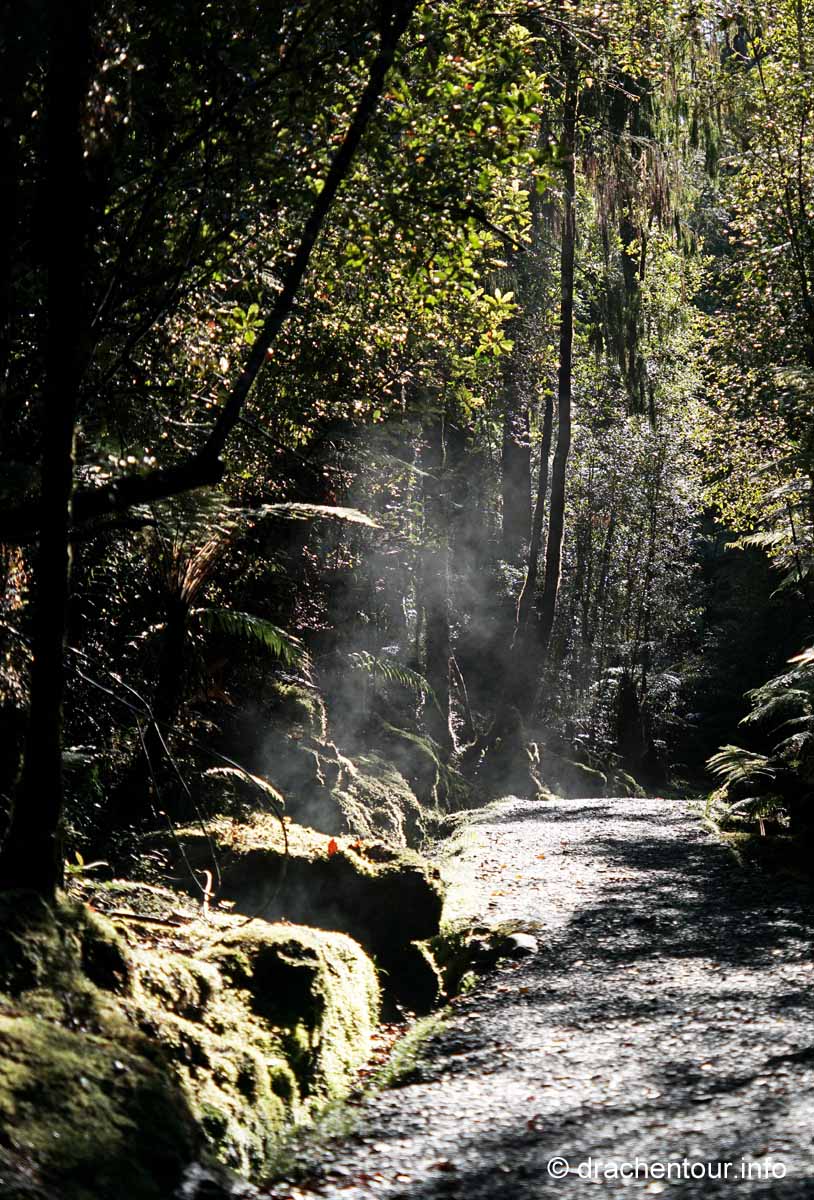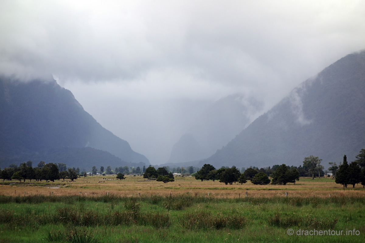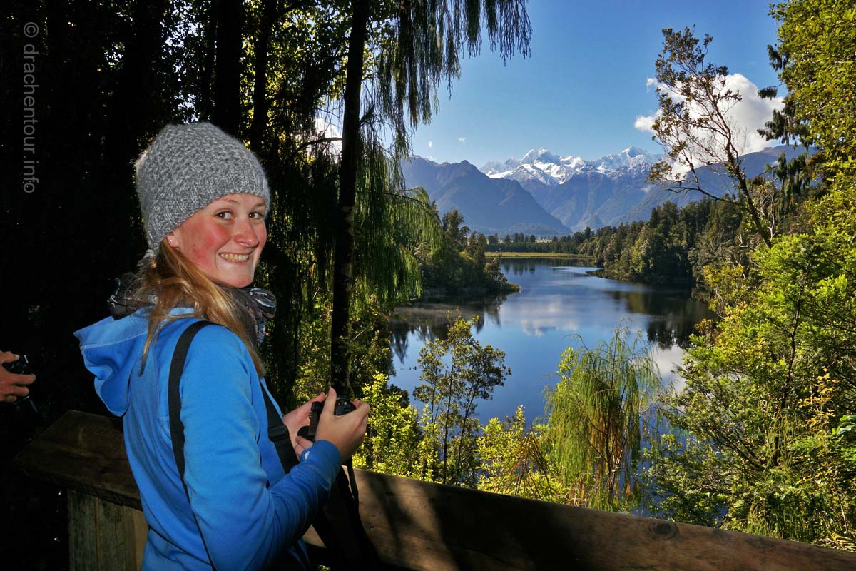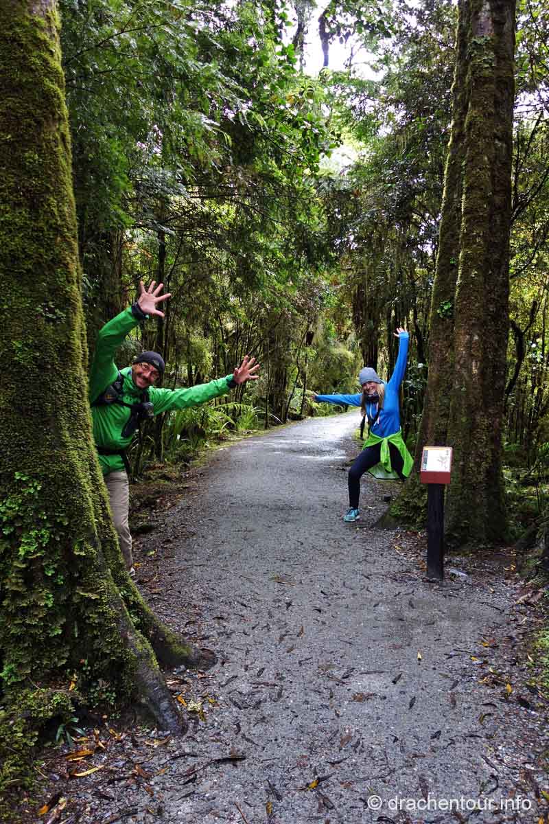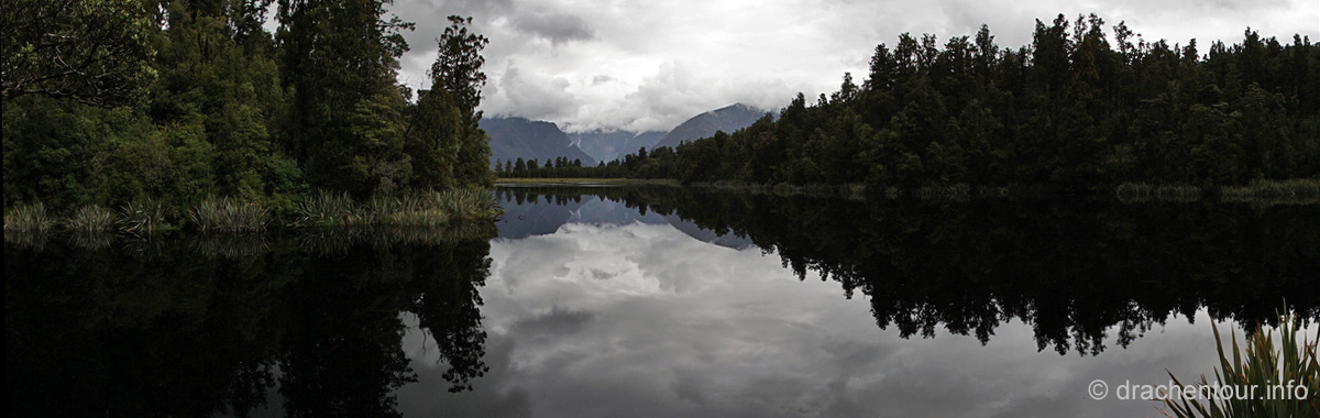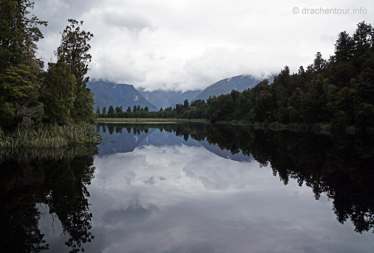Am nächsten Morgen fuhren wir zum Örtchen Fox, das nach dem dortigen Gletscher benannt wurde. Es hatte wieder zu regnen begonnen und wir überlegten, ob es lohnend ist, zu dem bekannten Lake Matheson zu fahren, denn dieser erzeugt ein fantastisches Spiegelbild der beiden höchsten Berge Neuseelands, vorausgesetzt die Sicht ist gut, und genau das war ja heute leider nicht der Fall. Wie immer hegten wir trotzdem die Hoffnung, dass es vielleicht doch noch aufklaren könnte, so fuhren wir guter Dinge zu dem " Spiegel-See ". Es hatte aufgehört zu regnen - freu - so unternahmen wir einen 90-minütigen Spaziergang um den See. Der Weg, der wiedermal hervorragend gewartet war, führte uns durch einen phantastischen einheimischen Regenwald. Wir passierten verschiedene Aussichtsplattformen, auf denen man normalerweise das perfekte Foto vom Spiegelbild der Berge schießen kann. Wie man aus meinen Worten schon entnehmen kann, hatten wir keine Sicht auf die Bergriesen, denn sie hielten sich hinter dicken Regenwolken hartnäckig versteckt. Dennoch ist der See und die kleine Wanderung um ihn auch bei Regenwetter ein landschaftlicher Höhepunkt, so waren wir trotzdem happy noch hierher gefahren zu sein ( doch so einfach geben wir nicht auf ... lasst euch überraschen ! ) !