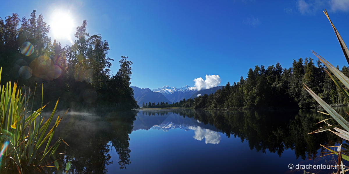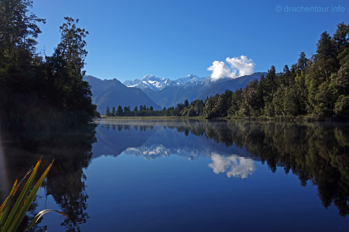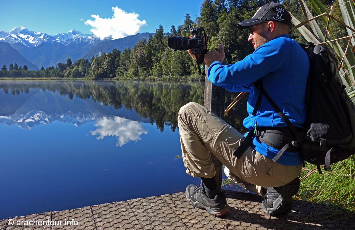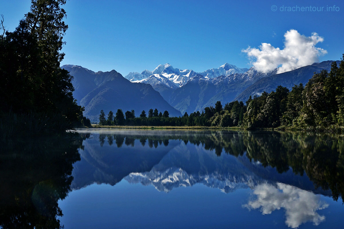 Und genau so sollte es auch bis Morgen bleiben, denn wir erwachten bei strahlend blauem Himmel und Sonnenschein :-), so beschlossen wir nochmals zum Lake Matheson zu fahren, denn diese phänomenal schöne Aussicht auf die Berge, die sich im dunklen und ruhigen Wasser widerspiegeln soll, wollten wir uns auf keinen Fall entgehen lassen. Und das war eine hervorragende Entscheidung, denn das komplette Bergpanorama - allen voran der Mount Tasman und der Mount Cook - spiegelten sich perfekt in dem dunklen Wasser des Sees wider - grandios im Quadrat !