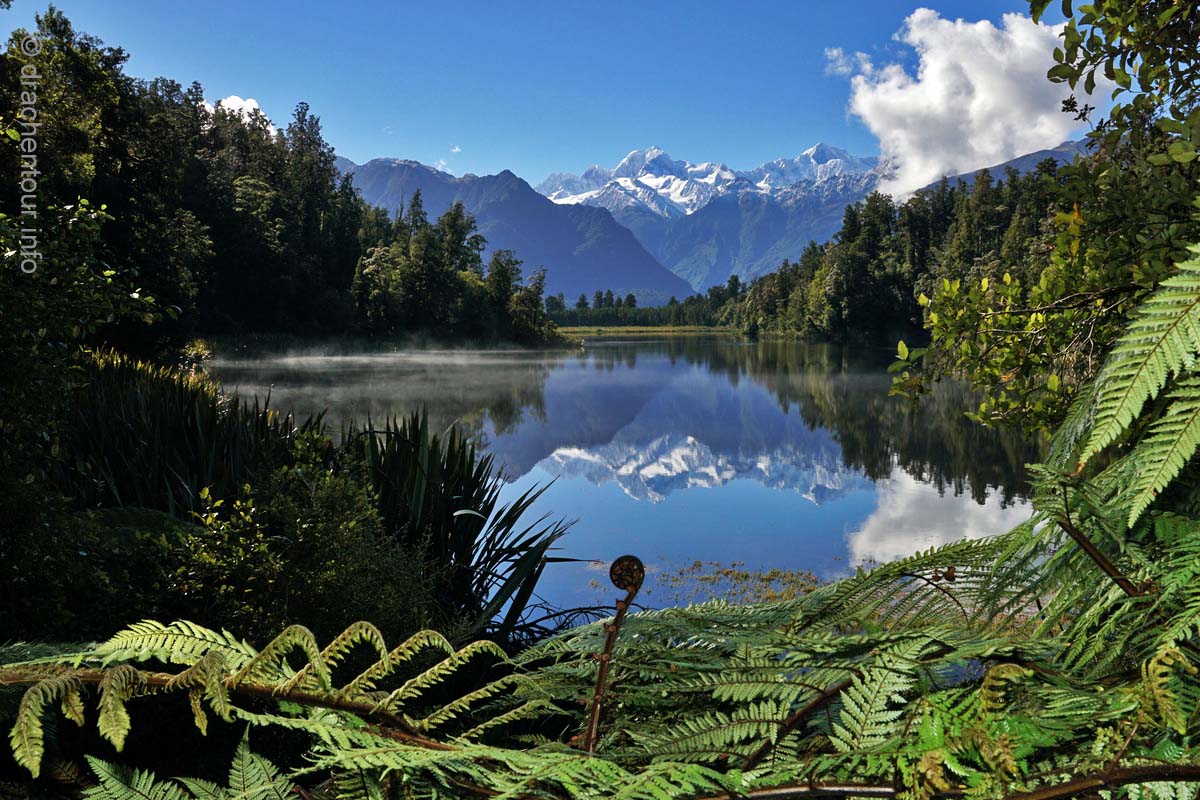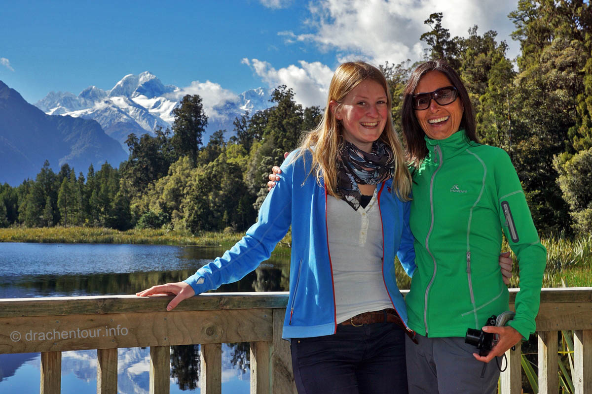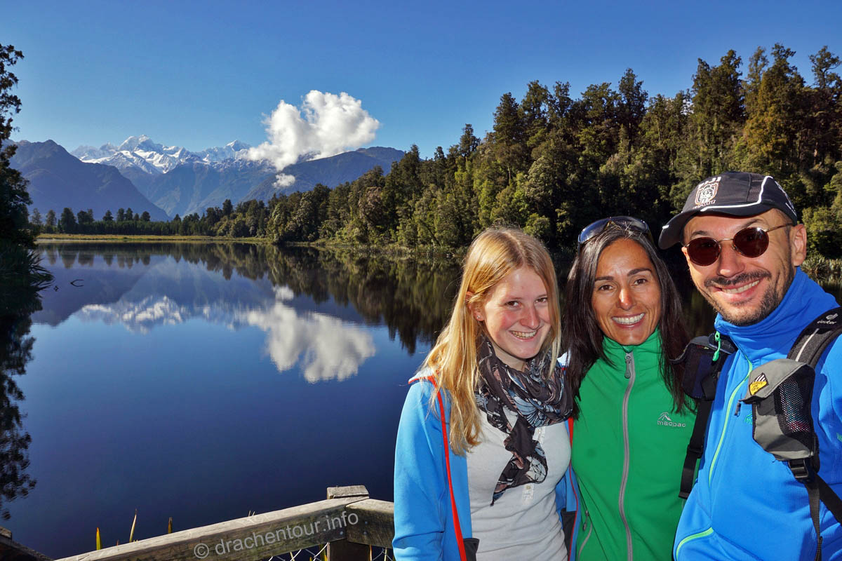 Und genau so sollte es auch bis Morgen bleiben, denn wir erwachten bei strahlend blauem Himmel und Sonnenschein :-), so beschlossen wir nochmals zum Lake Matheson zu fahren, denn diese phänomenal schöne Aussicht auf die Berge, die sich im dunklen und ruhigen Wasser widerspiegeln soll, wollten wir uns auf keinen Fall entgehen lassen. Und das war eine hervorragende Entscheidung, denn das komplette Bergpanorama - allen voran der Mount Tasman und der Mount Cook - spiegelten sich perfekt in dem dunklen Wasser des Sees wider - grandios im Quadrat !