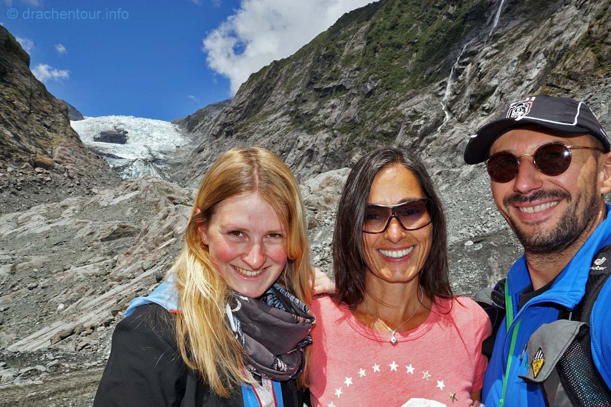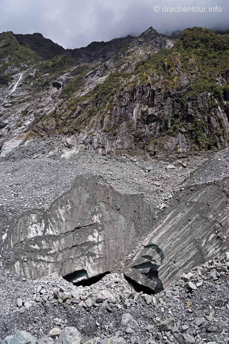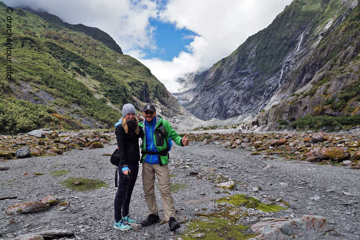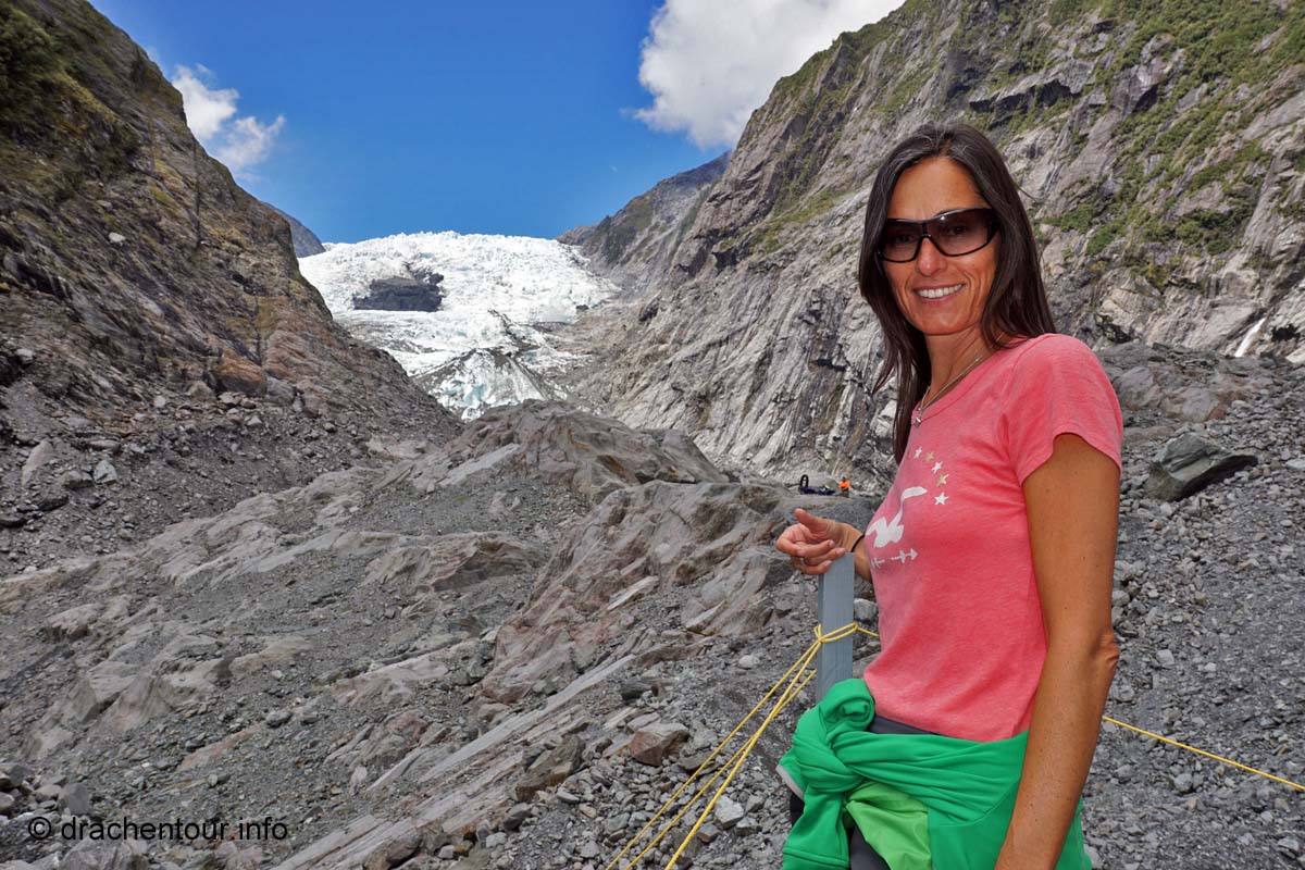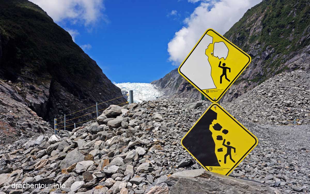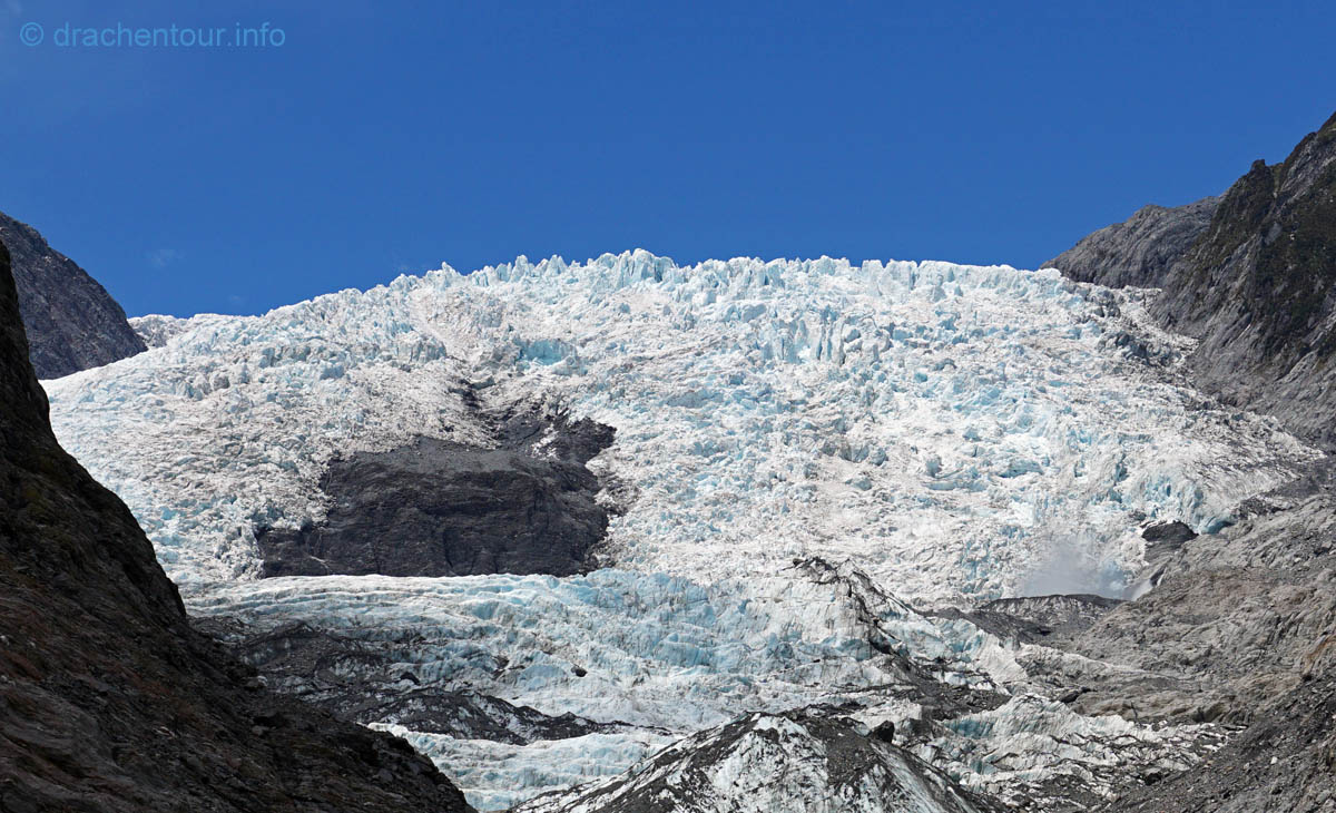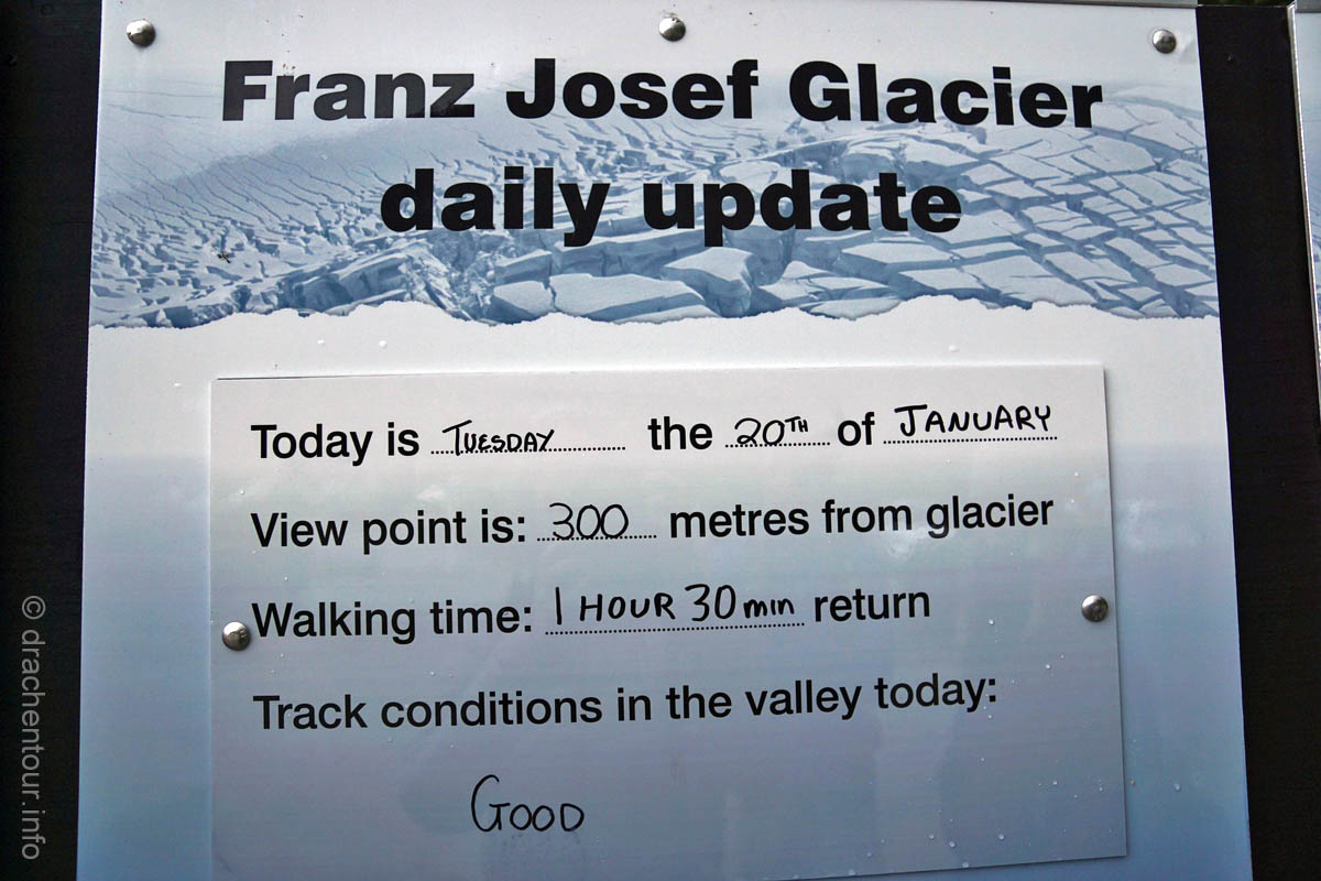 Voll von Glücksgefühlen fuhren wir - nein schwebten wir zum dritten Mal beschwingt über den Pass zurück nach Franz Josef zu einem der bekanntesten Gletscher in Neuseeland. Das Besondere an diesem Gletscher ist, dass er auf bis zu ca. 400 Meter über den Meeresspiegel herunter reicht. Kurios, denn oben in den Bergen wird er von Eis gespeist und an seinem unteren Ende ist er umgeben von Regenwald. So machten wir uns gleich auf, diese einzigartige Kuriosität aus der Nähe zu bewundern. Mal wieder haben die Kiwis alles bestens organisiert und es gibt dort einen tollen 3 km langen Weg entlang eines trockenen Flussbetts bis fast zum Ende des Gletschers und mal wieder begann es leicht zu tröpfeln - nein nicht schon wieder ! Mit jedem Schritt, den wir den Eismassen näher kamen, rückten die Wolken beiseite und uns eröffnete sich langsam ein fantastischer Blick auf den gesamten Gletscher. Als wir bei der Aussichtsplattform ankamen, zeigte er sich ganz frei von Wolken majestätisch unter einem strahlend blauen Himmel, sehr beeindruckend, wie er so schwerelos am Berg klebt ! Das bläulich gefärbte Eis erstrahlte förmlich in einem schönen hellblau, klar denn in Neuseeland gibt es nichts, was das Eis verschmutzen könnte und die Sonne trug auch ihren Beitrag dazu bei. Die Luft ist klar und sauber und das Wasser, das von den Eiswänden tropft ist rein. Seit 1999 schrumpft der Gletscher und verliert an Masse, dieser Rückgang war in den Jahren 1982 bis 1998 kurz unterbrochen, dennoch wird er - wie weltweit die meisten Gletscher - kleiner. Diese und weitere sehr gute Informationen konnte man den aufgestellten Tafeln entnehmen, man kann lernen, dass sich der gefallene Schnee verdichtet und Teil des blauen Eises wird, das hunderte von Metern tief ist. Der Druck am Boden führt dazu, dass etwas Eis am Grund schmilzt auf dessen Schmelzschicht gleitet der Gletscher dann ins Tal. So wurden wir noch im Handumdrehen zu Gletscherexperten :-).