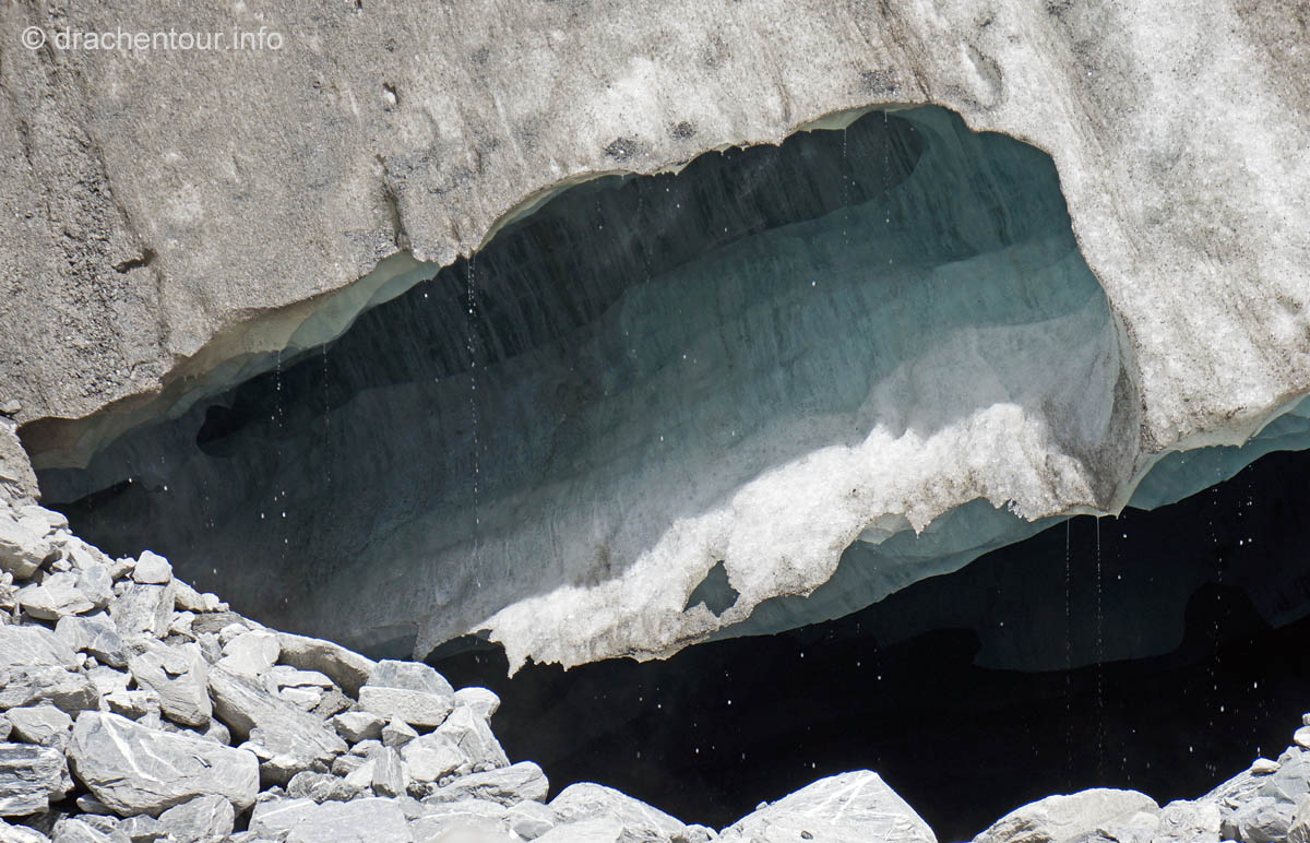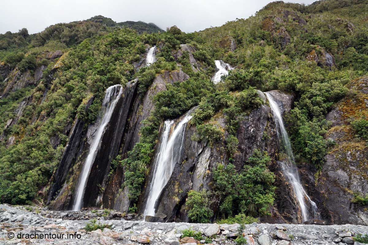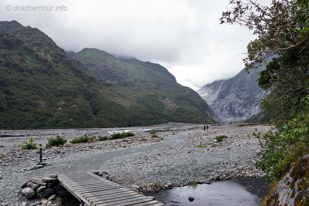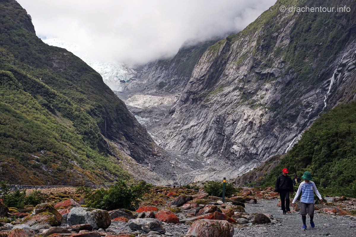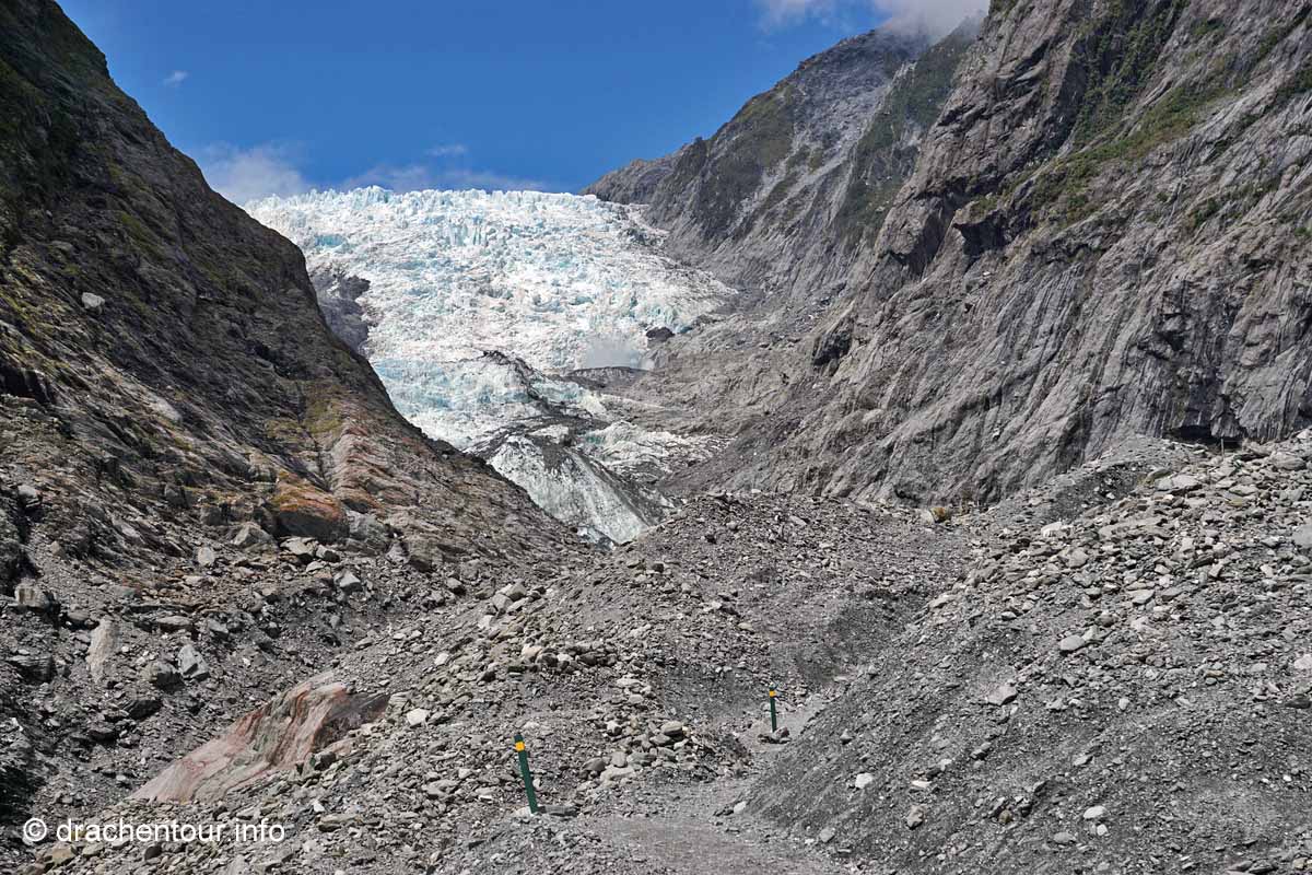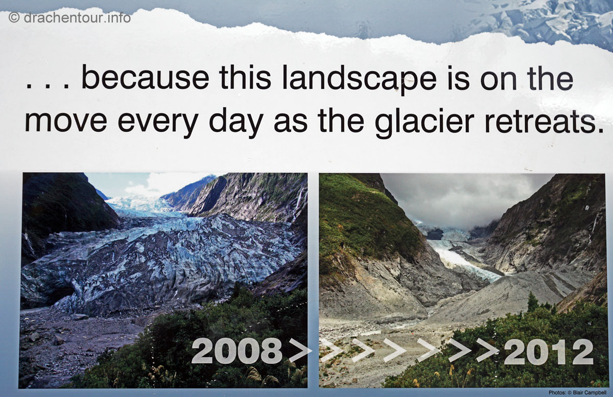 Voll von Glücksgefühlen fuhren wir - nein schwebten wir zum dritten Mal beschwingt über den Pass zurück nach Franz Josef zu einem der bekanntesten Gletscher in Neuseeland. Das Besondere an diesem Gletscher ist, dass er auf bis zu ca. 400 Meter über den Meeresspiegel herunter reicht. Kurios, denn oben in den Bergen wird er von Eis gespeist und an seinem unteren Ende ist er umgeben von Regenwald. So machten wir uns gleich auf, diese einzigartige Kuriosität aus der Nähe zu bewundern. Mal wieder haben die Kiwis alles bestens organisiert und es gibt dort einen tollen 3 km langen Weg entlang eines trockenen Flussbetts bis fast zum Ende des Gletschers und mal wieder begann es leicht zu tröpfeln - nein nicht schon wieder ! Mit jedem Schritt, den wir den Eismassen näher kamen, rückten die Wolken beiseite und uns eröffnete sich langsam ein fantastischer Blick auf den gesamten Gletscher. Als wir bei der Aussichtsplattform ankamen, zeigte er sich ganz frei von Wolken majestätisch unter einem strahlend blauen Himmel, sehr beeindruckend, wie er so schwerelos am Berg klebt ! Das bläulich gefärbte Eis erstrahlte förmlich in einem schönen hellblau, klar denn in Neuseeland gibt es nichts, was das Eis verschmutzen könnte und die Sonne trug auch ihren Beitrag dazu bei. Die Luft ist klar und sauber und das Wasser, das von den Eiswänden tropft ist rein. Seit 1999 schrumpft der Gletscher und verliert an Masse, dieser Rückgang war in den Jahren 1982 bis 1998 kurz unterbrochen, dennoch wird er - wie weltweit die meisten Gletscher - kleiner. Diese und weitere sehr gute Informationen konnte man den aufgestellten Tafeln entnehmen, man kann lernen, dass sich der gefallene Schnee verdichtet und Teil des blauen Eises wird, das hunderte von Metern tief ist. Der Druck am Boden führt dazu, dass etwas Eis am Grund schmilzt auf dessen Schmelzschicht gleitet der Gletscher dann ins Tal. So wurden wir noch im Handumdrehen zu Gletscherexperten :-).