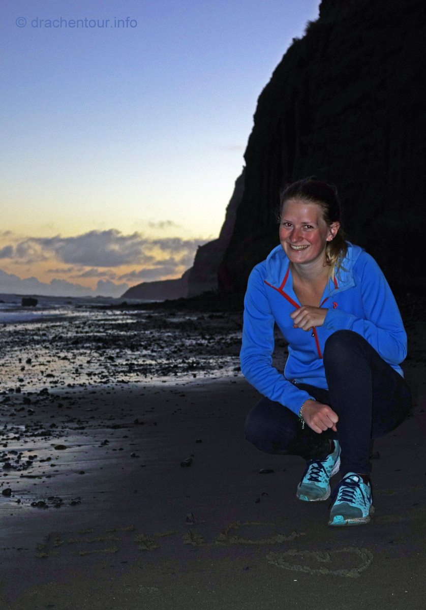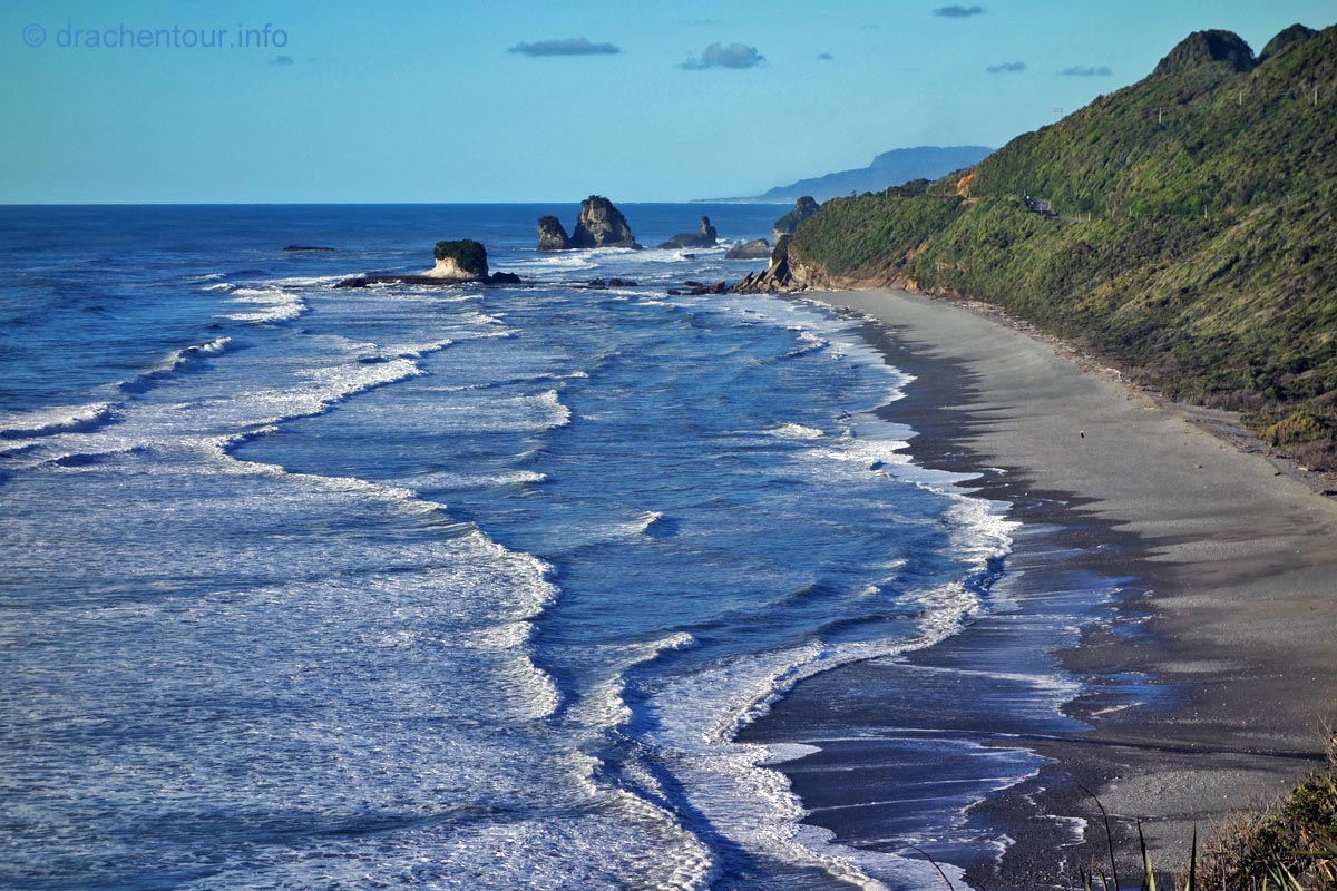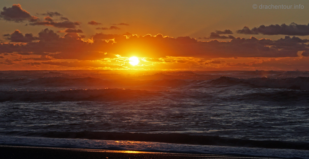 Nach diesem wahnsinntollen Tag, bei dem ein Highlight das nächste jagte, war es kein Problem noch einige Stunden mit unserer Juicy zu unserem nächsten Ziel zu fahren. Auf dem Weg in den Nationalpark Paparoa legten wir noch einen Stopp in Hokitita ein, ein Örtchen, dass im Reiseführer als sehr besuchenswert beschrieben wird, wir es aber als total langweilig empfanden. Das einzig Gute an "Hoki" war das Post Office , denn dort konnte Marek überglücklich seine geliebte Daunenjacke, die er in Christchurch im Hotel vergessen hatte, wieder in seine Arme schließen - auf die Neuseeländer ist eben Verlass :-). Rechtzeitig zum Sonnenuntergang erreichten wir dann unseren Campingplatz in Punakaiki direkt am Strand, dort saßen wir bei einem leckeren Gläschen Rotwein am wundervollen ewig langem Strand und beobachteten die kraftvollen Wellen und die Sonne, wie sie langsam vom Meer "verschluckt" wurde um Morgen wieder für uns zu erstrahlen.