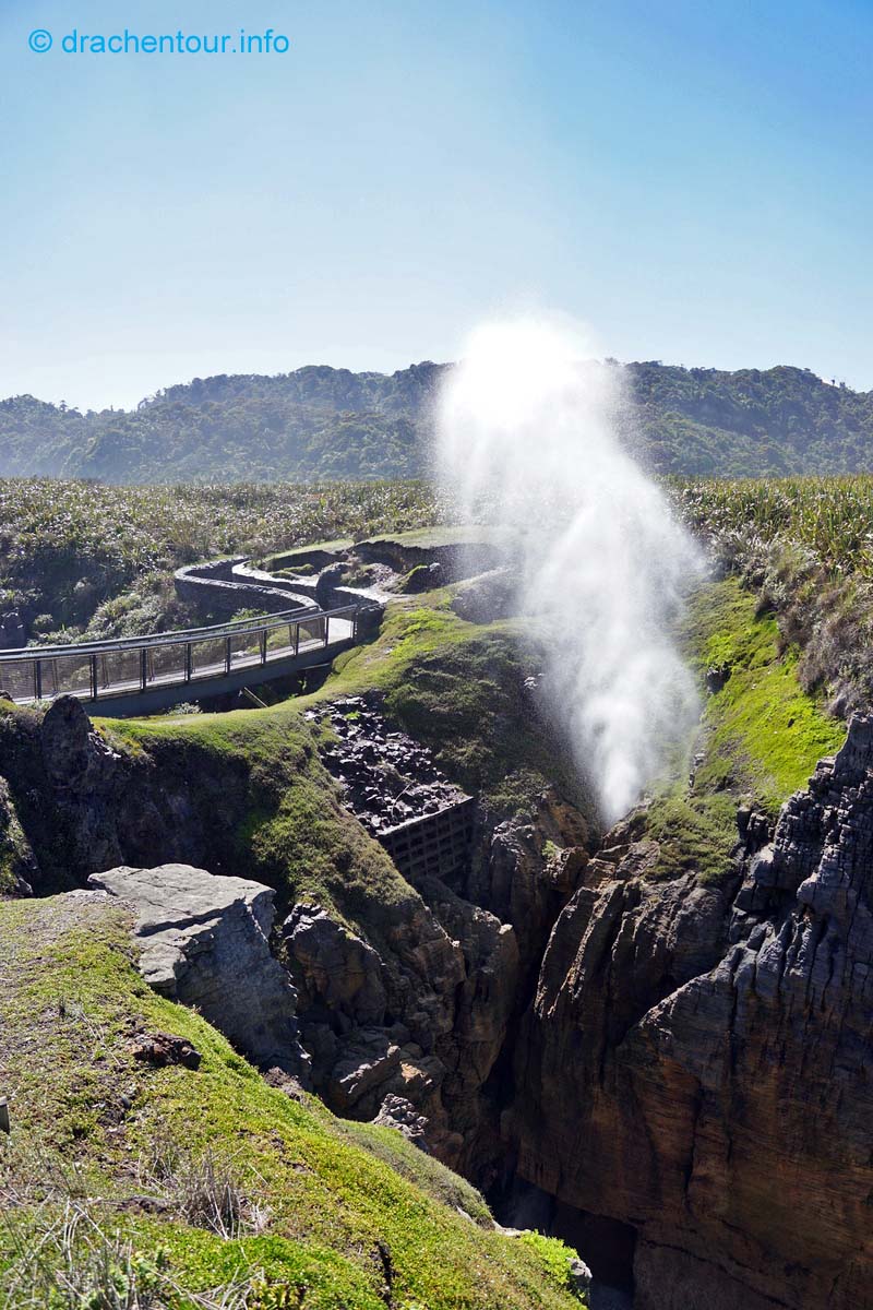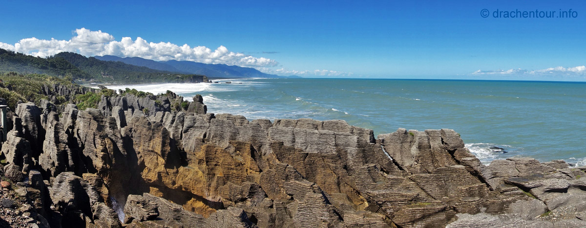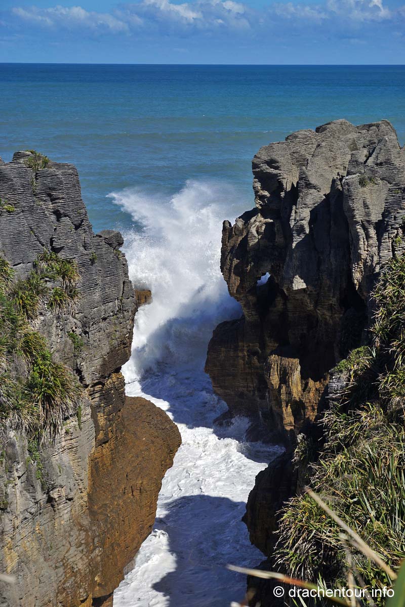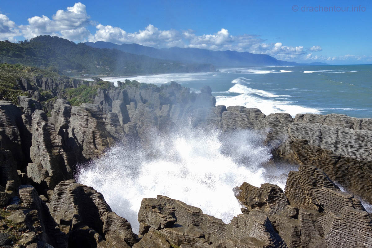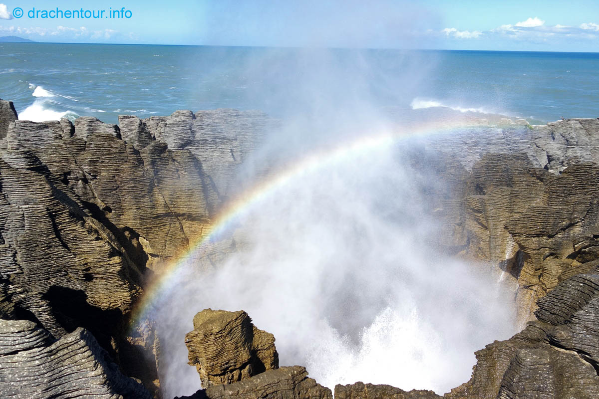 Gleich nach dem Frühstück machten wir uns auf die faszinierenden Pancake-Rocks, die einzigartig auf unserer Erde sind, einen Besuch abzustatten. Sie sind eine sehr besondere Felsformation im Paparoa Nationalpark im Norden der Westküste Neuseelands. Diese Felsen sehen aus, wie übereinander geschichtete Pfannkuchen, so hätte sich dann auch die Namensgebung erklärt :-). Ihre Entstehung führt über 30 Millionen von Jahren in die Vergangenheit zurück: Kalksedimente und Tonmineralien lagerten sich in Schichten am Meeresboden ab. Durch eine spätere stattfindende Landhebung wurden sie an die Oberfläche gehoben. Dann waren sie Kräften, wie Wind, Wellen und Regen ausgesetzt und die Abtragung konnte ihr Werk unterschiedlich rasch vollbringen. Dieses geologische Phänomen erkundeten wir auf einem kleinen Rundweg. Zunächst führte der Weg durch eine üppige Vegetation, die durch kleine Tafeln bestens erklärt wurde, dann auf einmal wird der Blick frei - frei auf das Meer und die Felsen, was für ein toller Anblick ! Das Wasser der Brandung bricht sich an zahlreichen Felsnasen, Ausspülungen und Höhlen. Die Wellen donnern förmlich durch diese Formationen um dann gewaltig - mit einem mortz Getöse - an ihnen zu brechen. Das zurückfließende Wasser und die durchströmende Luft wird von den Wellen durch die engen Löcher und Röhren gedrückt, was dann oberhalb der Felsen als Dampfsäule in die Höhe schießt. Das ganze Schauspiel wird von einem atemberaubenden Zischen begleitet. Fasziniert standen wir auf den Aussichtsplattformen und erfreuten uns an dem wunderschönen Schauspiel und kamen aus dem Staunen fast nicht mehr heraus, vor allem als sich auf einmal ein schöner Regenbogen zeigte - wie toll !!!