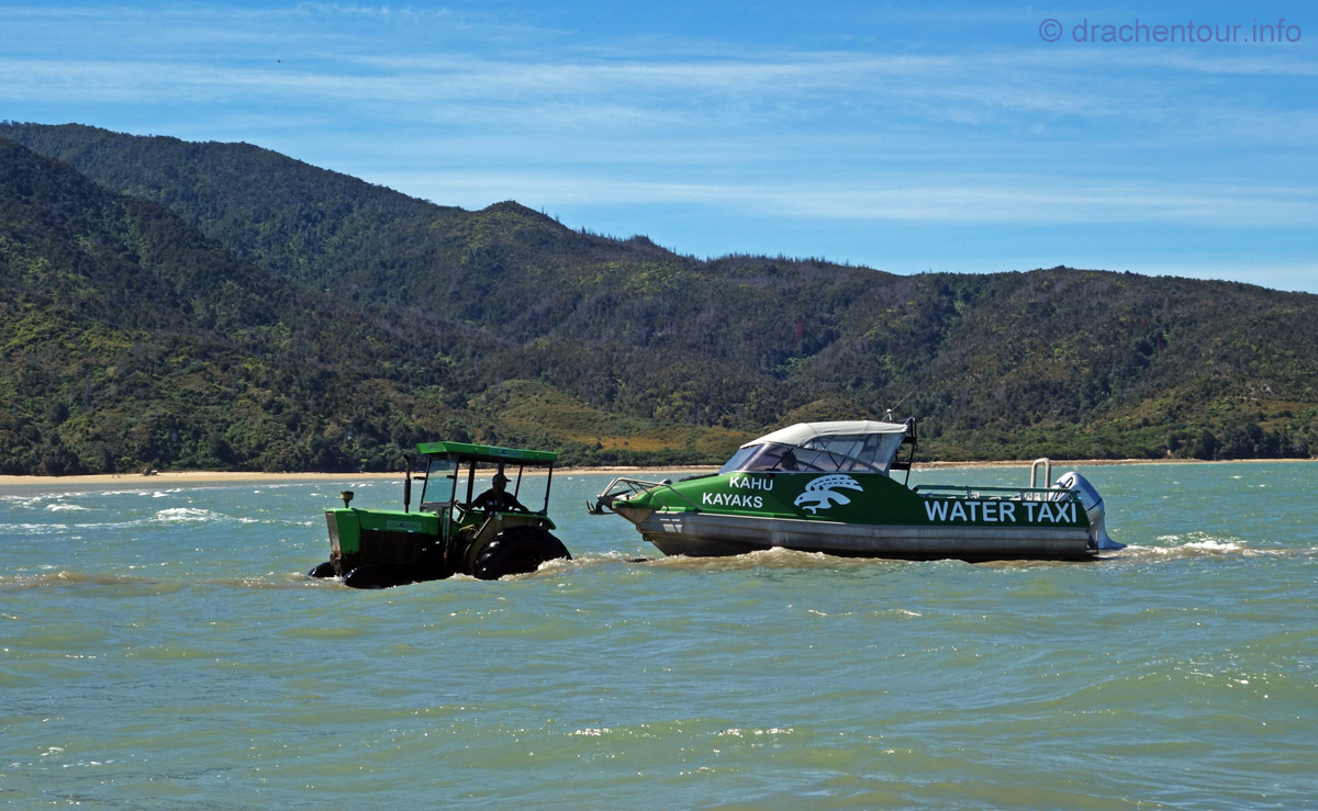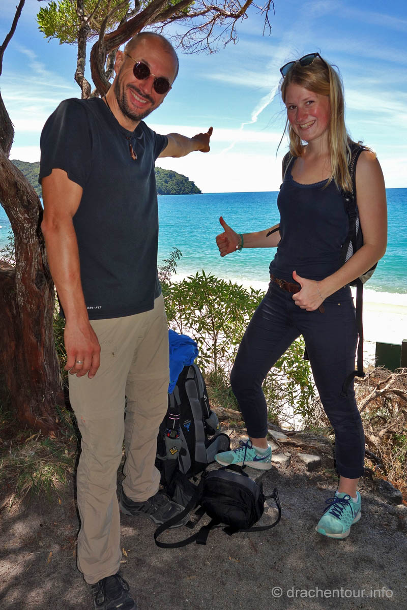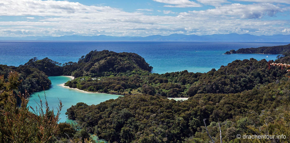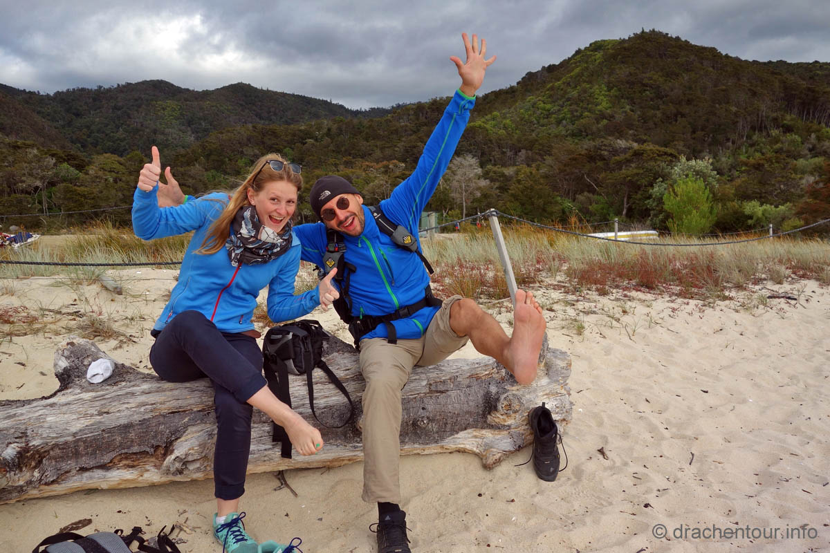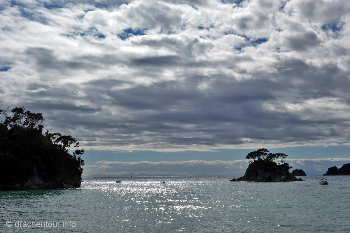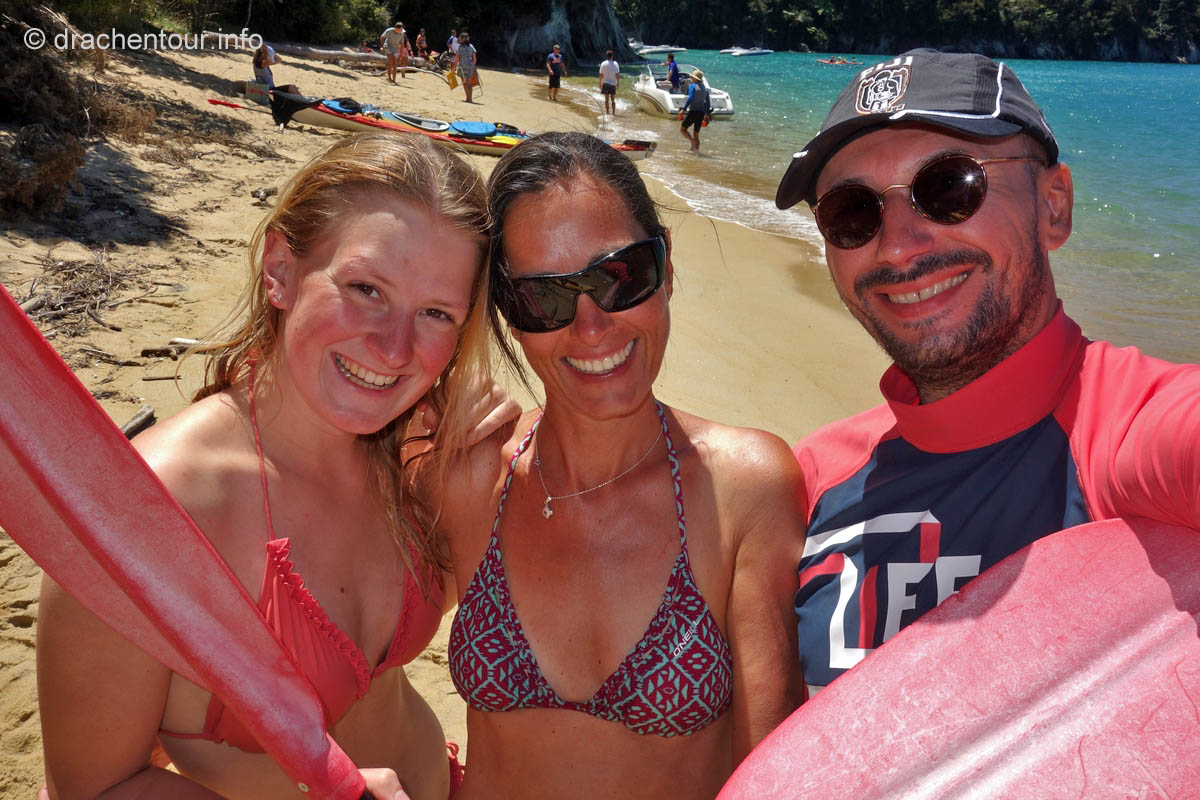 Zwei Tage haben wir eingeplant den Abel Tasman Nationalpark zu erleben und zu genießen. An unserem ersten Tag planten wir einen Teil des berühmten Abel Tasman Coast Tracks zu unternehmen. Dieser führt durch den gleichnamigen Nationalpark, so suchten wir uns einen besonders schönen Teil Wanderung in der Mitte des Tracks aus. Um zu unserem Startpunkt zu kommen nahmen wir das ausgeklügelte Transportsystem in Anspruch. Das war doch äußerst interessant, denn zunächst wurden wir mit einem Minibus wenige Kilometer zur Ablegestelle des Wassertaxis chauffiert, dann stiegen wir in ein Speedboot auf einem Anhänger um, dabei schauten wir schon etwas verwundert und verdutzt: wie kommen wir jetzt ins Wasser ! ? Ganz einfach: ein Traktor holte uns ab und schob das Boot mitsamt seinen Insassen ins tiefe Wasser - schon verrückt diese Kiwis !!! 30 Minuten fuhren wir oder besser schanzten wir in einem ordentlichen Tempo über die Wellen bis wir unser Ziel die Torrent Bay erreichten. Von dort ging es dann zu Fuß weiter und wir wanderten gut gelaunt an der exotischen Küste entlang. Dabei eröffneten sich uns wunderschöne Ausblicke über die traumhaft schön gelegenen Buchten und das satte türkisfarbene Wasser - gigantisch toll. So meisterten wir den ersten Abschnitt bis zur Bark Bay, ca.8 km in drei Stunden, spielend und suchten und fanden dort ein Plätzchen fast ohne Sandfliegen um unsere Mittagsvesper zu vernaschen ( unter anderem lecker Gingerkekse, nach denen Seli und Marek verrückt waren :-) ). Gut erholt waren wir bereit für den zweiten Teil der Etappe, d.h. nochmals ging es zwei Stunden ca. 6 km zum Endpunkt Onetahuti. Auch dieser Teil des Nationalparks war landschaftlich wieder ein absoluter Leckerbissen, die ständig eine neue atemberaubende Überraschung für uns bereit hielt. So zum Beispiel auch die tolle Hängebrücke, die über einen der zahlreich idyllischen Flüsse gespannt ist, diese Eindrücke ließen uns " Hobby-Fotografen " immer wieder zur Höchstform auflaufen. In Onetahuti warteten wir auf unser Wassertaxi, dass uns wieder zurück nach Marahau bringen sollte. Da wir noch ein wenig Zeit hatten, verbrachten wir diese mit Sonnenbaden und im Sand rumliegen - auch mal schön nach der langen Wanderung. In Marahau an der Anlegestelle angekommen, wiederholte sich dasselbe Spiel wie am Morgen, nur eine Stufe krasser: unser Boot und wir wurden auf einen Anhänger verfrachtet, der wurde dann mit uns allen mit einem Traktor aus dem Wasser gezogen und genauso - wir sitzend im Boot vom Traktor gezogen - wurden wir auf der Straße zu unserem Campingplatz gefahren - ich verbessere mich: sehr verrückt diese Kiwis:-) ! Diesen schönen Tag rundeten wir mit einem lecker Abendessen und einigen Runden Kniffel gemütlich ab. Mit einem angenehmen Gefühl der Vorfreude gingen wir heute ins Bett, denn Morgen wollten wir den Nationalpark aus einer anderen Perspektive erobern !