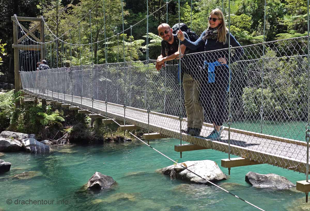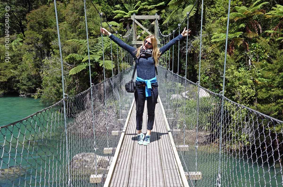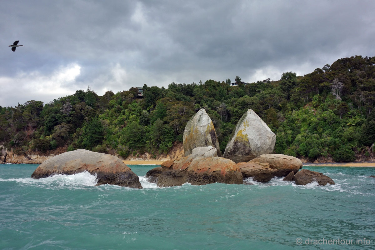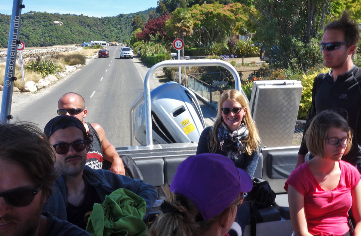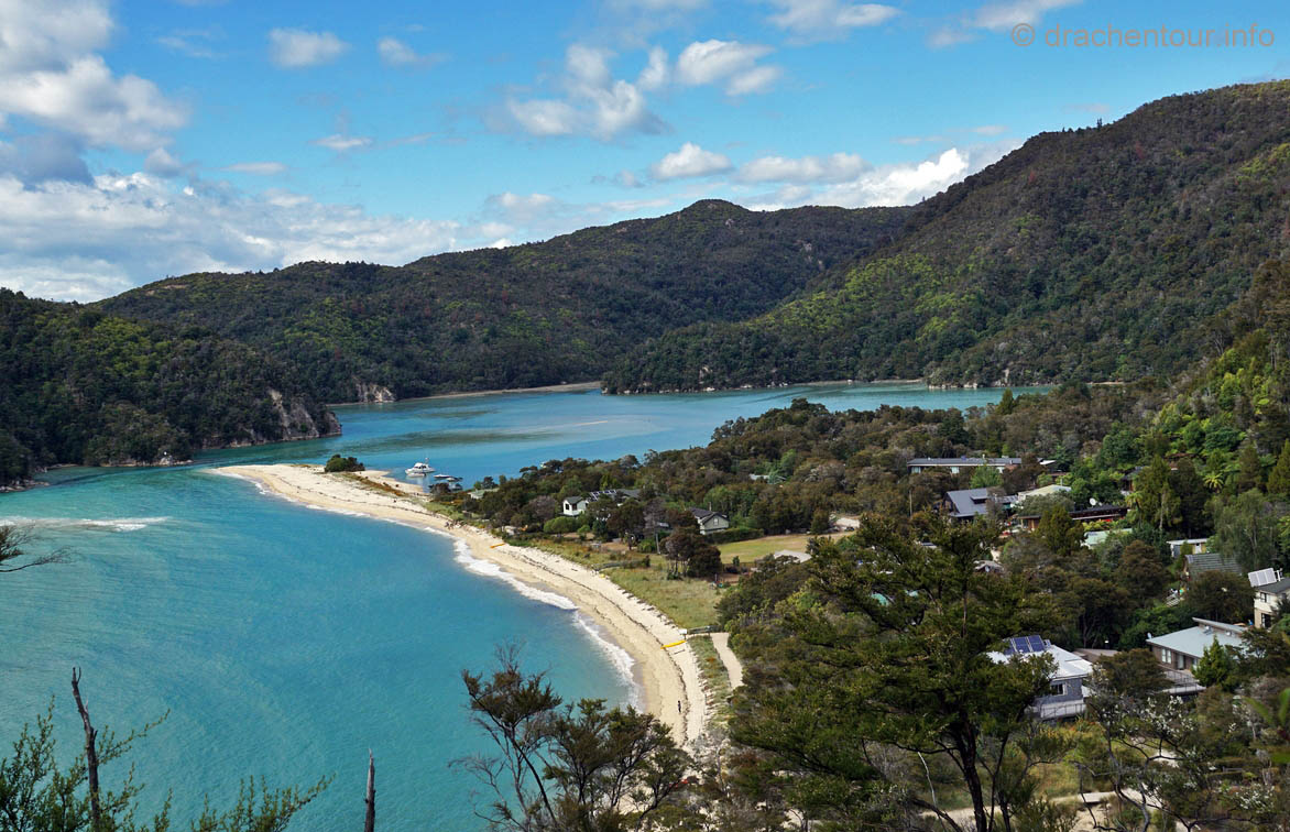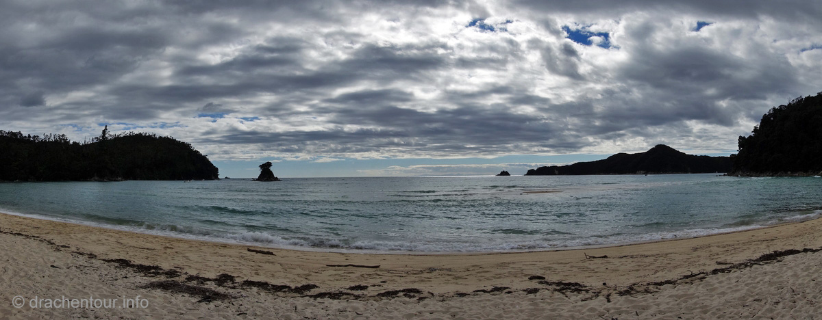Zwei Tage haben wir eingeplant den Abel Tasman Nationalpark zu erleben und zu genießen. An unserem ersten Tag planten wir einen Teil des berühmten Abel Tasman Coast Tracks zu unternehmen. Dieser führt durch den gleichnamigen Nationalpark, so suchten wir uns einen besonders schönen Teil Wanderung in der Mitte des Tracks aus. Um zu unserem Startpunkt zu kommen nahmen wir das ausgeklügelte Transportsystem in Anspruch. Das war doch äußerst interessant, denn zunächst wurden wir mit einem Minibus wenige Kilometer zur Ablegestelle des Wassertaxis chauffiert, dann stiegen wir in ein Speedboot auf einem Anhänger um, dabei schauten wir schon etwas verwundert und verdutzt: wie kommen wir jetzt ins Wasser ! ? Ganz einfach: ein Traktor holte uns ab und schob das Boot mitsamt seinen Insassen ins tiefe Wasser - schon verrückt diese Kiwis !!! 30 Minuten fuhren wir oder besser schanzten wir in einem ordentlichen Tempo über die Wellen bis wir unser Ziel die Torrent Bay erreichten. Von dort ging es dann zu Fuß weiter und wir wanderten gut gelaunt an der exotischen Küste entlang. Dabei eröffneten sich uns wunderschöne Ausblicke über die traumhaft schön gelegenen Buchten und das satte türkisfarbene Wasser - gigantisch toll. So meisterten wir den ersten Abschnitt bis zur Bark Bay, ca.8 km in drei Stunden, spielend und suchten und fanden dort ein Plätzchen fast ohne Sandfliegen um unsere Mittagsvesper zu vernaschen ( unter anderem lecker Gingerkekse, nach denen Seli und Marek verrückt waren :-) ). Gut erholt waren wir bereit für den zweiten Teil der Etappe, d.h. nochmals ging es zwei Stunden ca. 6 km zum Endpunkt Onetahuti. Auch dieser Teil des Nationalparks war landschaftlich wieder ein absoluter Leckerbissen, die ständig eine neue atemberaubende Überraschung für uns bereit hielt. So zum Beispiel auch die tolle Hängebrücke, die über einen der zahlreich idyllischen Flüsse gespannt ist, diese Eindrücke ließen uns " Hobby-Fotografen " immer wieder zur Höchstform auflaufen. In Onetahuti warteten wir auf unser Wassertaxi, dass uns wieder zurück nach Marahau bringen sollte. Da wir noch ein wenig Zeit hatten, verbrachten wir diese mit Sonnenbaden und im Sand rumliegen - auch mal schön nach der langen Wanderung. In Marahau an der Anlegestelle angekommen, wiederholte sich dasselbe Spiel wie am Morgen, nur eine Stufe krasser: unser Boot und wir wurden auf einen Anhänger verfrachtet, der wurde dann mit uns allen mit einem Traktor aus dem Wasser gezogen und genauso - wir sitzend im Boot vom Traktor gezogen - wurden wir auf der Straße zu unserem Campingplatz gefahren - ich verbessere mich: sehr verrückt diese Kiwis:-) ! Diesen schönen Tag rundeten wir mit einem lecker Abendessen und einigen Runden Kniffel gemütlich ab. Mit einem angenehmen Gefühl der Vorfreude gingen wir heute ins Bett, denn Morgen wollten wir den Nationalpark aus einer anderen Perspektive erobern !
