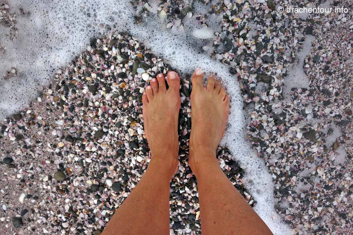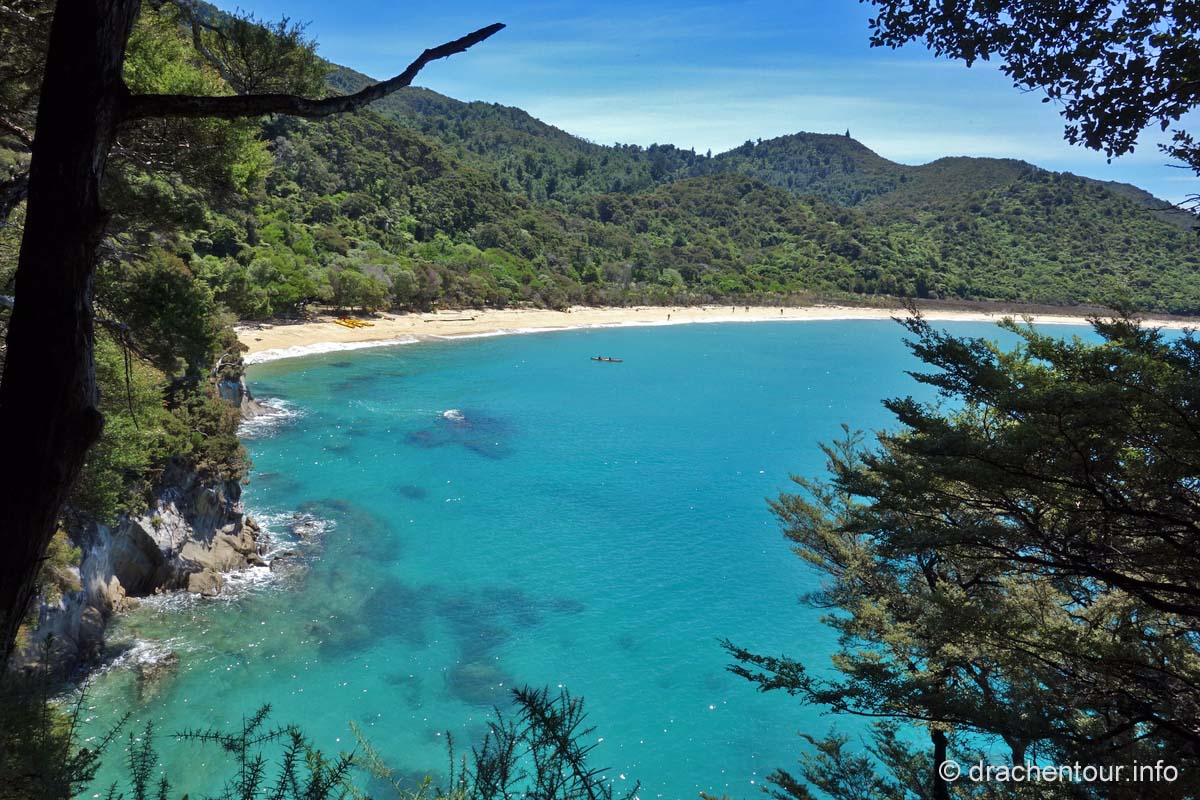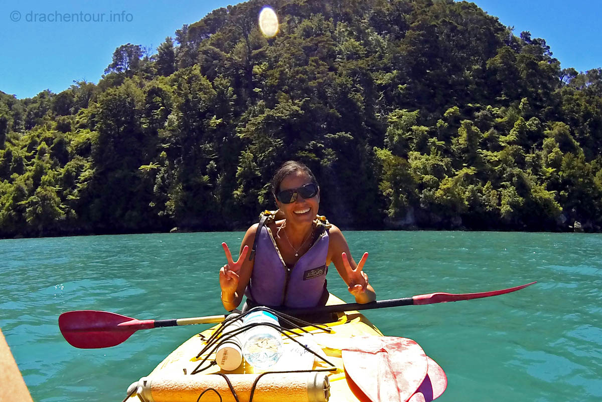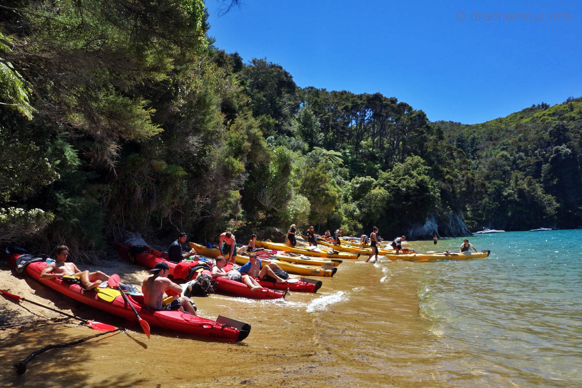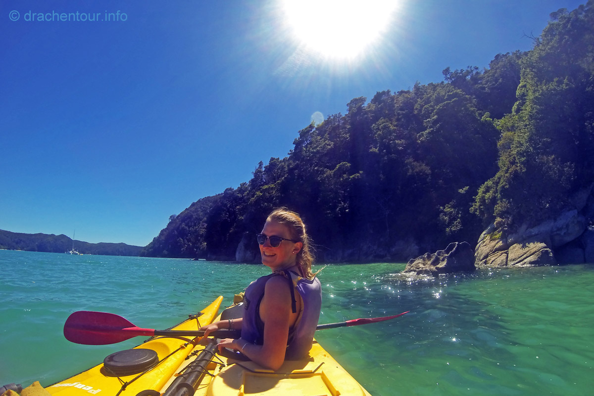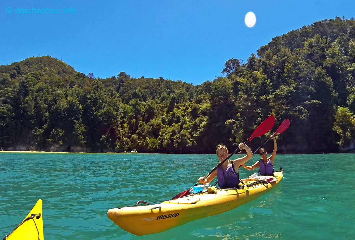 Unsere Arme waren mittlerweile auch ganz schön müde, so beschlossen wir eine Pause zu machen, also nichts wie rüber zu einem der goldenen Strände. Mit dieser Idee waren wir nicht alleine, denn wir teilten uns diesen wunderschönen Abschnitt noch mit einigen weiteren Kayakern. Fast zwei Stunden chillten wir so gemütlich am Strand, lagen gemütlich in der Sonne und wir sprangen sogar in das 18 Grad kalte Wasser - sehr erfrischend, fast zu erfrischend ! Ausgeruht und erholt paddelten wir dann entlang der Küste in Richtung Heimat, wobei wir die Schönheit des Nationalparks und die sanfte Ruhe des Paddelns genossen. Spitzenmäßigen Ausblicke auf die hübsch geschwungenen Buchten, die wie Halbmonde am türkisfarbenen Wasser lagen, versüßten uns die Anstrengung. Dennoch waren wir erleichtert, als wir unser Ziel endlich erreicht hatten, denn so eine extreme Muskelbeanspruchung - insgesamt haben wir ca. 12 km + etliche " Zickzack-Kilometer " bewältigt - waren unsere Arme eben einfach nicht gewöhnt. Wieder an unserem Campingplatz angekommen, belohnten wir uns mit einem leckeren Einkehrschwung und einigen Kniffelspielen. Wir waren sehr happy und dankbar einen so wunderbaren Tag erlebt haben zu dürfen - jipiii jeah !!!