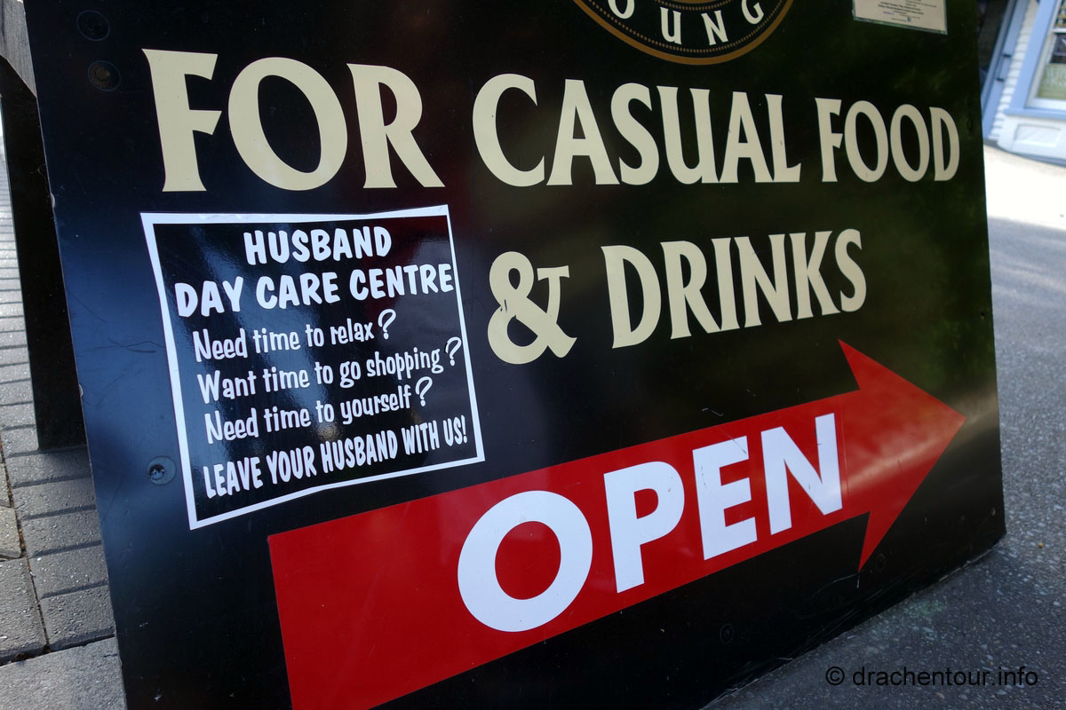 An den kommenden Tagen machten wir uns zu Fuß auf, die Stadt zu erkunden. Auf unserem Programm standen ein Besuch des Quake City Museum, indem der Verlauf der Erdbeben, ihre Entstehung und seine Folgen auf die Stadt und Bevölkerung sehr gut dargestellt wird. Am beeindruckendsten waren die Videoaufnahmen von Personen, die ihre Erfahrungen am Tag des Erdbebens sehr emotional schildernden - wir waren berührt und betroffen ! Um uns kulturell auf Vordermann zu bringen besuchten wir auch noch das Canterbury Museum um einiges über die Geschichte Neuseelands (NZ) zu erfahren und die " Cupboard Church “, eine Kirche, die nur aus Pappe und Kartons besteht – beeindruckend ! Wie oben schon beschrieben sind die Einwohner Christchurchs sehr kreativ und sehr bemüht, das Beste aus der Situation zu machen. So muss auch die Idee mit der Werbung zum " Husband Day Care Center " entstanden sein - eine echt nette Geschichte ( siehe Bild unten ). Auch die herausstechende Freundlichkeit der Menschen habe ich bereits beschrieben, das kann ich allerdings nicht genug erwähnen. So viel Aufmerksamkeit, Freundlichkeit, Höflichkeit und Interesse sind mir selten entgegengebracht worden. Alle Fragen wurden uns geduldig beantwortet, offene und interessierte Menschen befragten uns, unterhielten sich mit uns und schenkten uns ihre Zeit, alles unhektisch und gemütlich. Auf der Straße wurde man sehr häufig mit einem Lächeln oder einem Hallo begrüßt und wenn wir mal planlos oder unschlüssig an einer Straßenecke standen, kam ein netter Mensch und bot seine Hilfe an - jawohl hier fühlen wir uns sehr wohl !